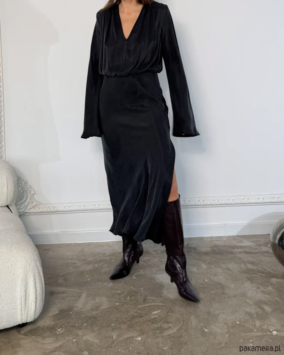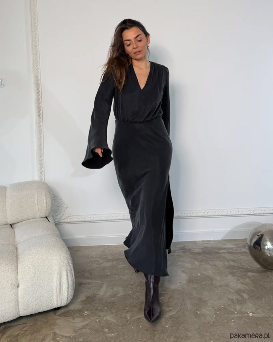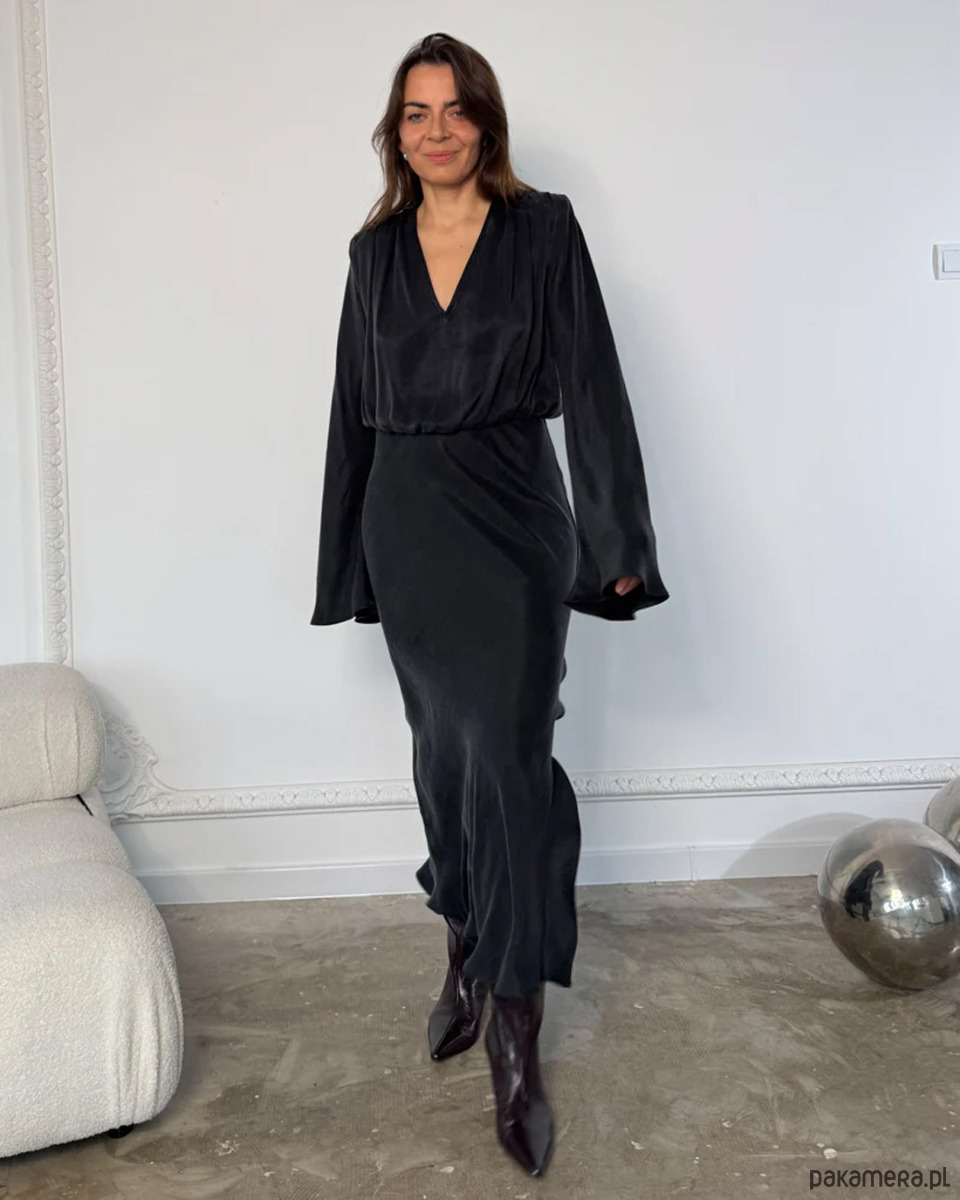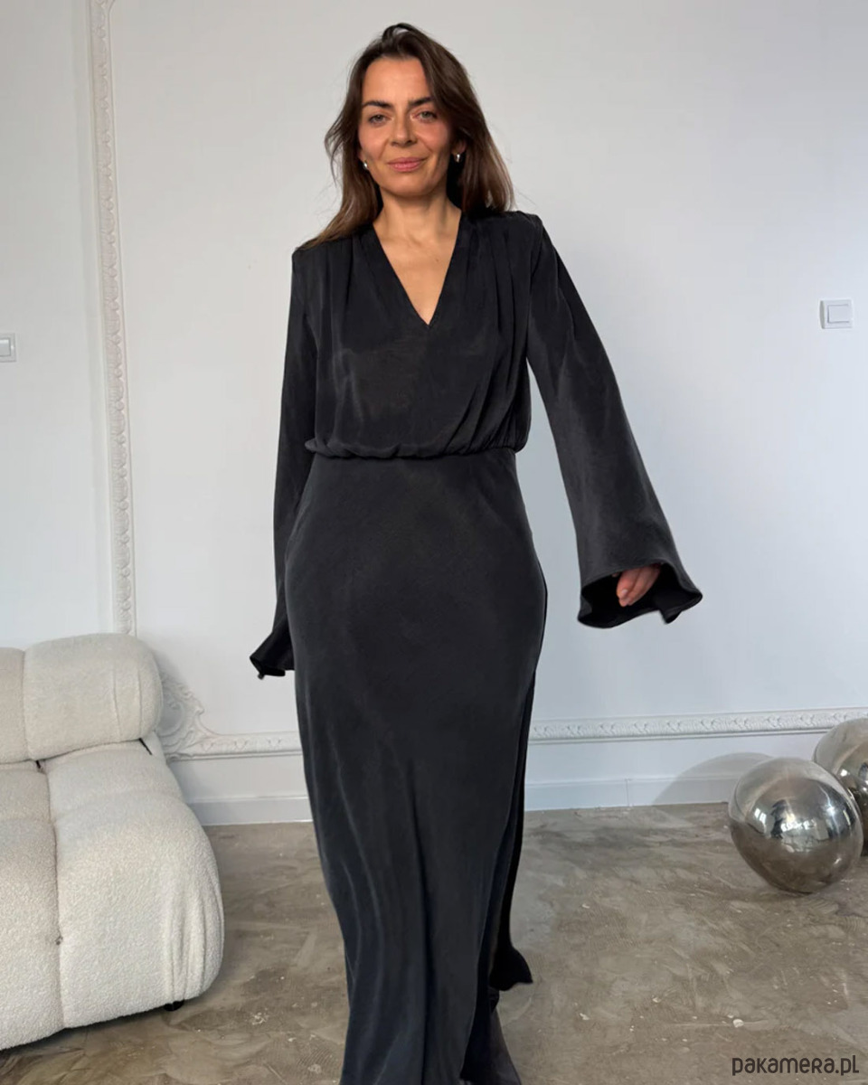 Elegancka, ponadczasowa czarna sukienka z gładkiej, lejącej tkaniny lyocell. Architektoniczny krój z odpinanymi poduszkami na ramionach, głębokim dekoltem V i dołem krojonym po skosie subtelnie podkreśla talię. Długie, eteryczne rękawy dodają lekkości. Idealna na wieczór, uroczystości i spotkania przez cały rok. Produkcja w Polsce.