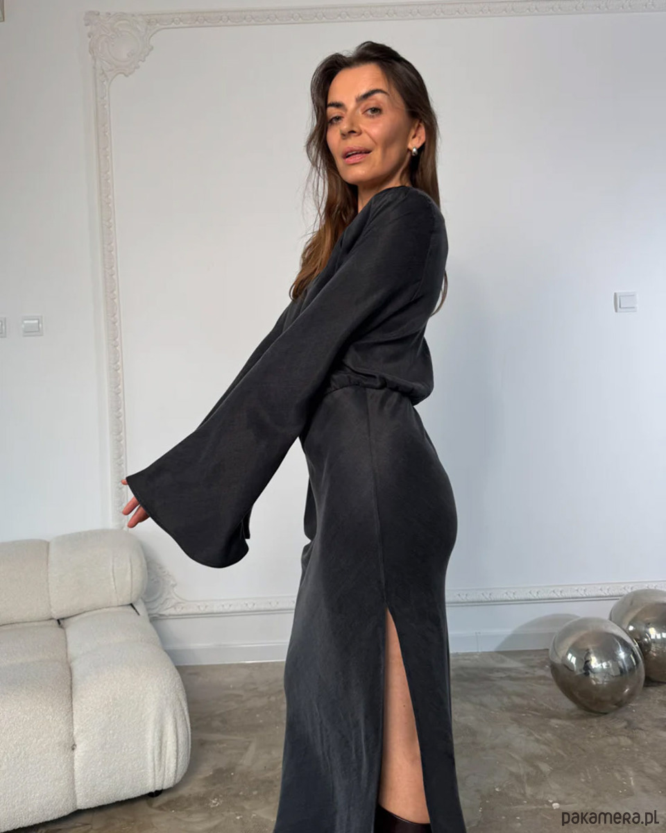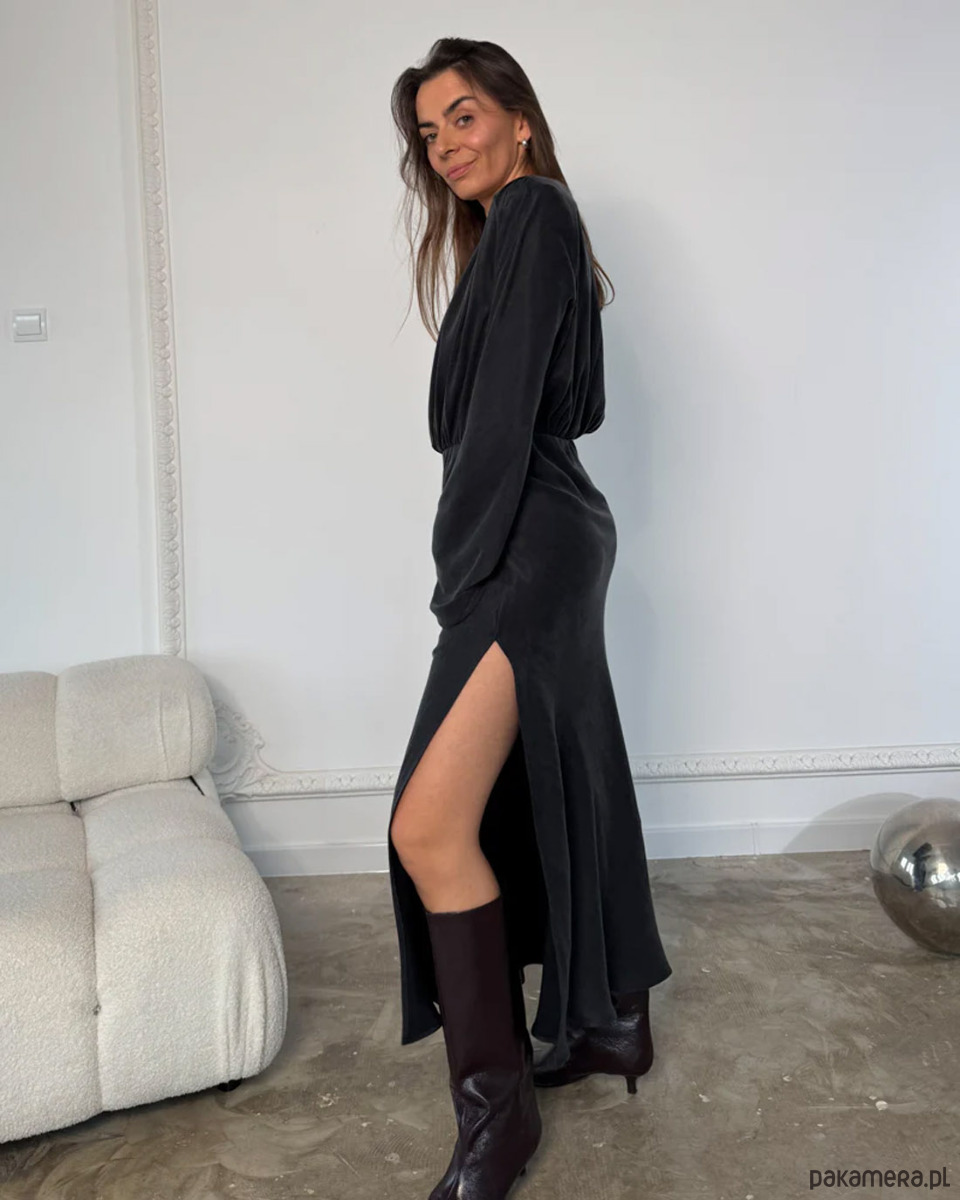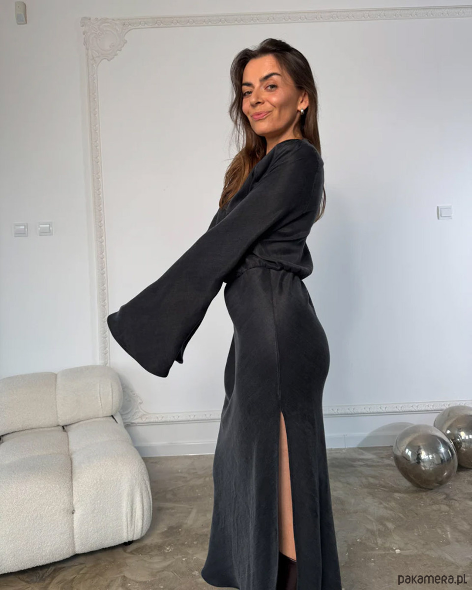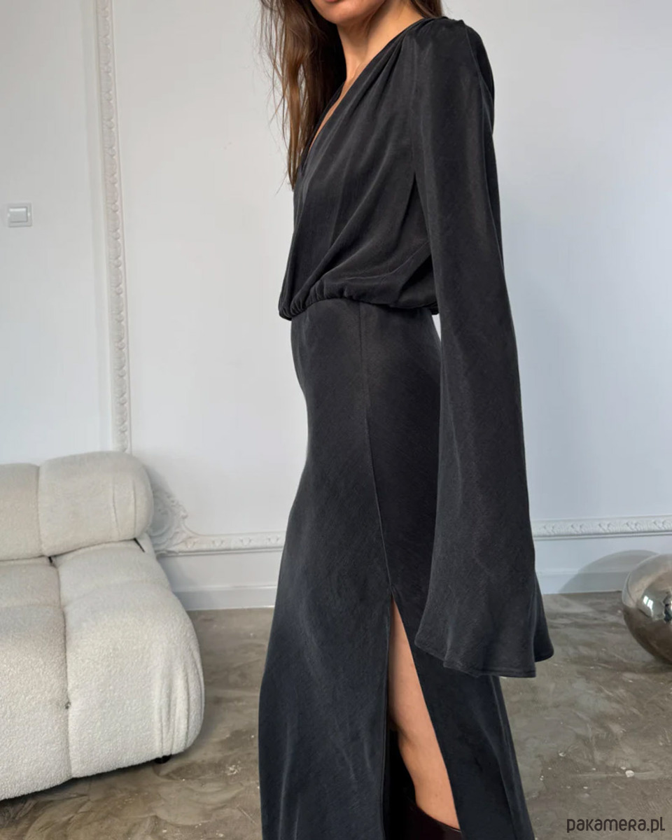 Elegancka, ponadczasowa czarna sukienka z gładkiej, lejącej tkaniny lyocell. Architektoniczny krój z odpinanymi poduszkami na ramionach, głębokim dekoltem V i dołem krojonym po skosie subtelnie podkreśla talię. Długie, eteryczne rękawy dodają lekkości. Idealna na wieczór, uroczystości i spotkania przez cały rok. Produkcja w Polsce.