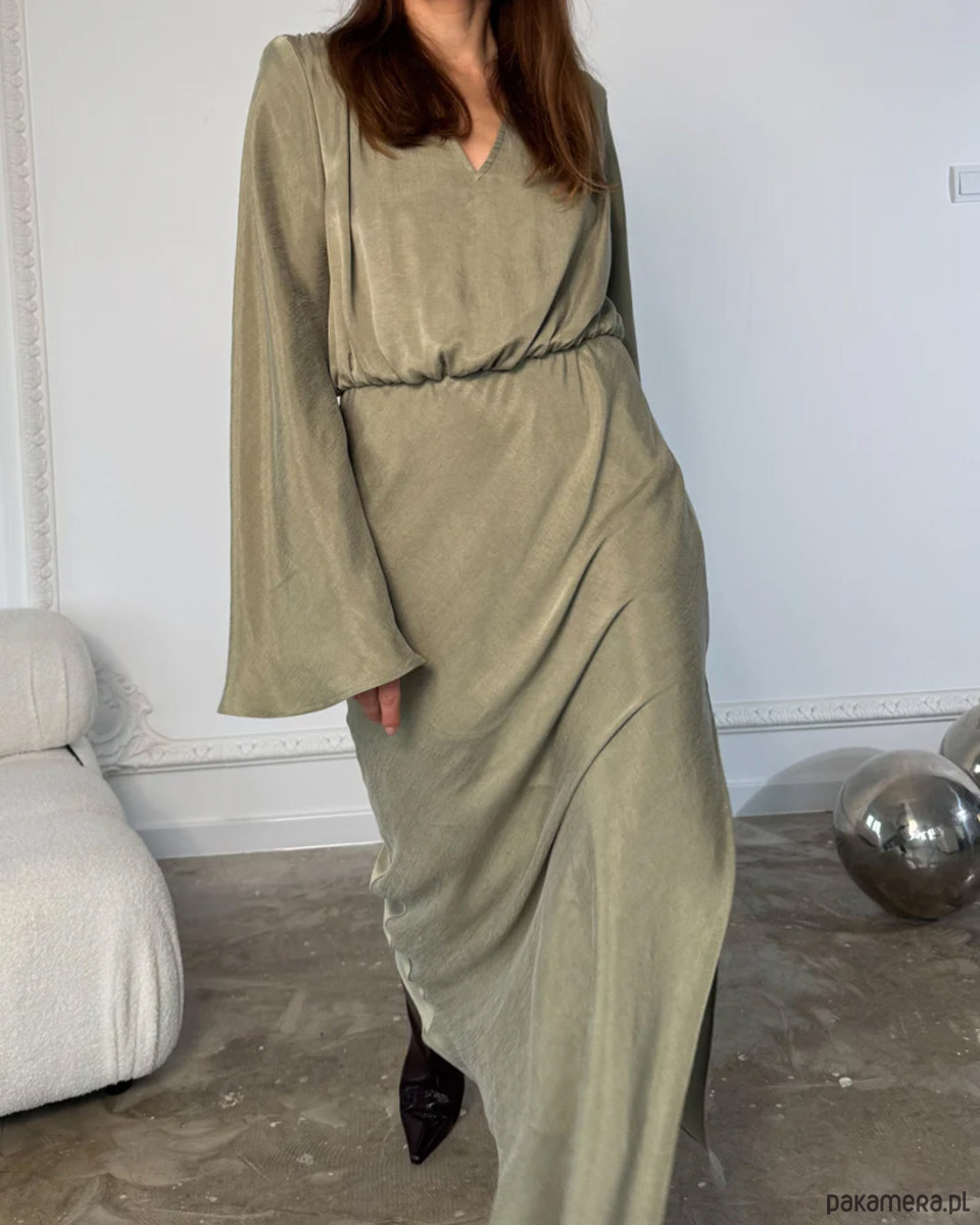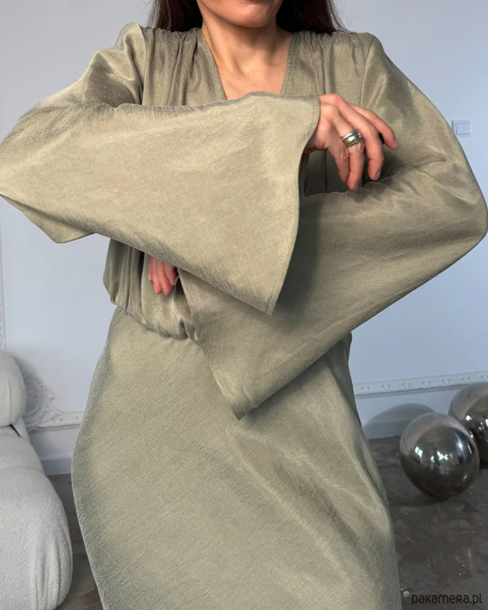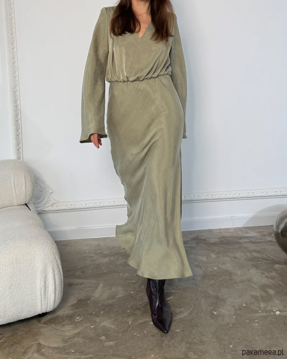 Elegancka, ponadczasowa sukienka Desire w kolorze Olive z gładkiego, lejącego lyocellu. Architektoniczny krój z odpinanymi poduszkami na ramionach, głębokim dekoltem V i dołem krojonym po skosie subtelnie podkreśla talię. Długie, eteryczne rękawy dodają lekkości. Idealna na wieczór, uroczystości i wyjątkowe okazje przez cały rok. Szyta w Polsce.