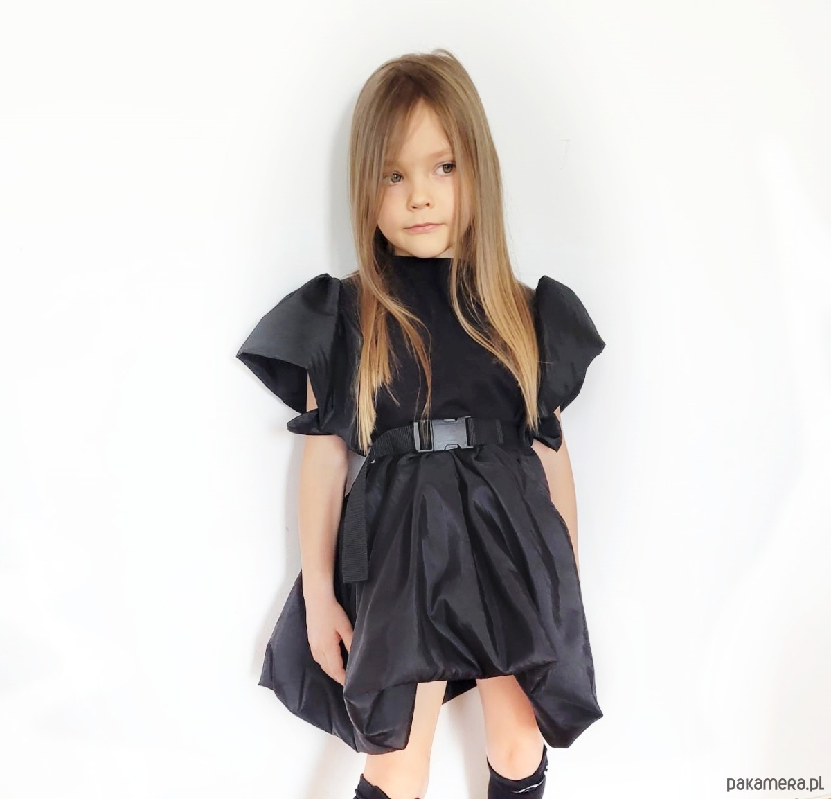 Urocza sukienka dziewczęca o kroju bombki, z paskiem, rękawki usztywnione i dół sukienki..