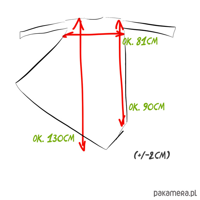 Jeden rozmiar, szer pod pachami. ok. 81cm, max. dł. ok. 130cm.