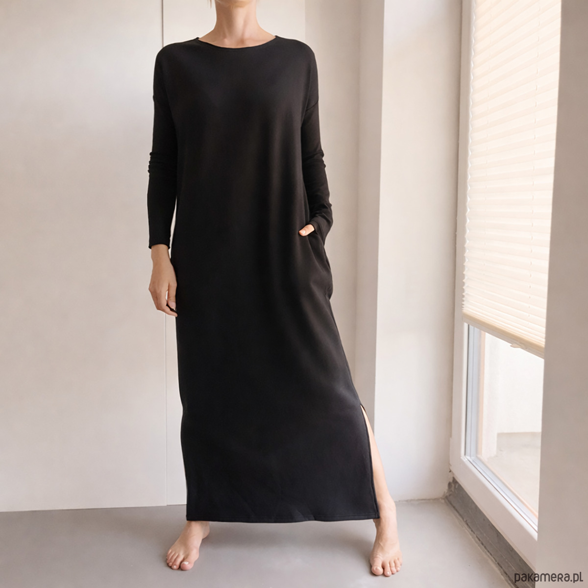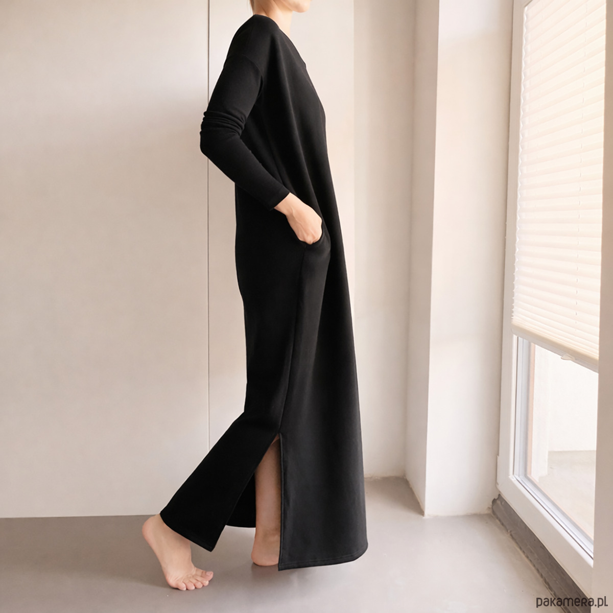 Forma jest prosta i nieprzekombinowana. Długość maxi i boczne rozporki nadają jej lekkości, a kieszenie są integralną częścią kroju, nie dodatkiem.