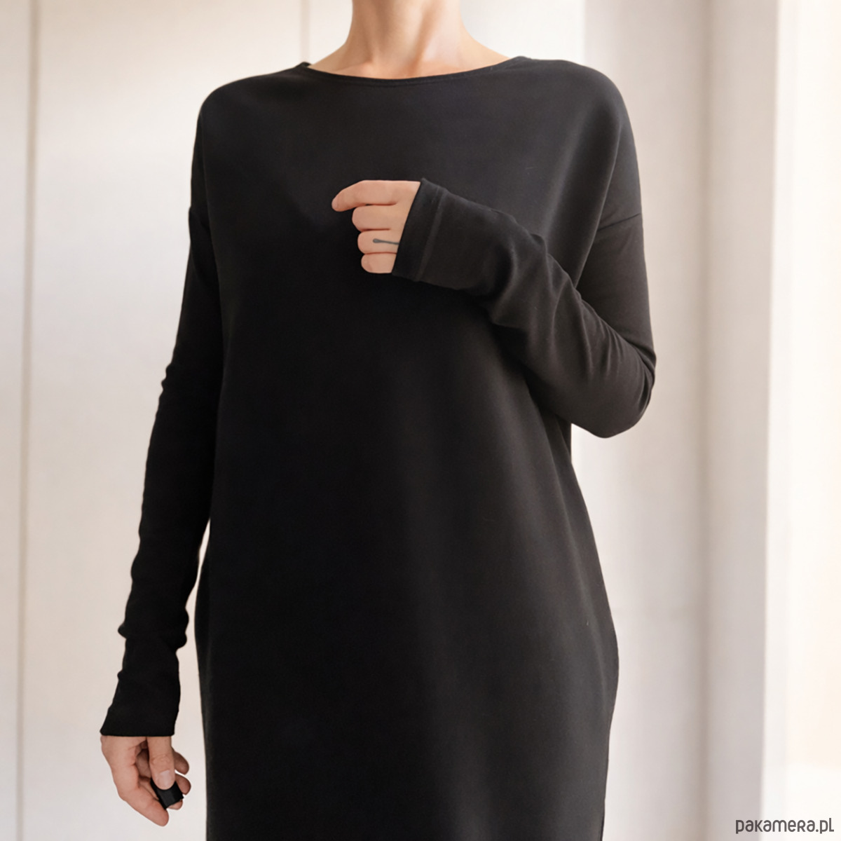 Baaaardzo długie rękawy z dzianiny ściągaczowej, okrągły dekolt, kieszenie w szwach bocznych oraz rozporki po bokach.