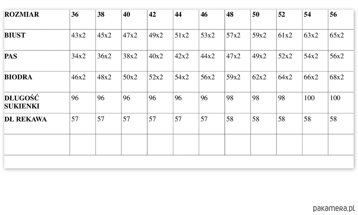 Tabela z wymiarami dla poszczególnych rozmiarów w galerii zdjęć.