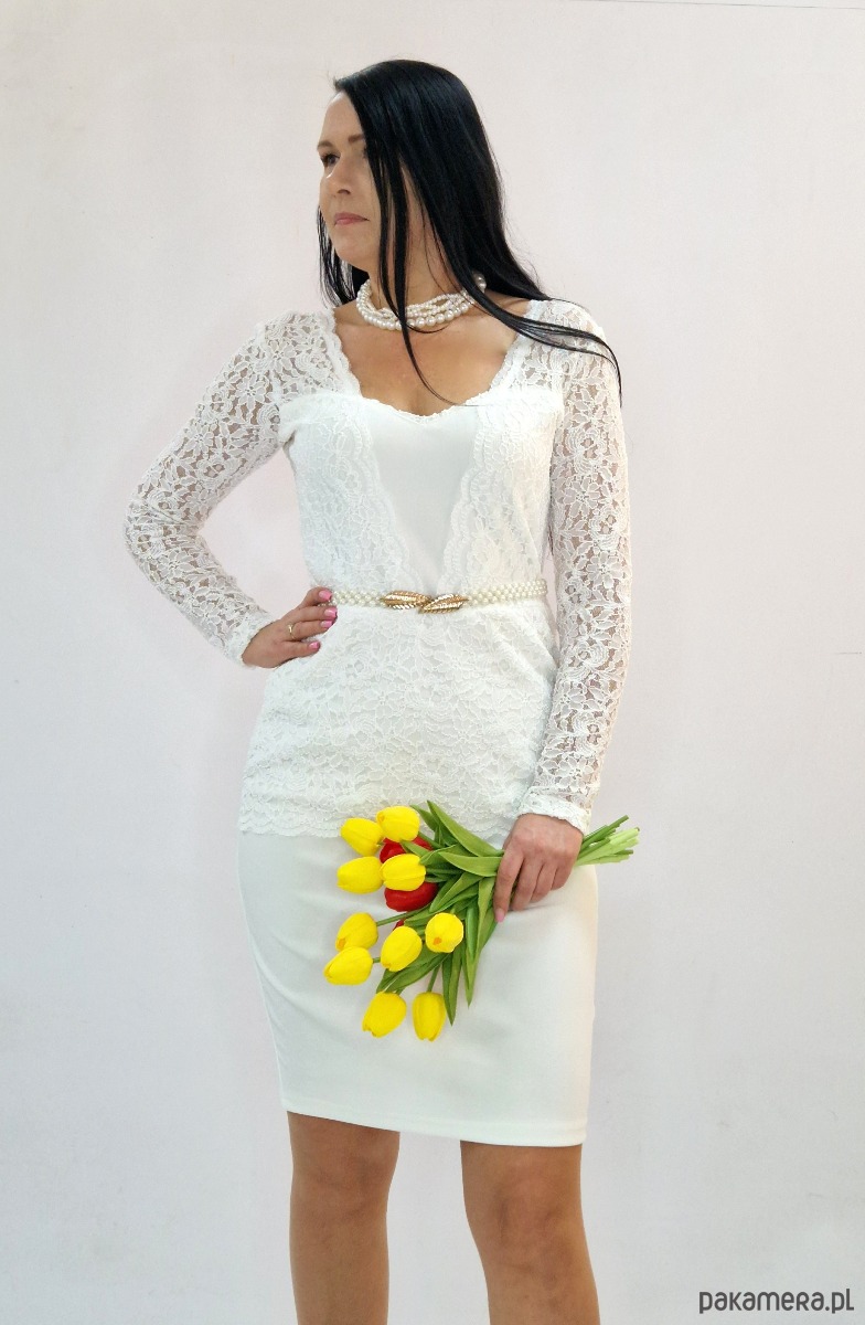 Romantyczna i zmysłowa, elegancki dekolt i długie koronkowe rękawy.