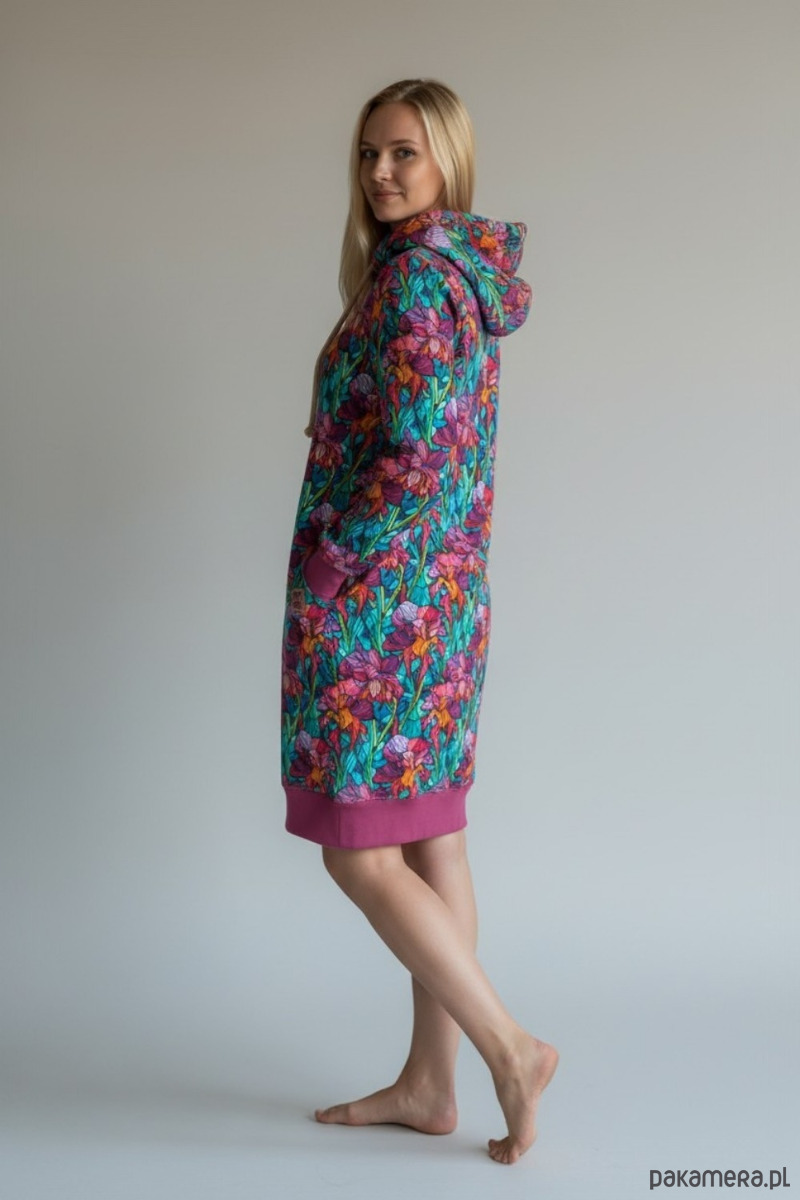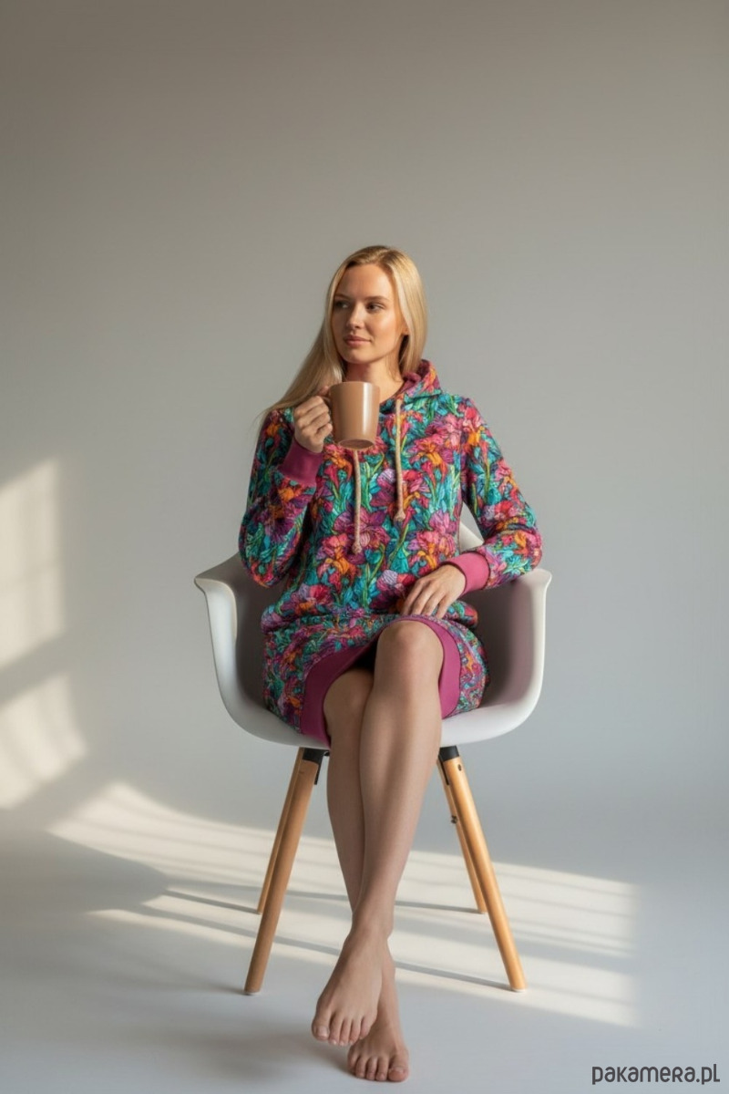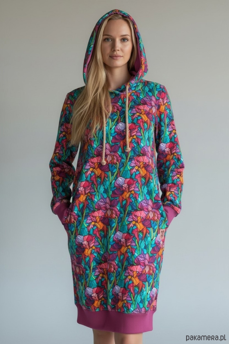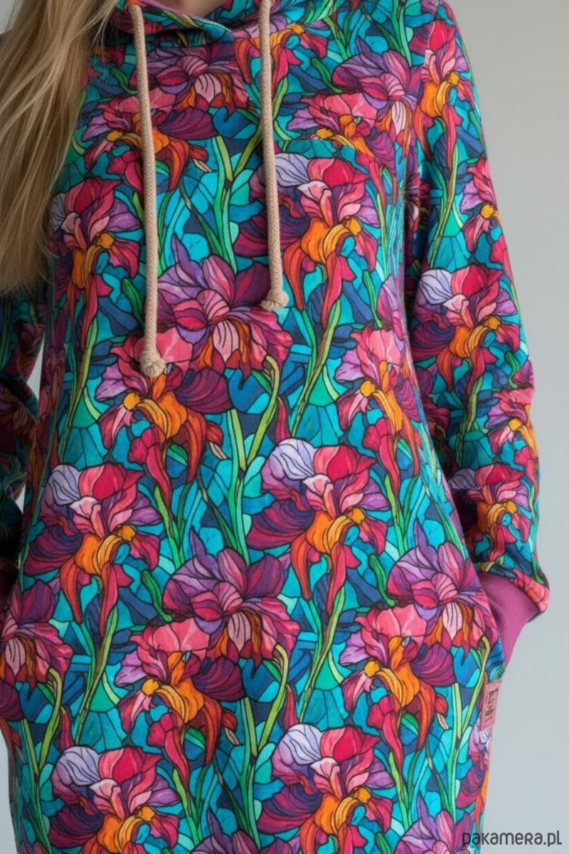 Wyjątkowa sukienka dresowa o artystycznym charakterze, ozdobiona unikatowym witrażowym wzorem, który przyciąga uwagę i dodaje stylizacji wyrazistego, nowoczesnego akcentu. To model stworzony dla kobiet, które cenią modę z charakterem — łączącą komfort noszenia z artystycznym designem.