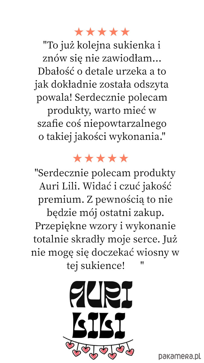 Możesz zwrócić zakupiony produkt bez podania przyczyny w przeciągu 14 dni od daty jego otrzymania. Wystarczy, że wyślesz wiadomość e-mail na adres Pakamery. Pamiętaj, że produkt musi być w stanie nienaruszonym i nie może nosić śladów używania. Zwracany towar przesyłasz na własny koszt wraz z wypełnionym formularzem o odstąpieniu od umowy (do pobrania po zalogowaniu). Produkty wykonane na indywidualne zamówienie nie podlegają zwrotowi. Pełna procedura zwrotu (tutaj)