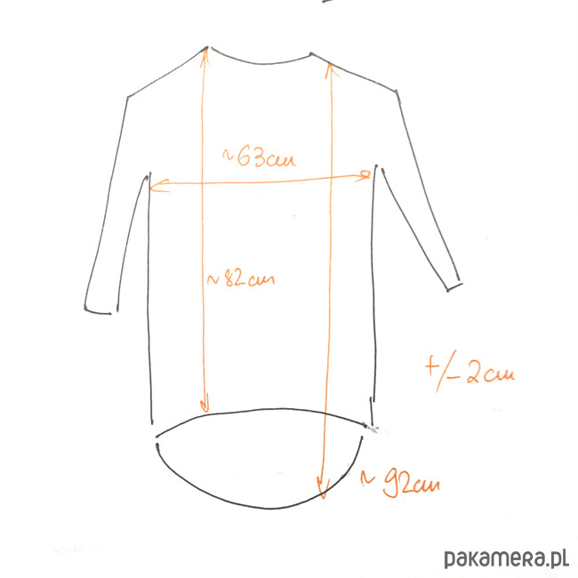 Szerokość pod pachami ok.: 63cm, długość z przodu: ok.: 82cm, tył, ok.: 92cm.