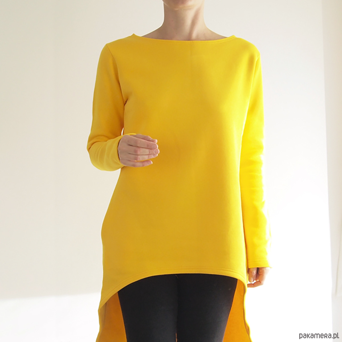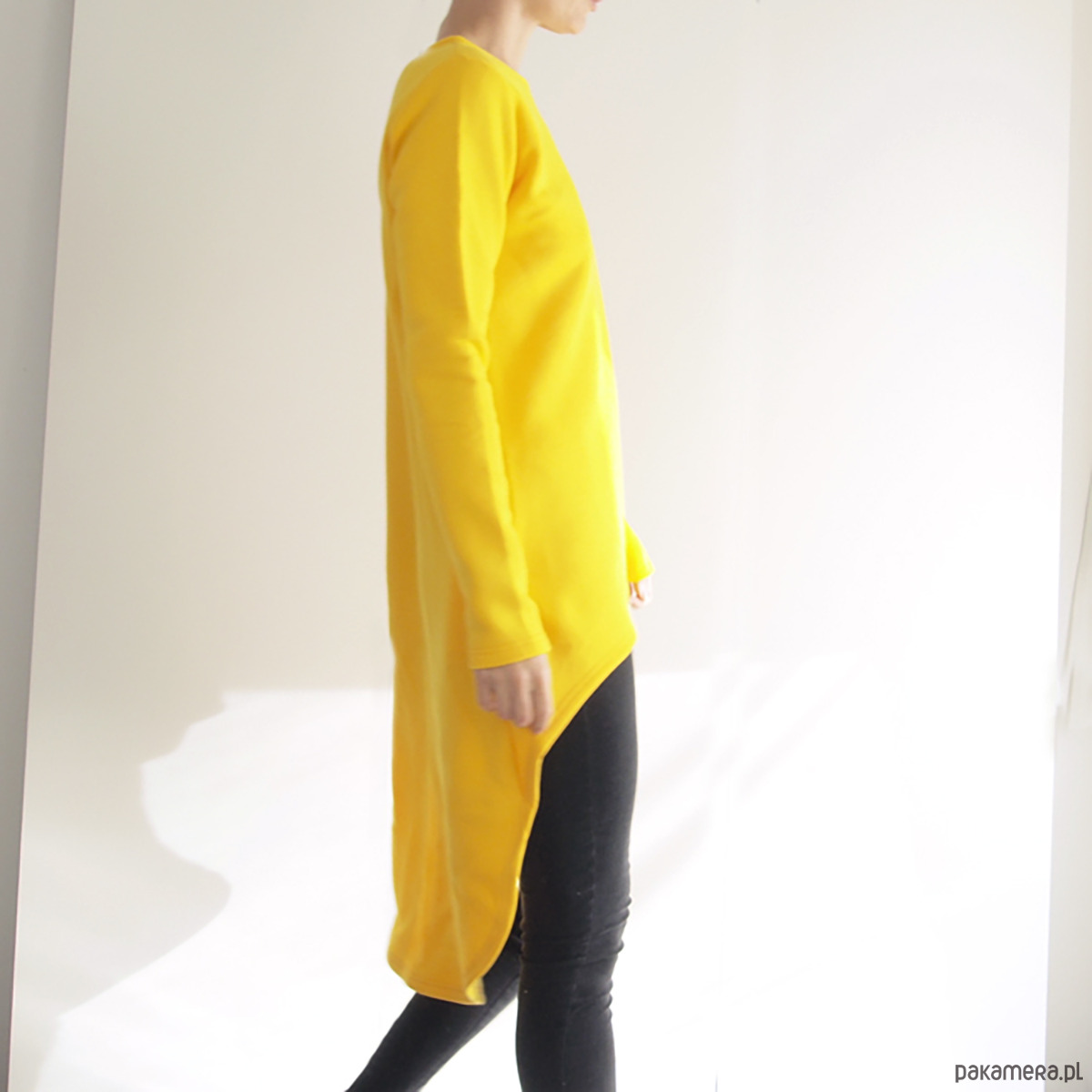 Żółta sukienka/tunika z grubej dresówki z miękkim misiem pod spodem – jak ulubiony koc, w którym chce się zaszyć na cały dzień.
