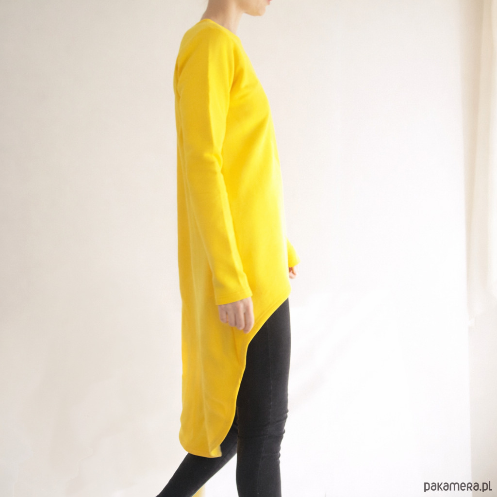 Żółta sukienka/tunika z grubej dresówki z miękkim misiem pod spodem – jak ulubiony koc, w którym chce się zaszyć na cały dzień.