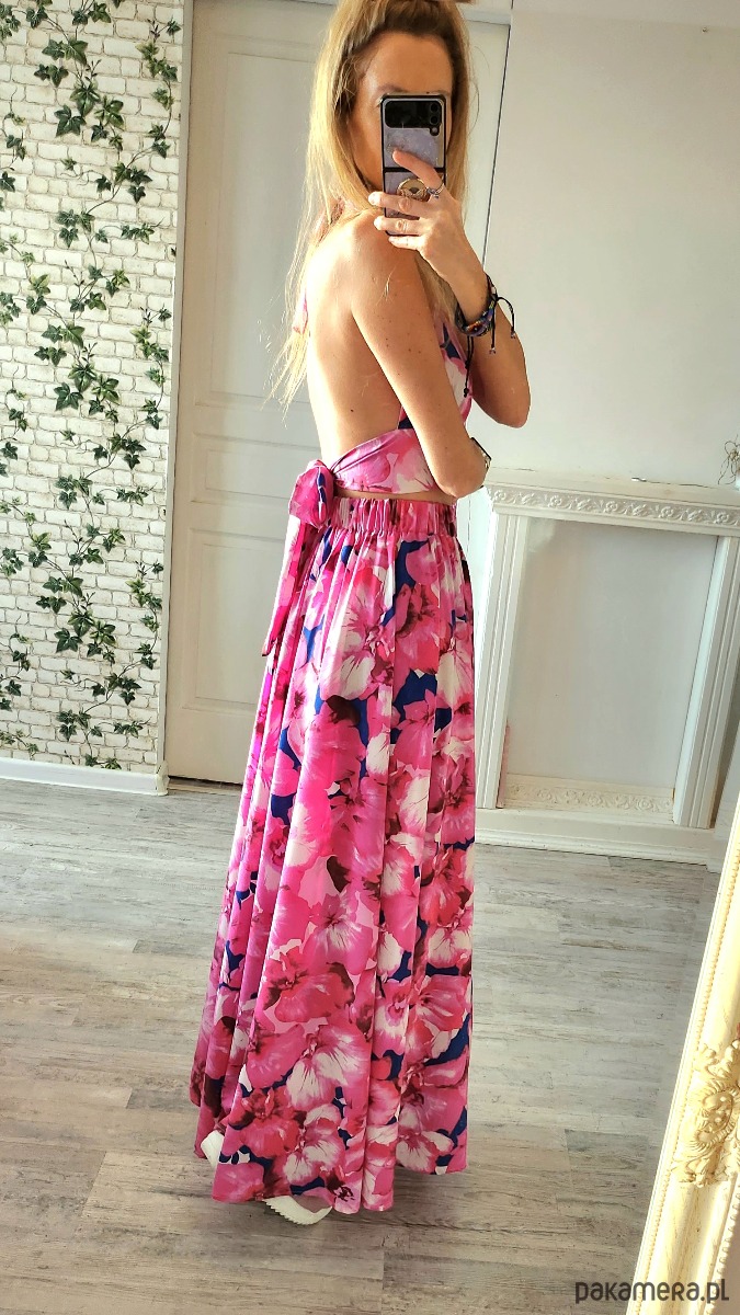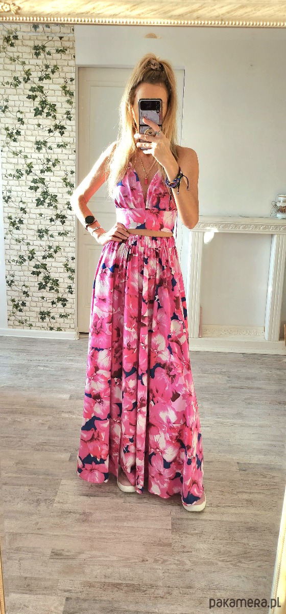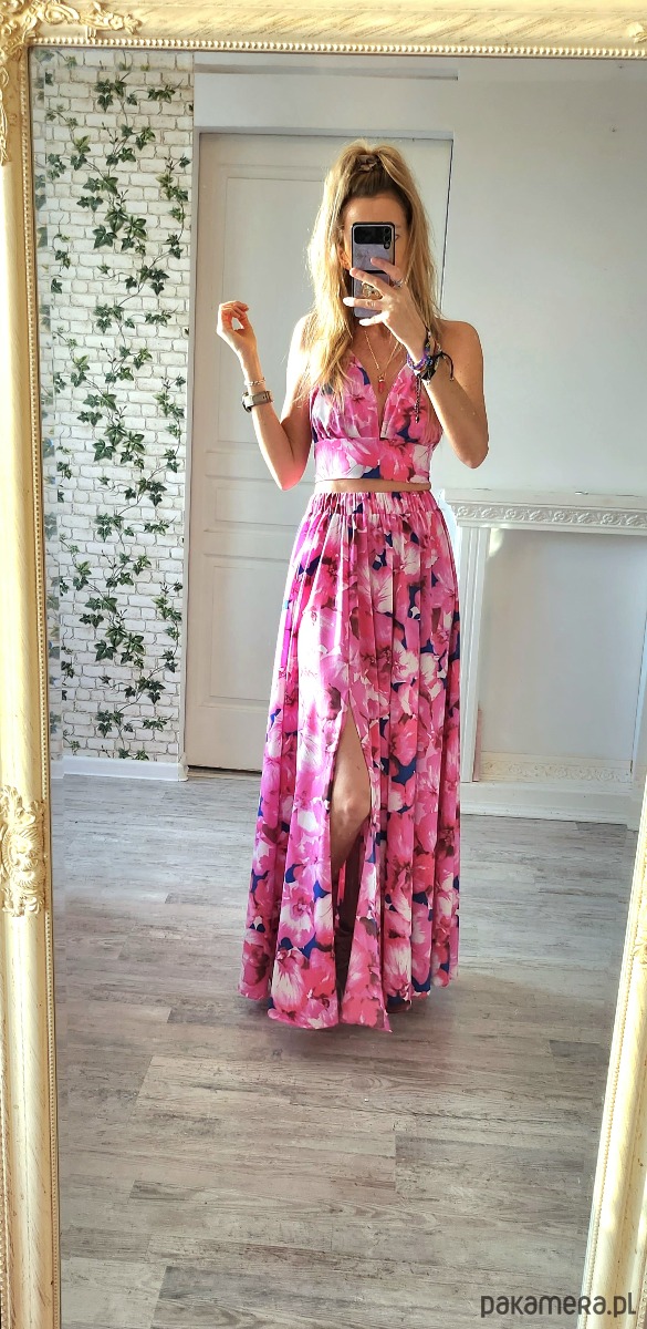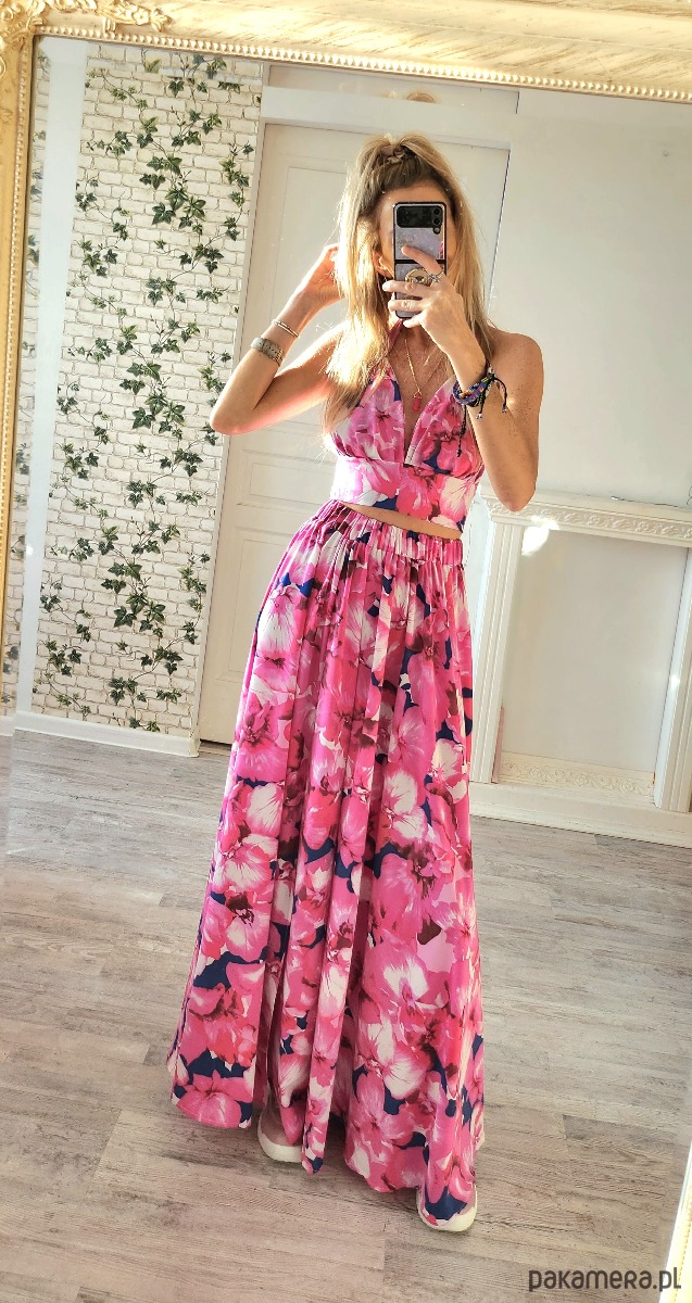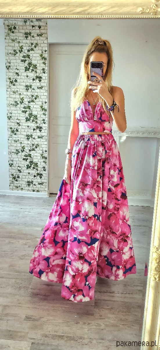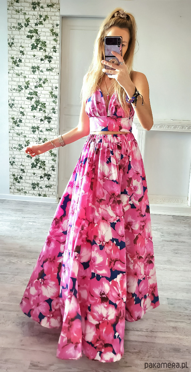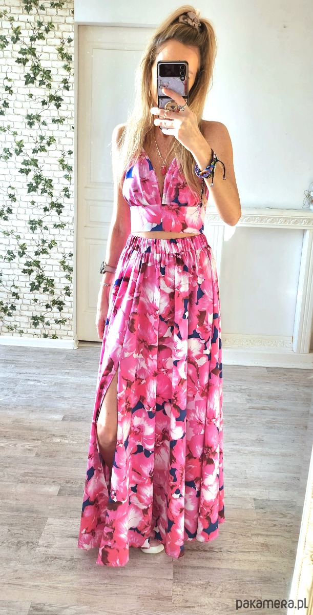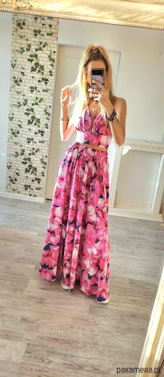 Różowa spódnica z rozcięciem plus top wiązany na plecach.