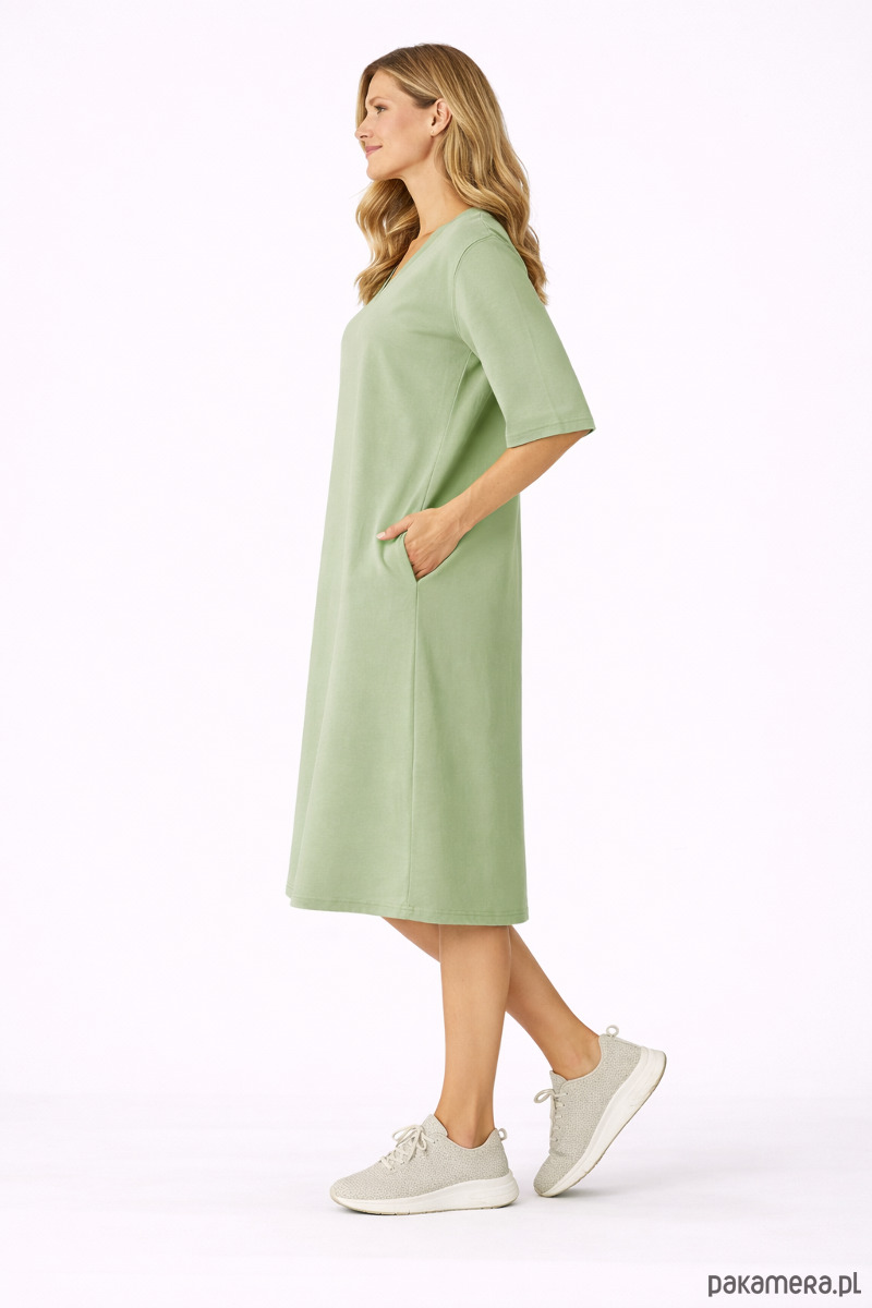 Dekolt w serek (V-neck) subtelnie wysmukla szyję i dodaje całości lekkości, a praktyczne kieszenie ukryte w bocznych szwach zwiększają funkcjonalność, zachowując minimalistyczny charakter sukienki.
