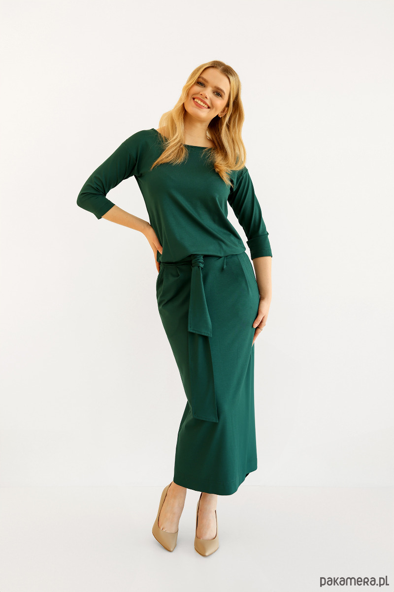 Emily to długa sukienka z lekko zbluzowaną górą z okrągłym dekoltem. Fason jest lekko dopasowany u dołu z rozporkiem z tyłu ora z wszytym paskiem w talii.