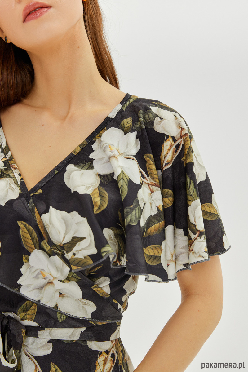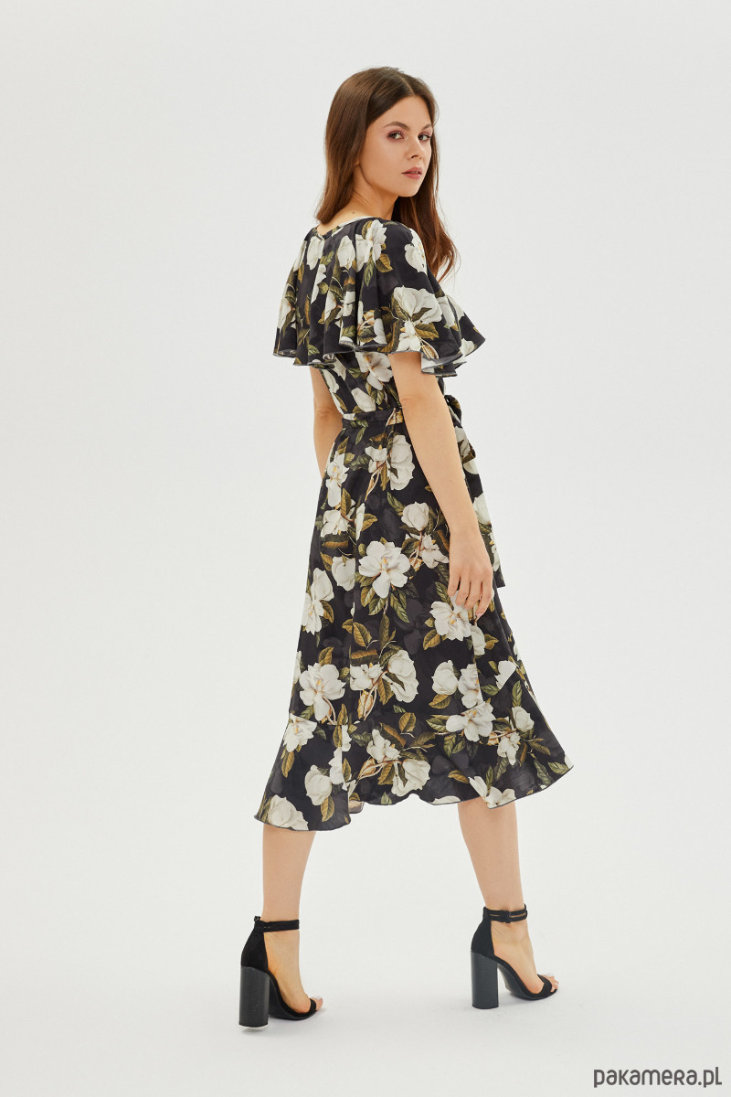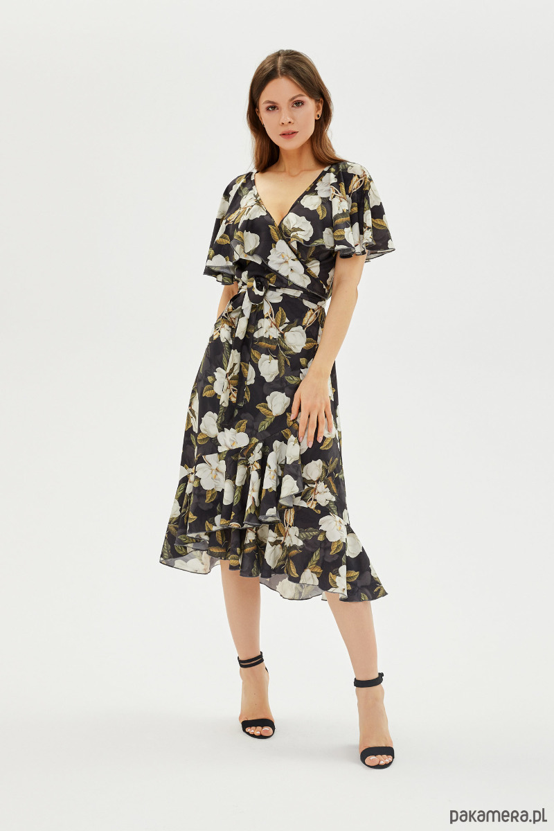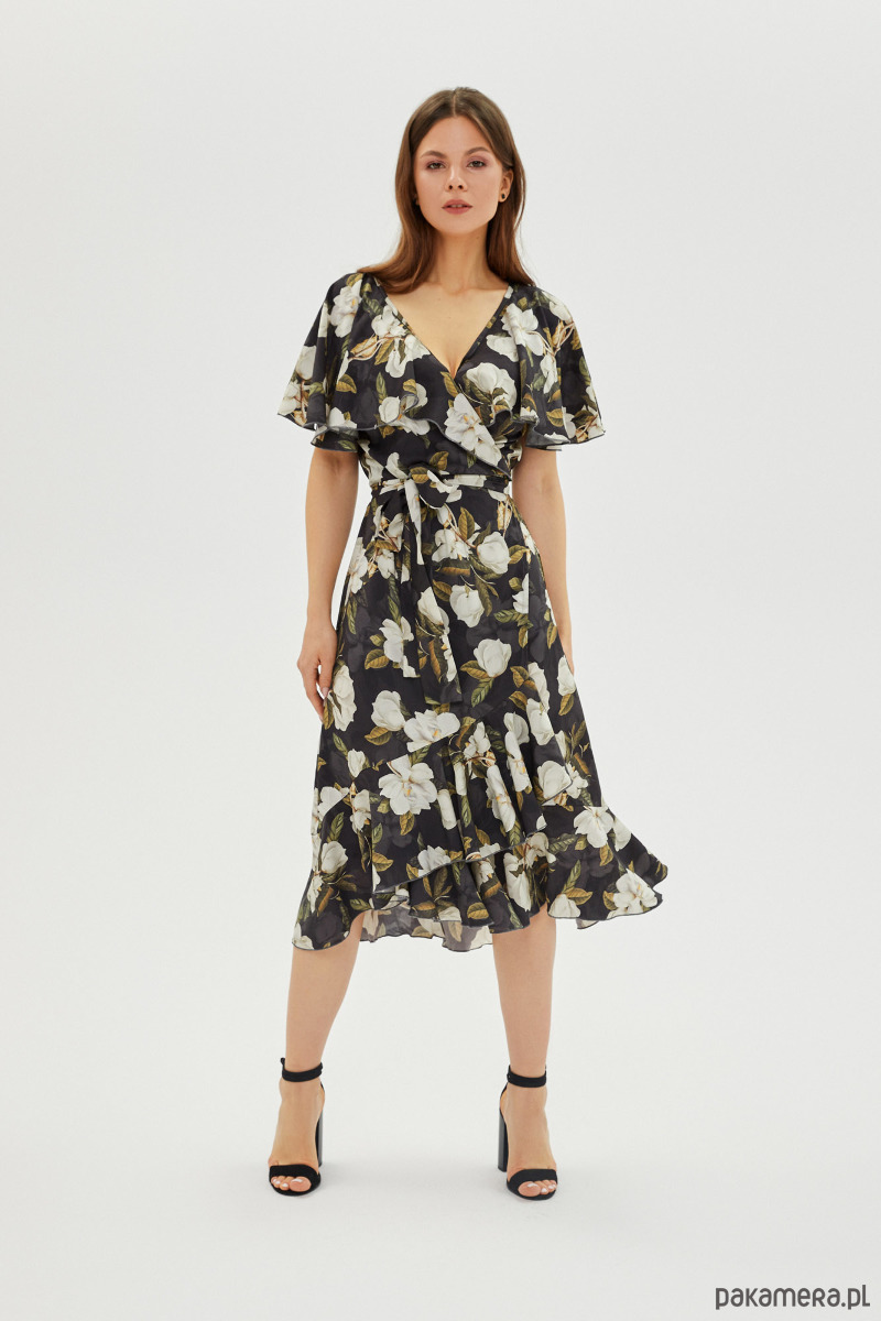 Zwiewna sukienka Gabriella posiada kobiecy szlafrokowy krój. Niesamowity print białych kwiatów na czarnym tle prezentuje się ponadczasowo i elegancko. Krój sukienki Gabriella jest niezwykle wyjątkowy, falbanka przy dekolcie zamienia się w piękne duże rękawy, które bardzo ładnie układają się w ruchu. Sukienka idealnie się nadaje na chrzciny, wesele lub urodzinową imprezę.
