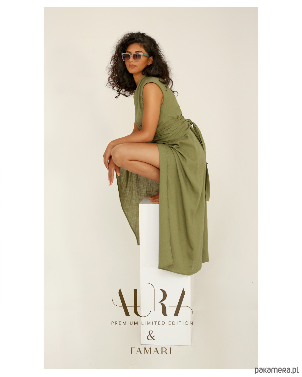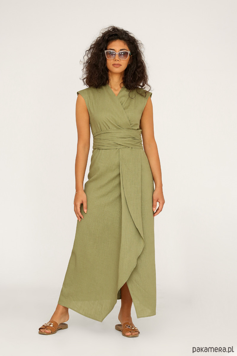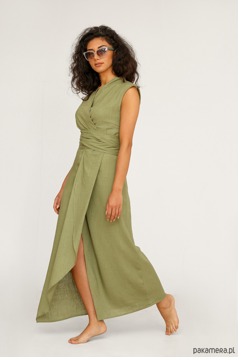 Gaja PREMIUM LIMITED EDITION, to długa, lekko dopasowana sukienka zakładana kopertowo. Posiada szeroki pas podkreślający miejsce talii, który doskonale kamufluje ewentualne mankamenty sylwetki. Sukienka wykonana jest z wysokogatunkowej mieszanki lnu i wiskozy (50% lnu i 50% wiskozy), dzięki czemu tkanina nie ulega tak mocnym zagnieceniom, jak w przypadku czystego lnu, a jednocześnie zachowuje strukturę i właściwości lnu.