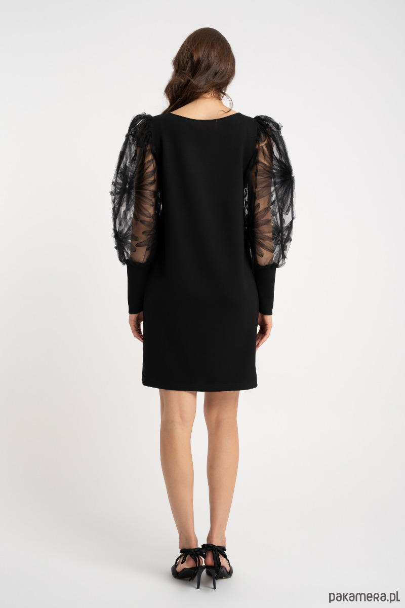 Prosta forma przed kolano z dekoltem w łódkę w połączeniu z przezroczystymi, dramatycznymi rękawami zakończonymi szerokim mankietem nadaje jej nietuzinkowego charakteru, przez co jest idealnym wyborem na wieczorne wyjścia.