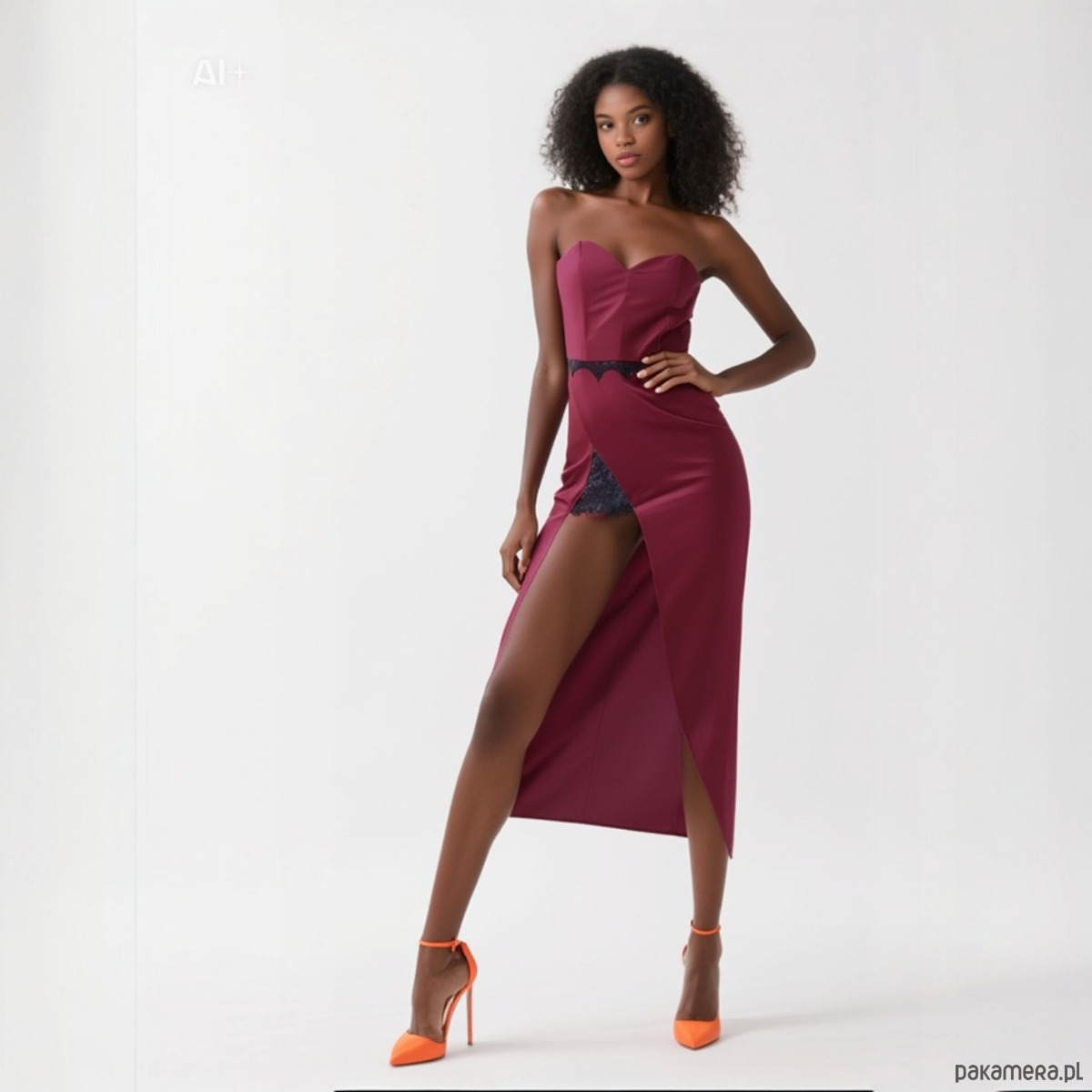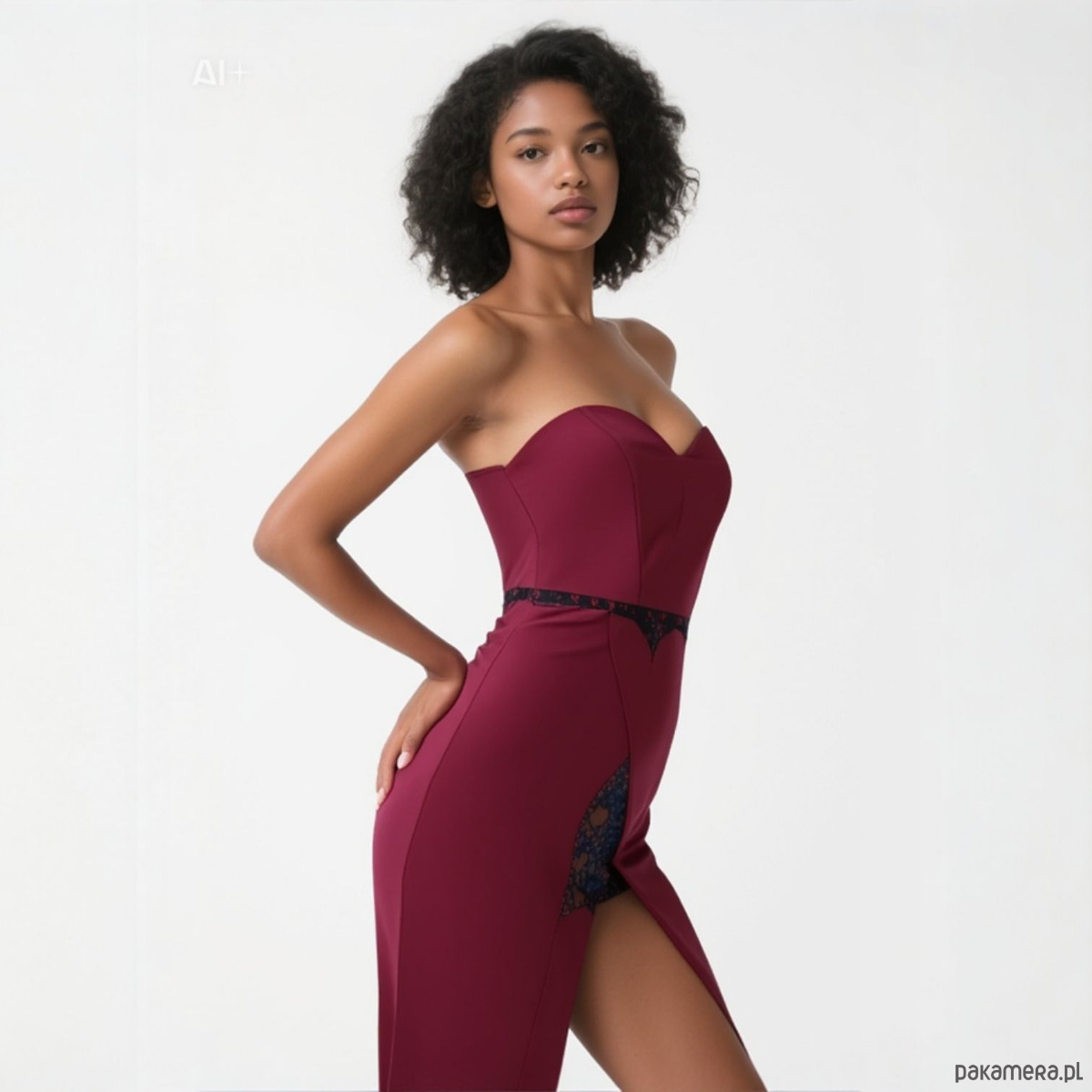Dół sukienki z asymetrycznym rozporkiem z wstawką koronki .