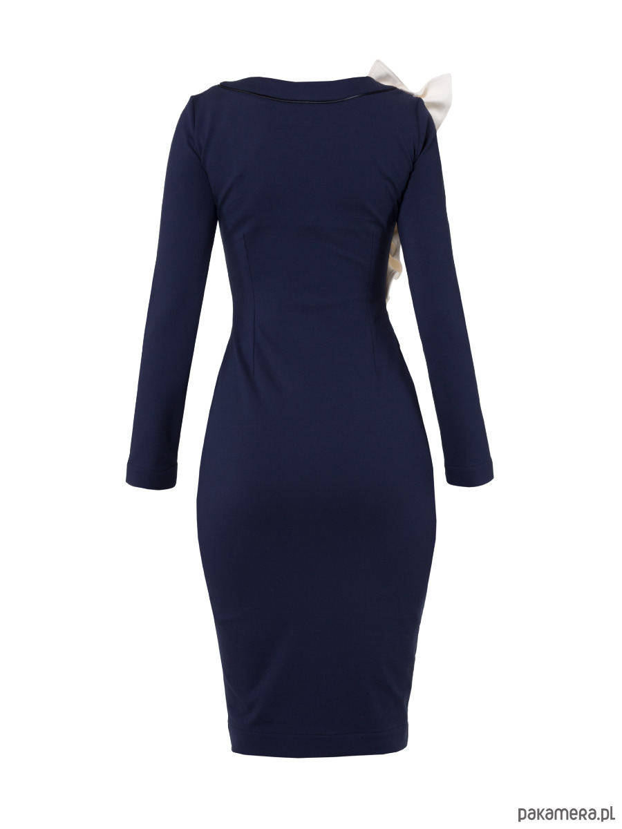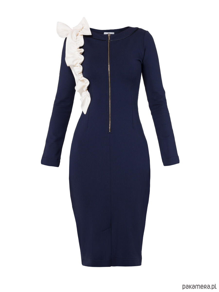 Sukienka klasyczna z rękawami. Sukienka ołówkowa zwężana ku dołowi. Krój dopasowany; wyszczuplające pionowe cięcia; zachowuje klasyczną linię; dekolt okrągły; rękawy długie; krój modeluje sylwetkę; zapinana na zamek z przodu; precyzyjnie odszyta. Długość sukienki ok. 106 cm; długość rękawów ok.58 cm. Kolor: granatowy. Tkanina: 60% wiskoza, 35% poliamid, 5% elastan. Pranie w pralce w 30° C; suszenie w stanie rozwieszonym; prasowanie parą.