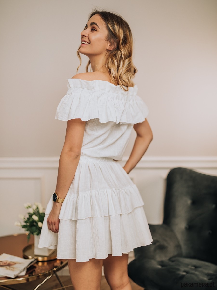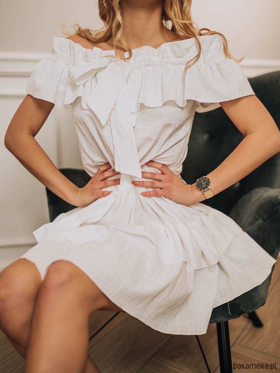 Biała sukienka hiszpanka z odsłoniętymi ramionami, wiązaniem na przodzie i ozdobnymi falbankami. Romantyczny krój, idealny na lato. Produkt polski!