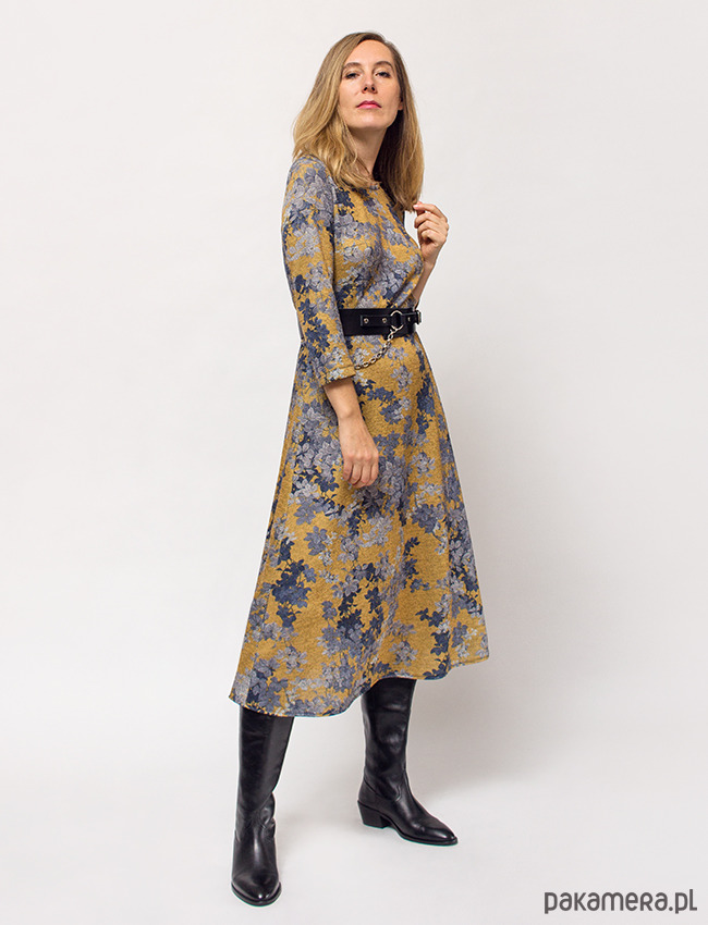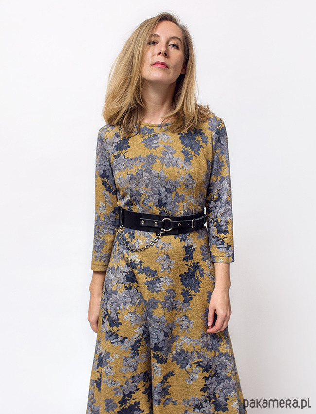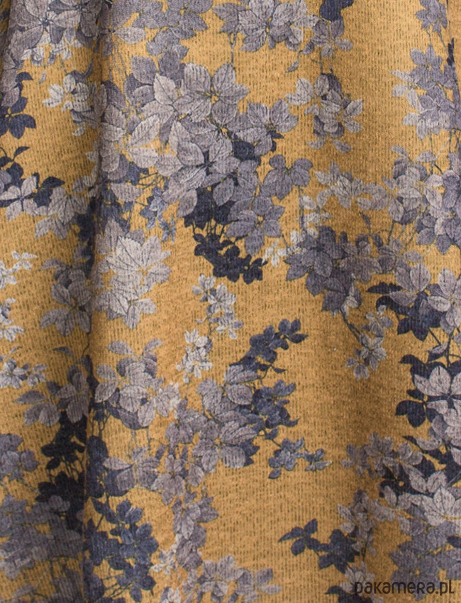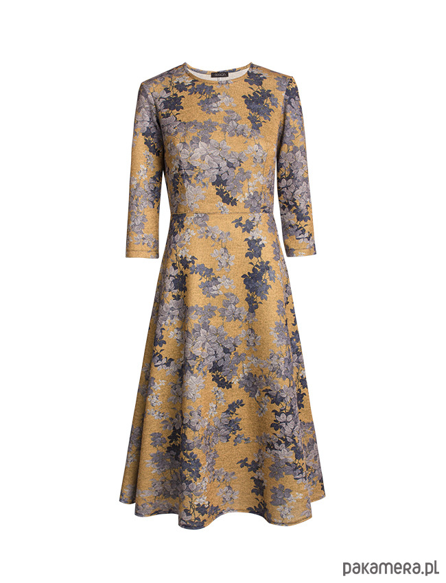 Klasyczna sukienka o rozkloszowanym, bardzo kobiecym kroju z rękawem 7/8. Wygodna nie krępująca ruchów, uszyta z elastycznego materiału. Dzianina o złocistym kolorze z motywem błękitno-szarych liści. Idealne połączenie wygody i klasycznej elegancji na co dzień do pracy lub np. na wesele :)