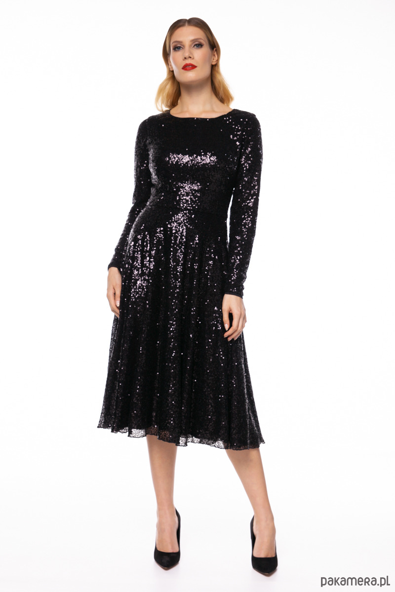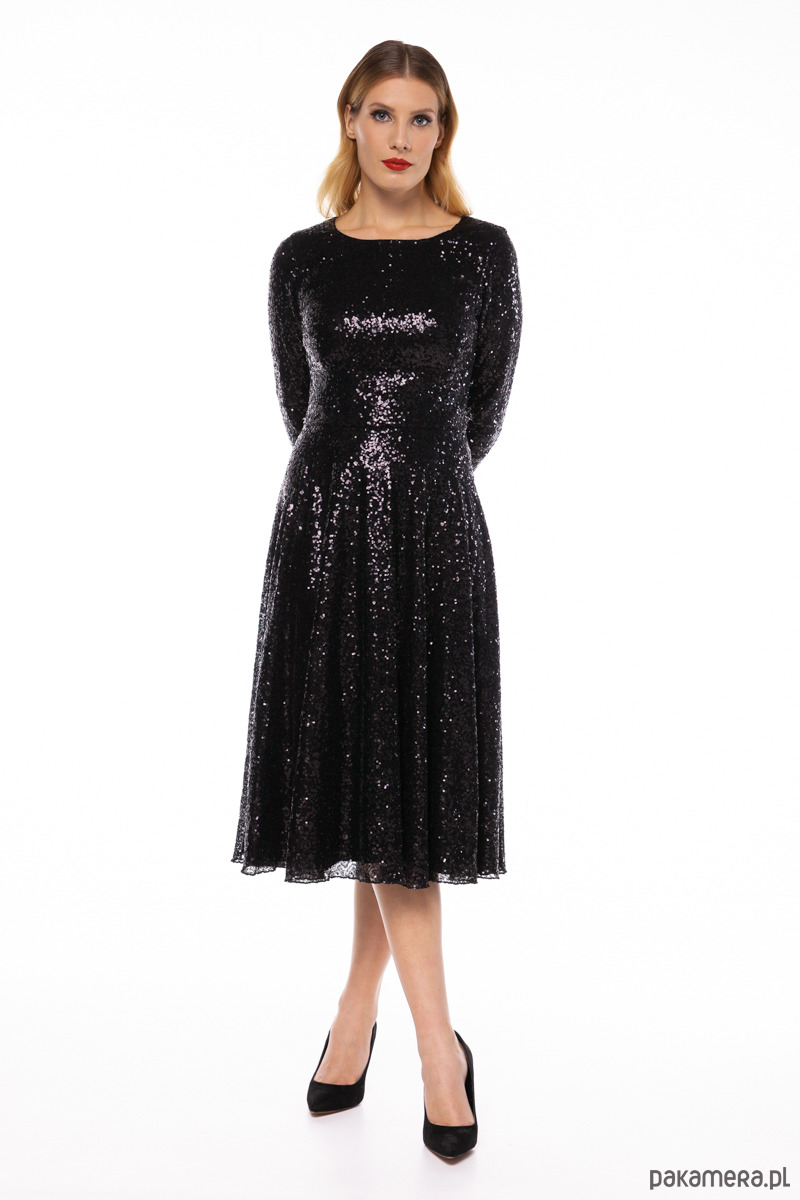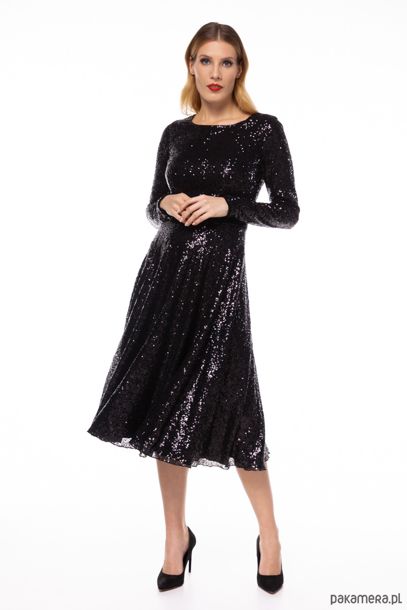 Sukienka z kolekcji Premium uszyta z drobniutkich cekinów w kolorze czarnym, na podszewce wiskozowej. Materiały są szlachetne i lekko elastyczne. Góra dopasowana, długie rękawy, dół rozkloszowany, zamek kryty z tyłu, długość od talii około 75 cm. Modelka na zdjęciu ma 177 cm.