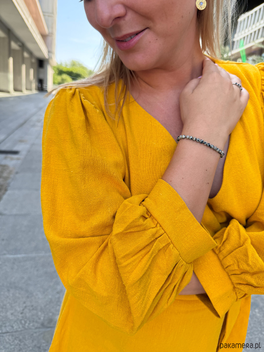 Rękawy: długie, zakończone mankietem z delikatnym marszczeniem – nadają lekkości i elegancji