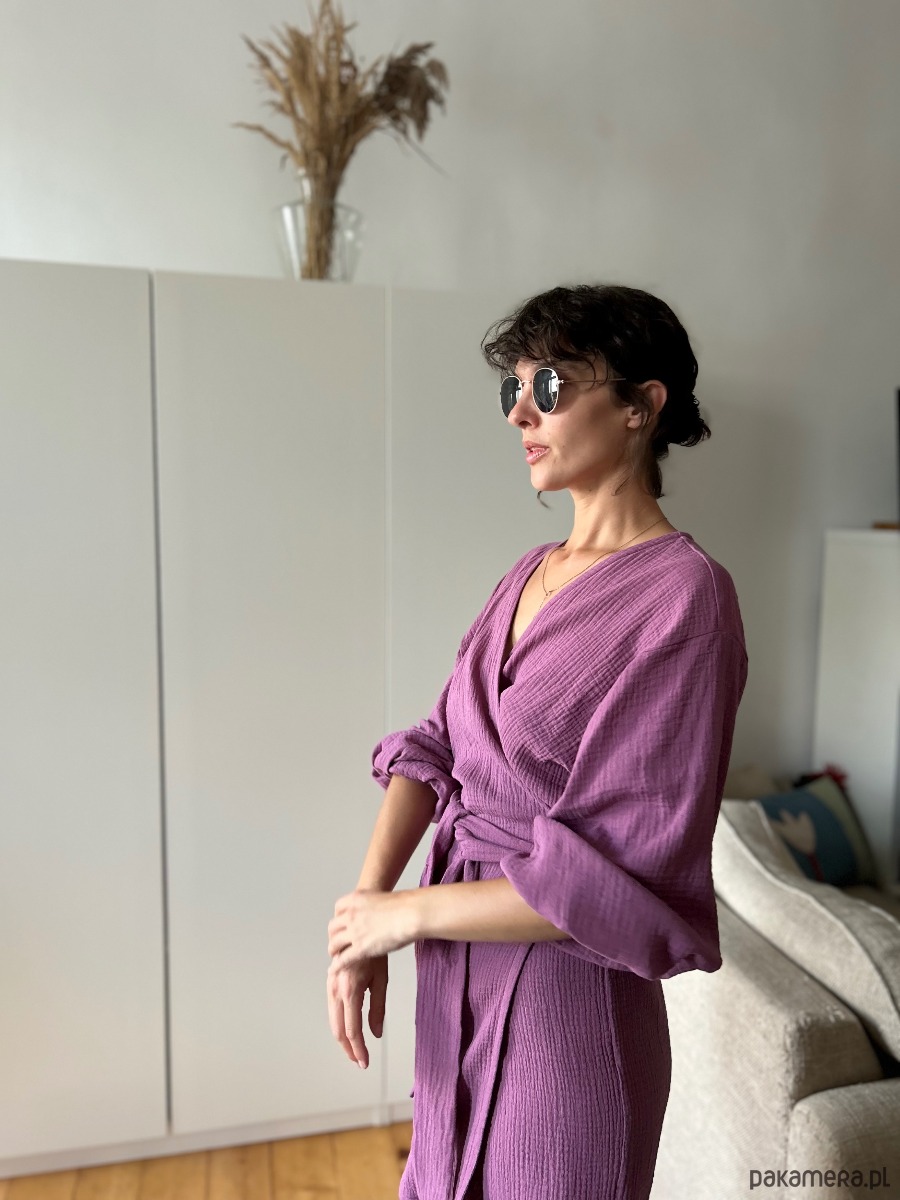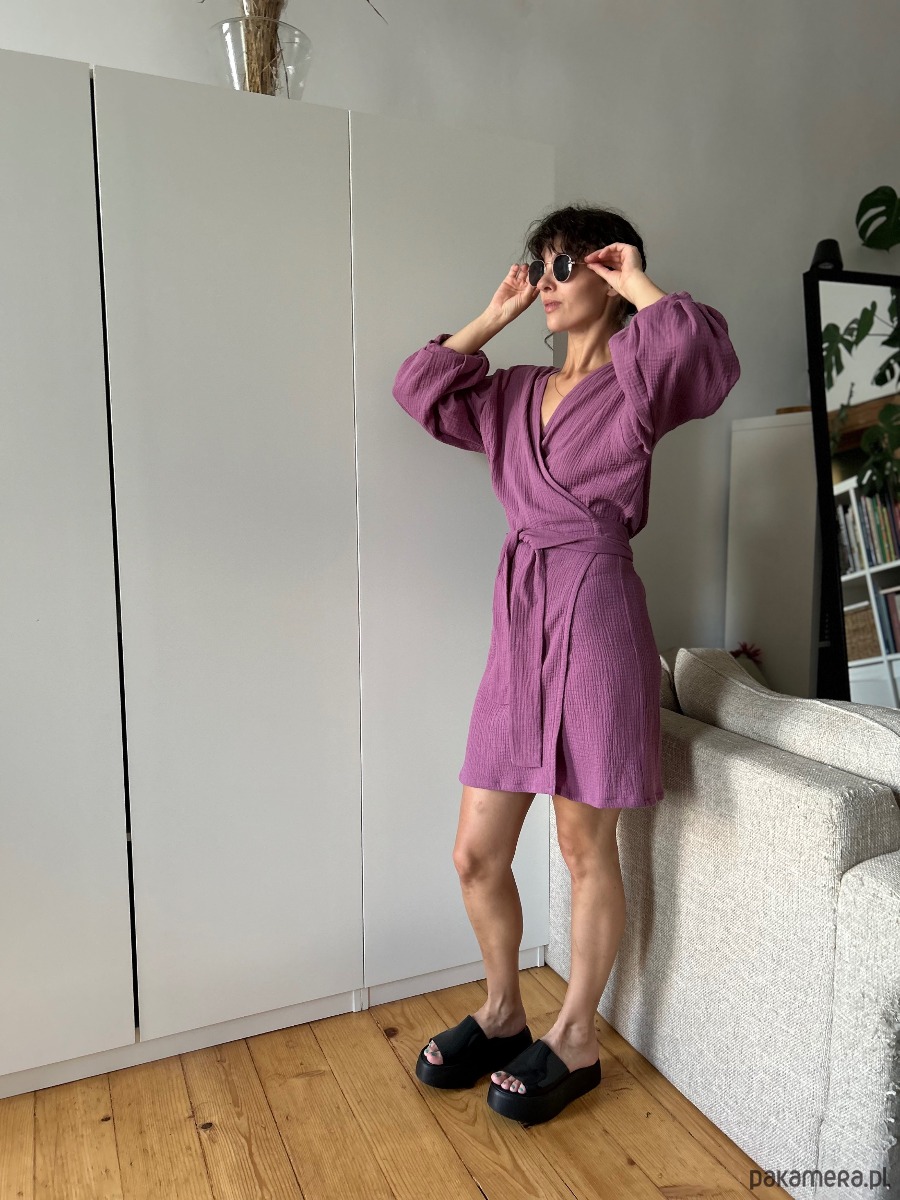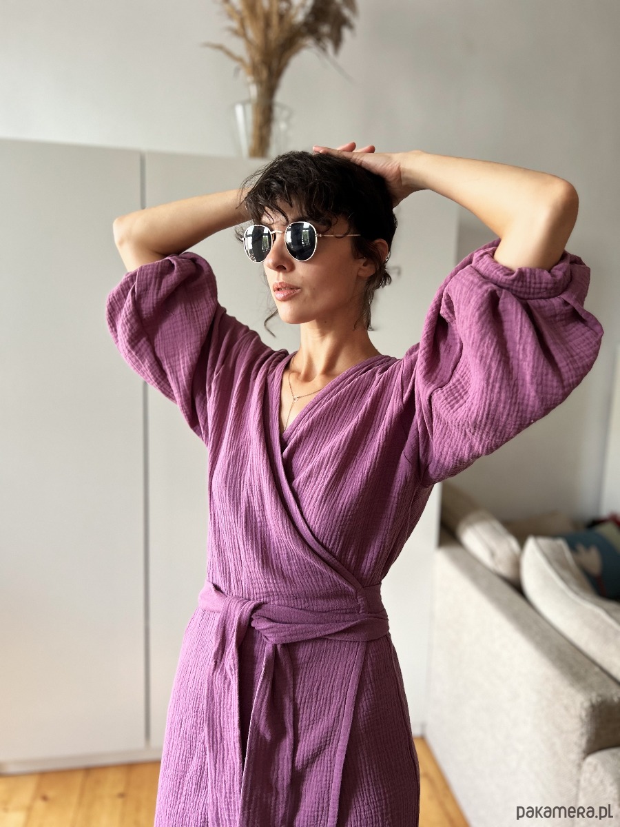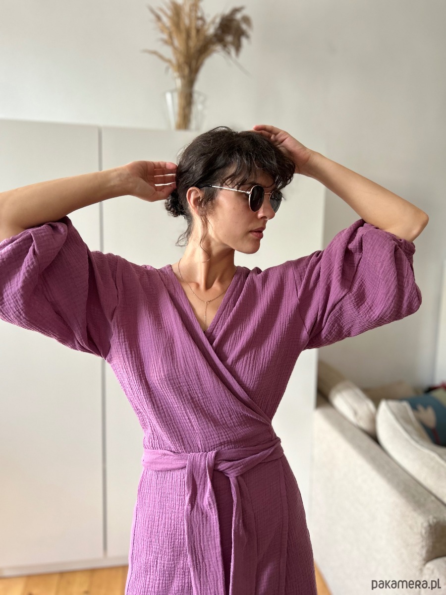 Sukienka KALIA została uszyta z muślinu bawełnianego w kolorze jagodowym. Posiada klasyczną, kopertowa forma z wiązaniem w talii i piękne bufiaste rękawy 3/4.
