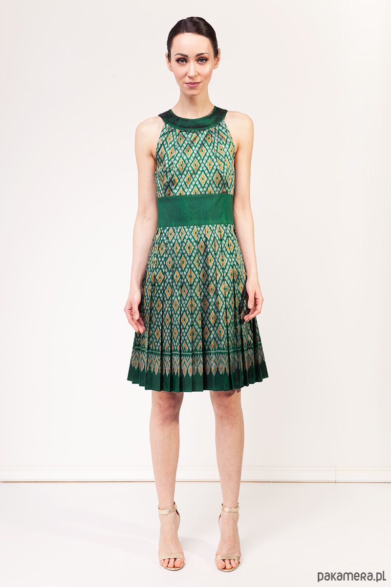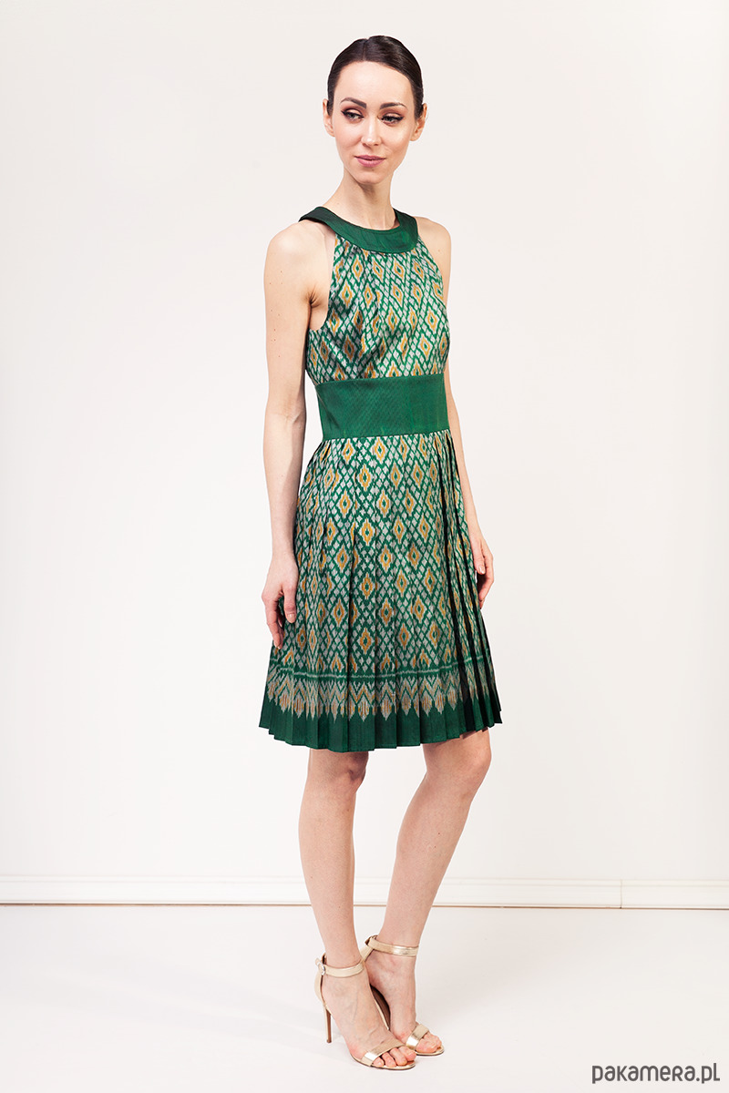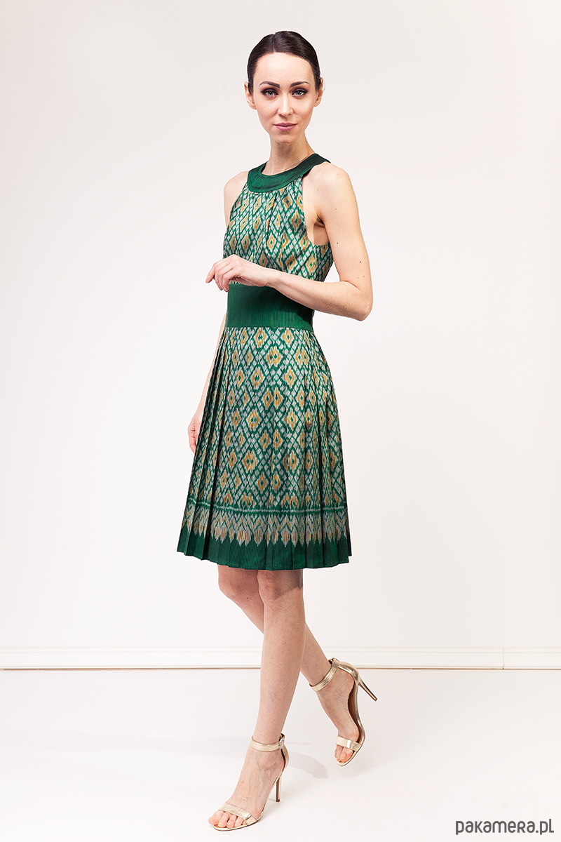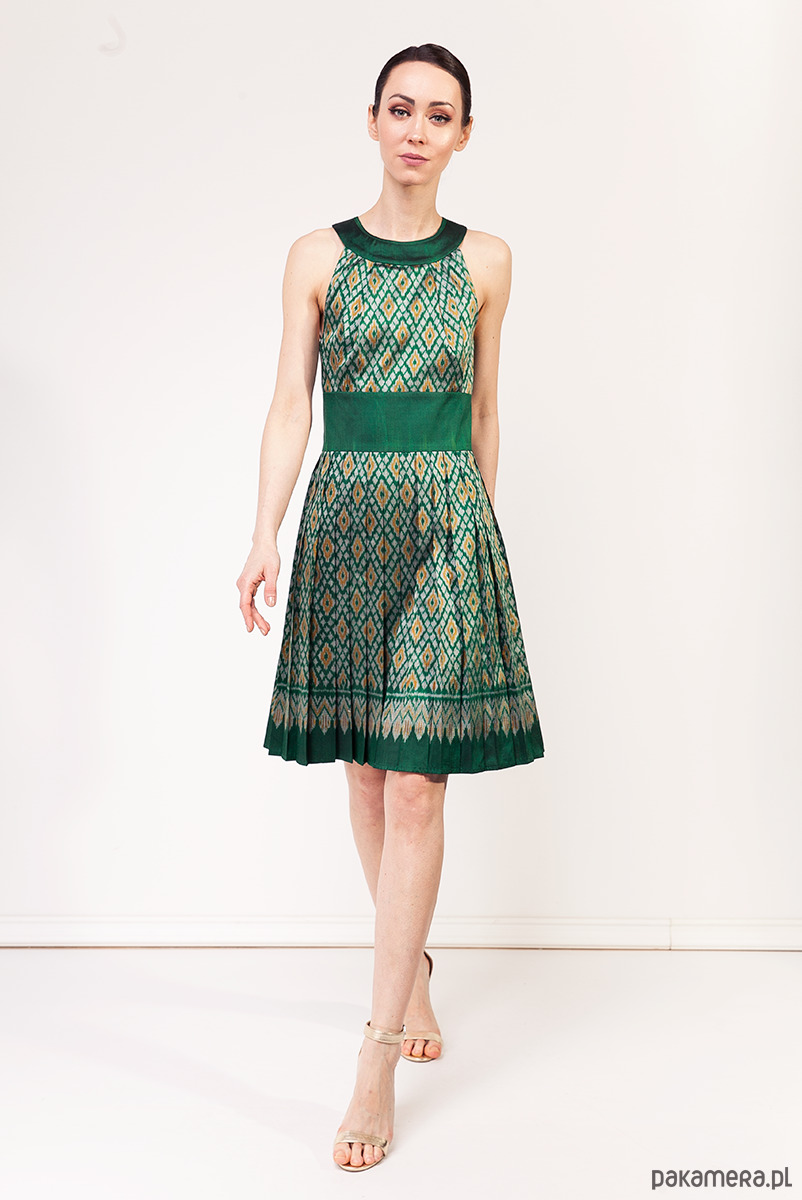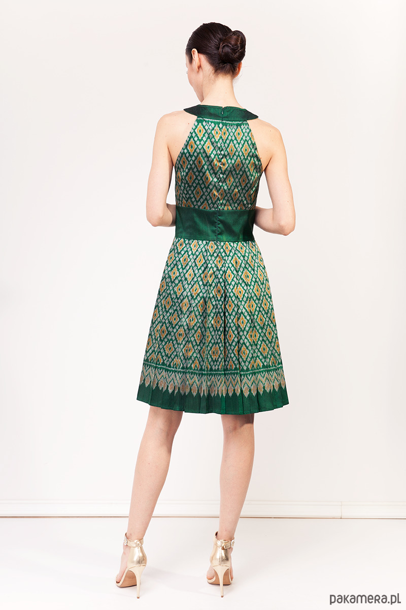 Ekskluzywna sukienka z kolekcji specjalnej uszytej na tajski tydzień mody. Wykonana z tajskiego, ręcznie tkanego jedwabiu królewskiego. Tkanina nie jest elastyczna. Góra dopasowana zakładkami, na podszewce. Talia podkreślona szerokim pasem, Dół ręcznie splisowany, rękawy 3/4, zamek kryty z tyłu, długość około 95 cm.