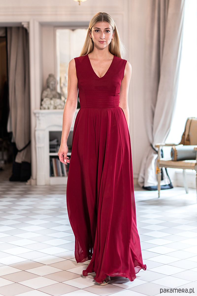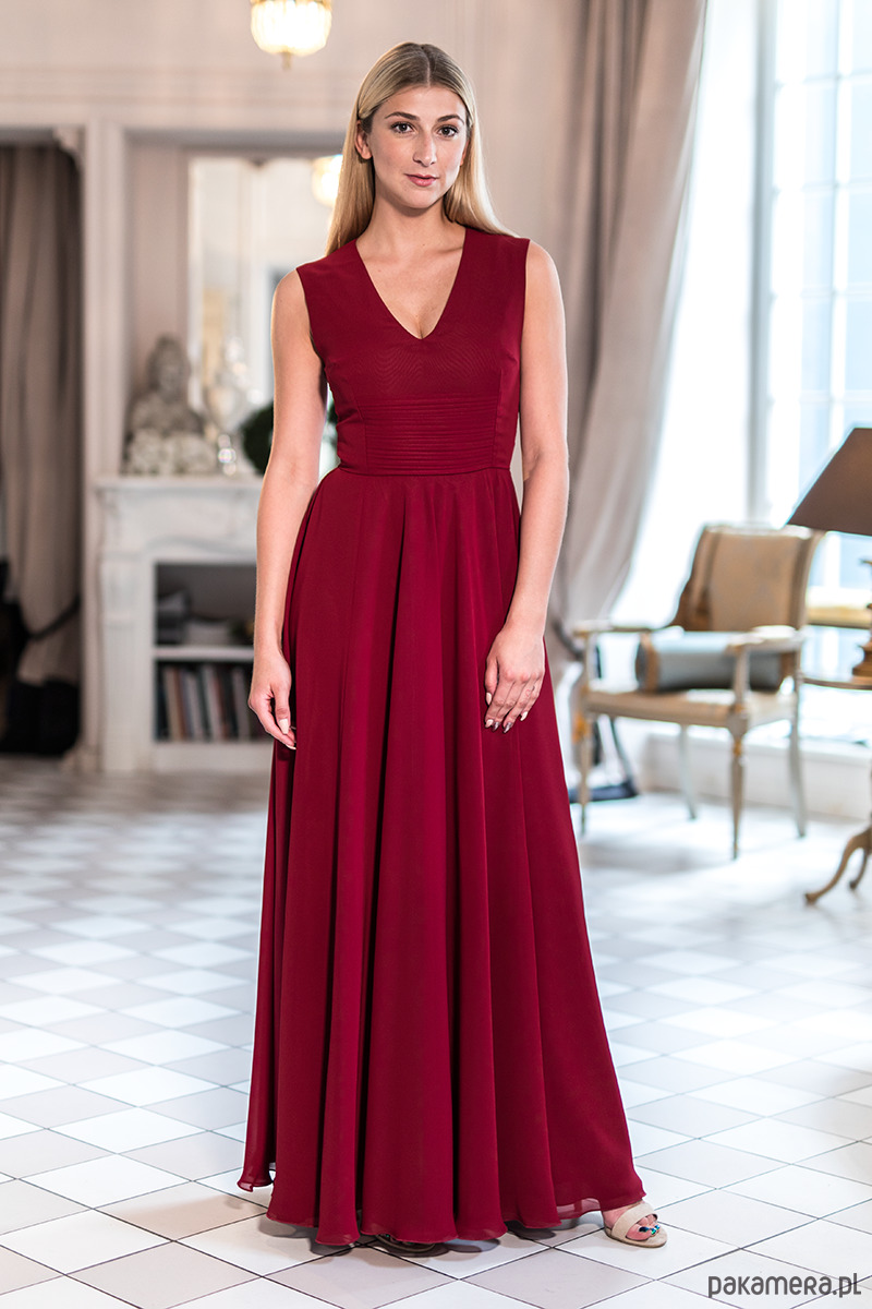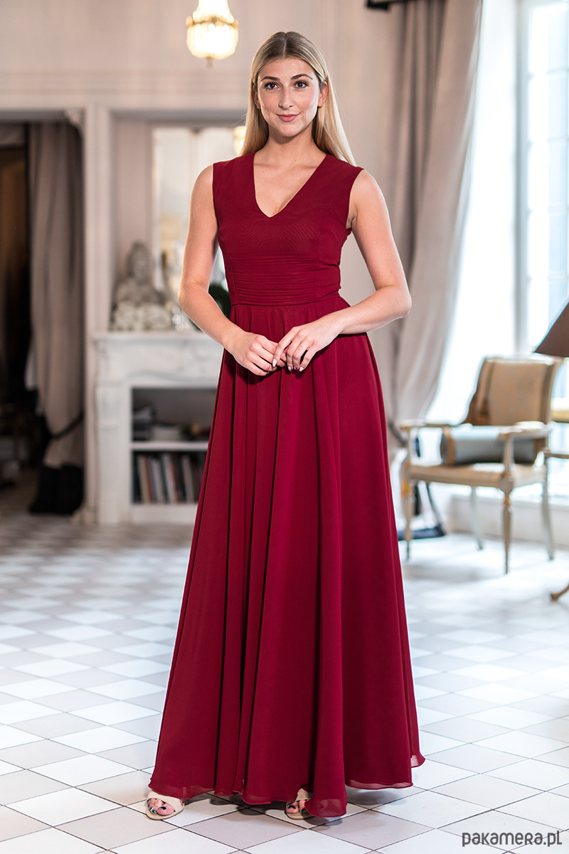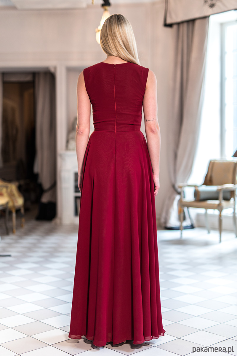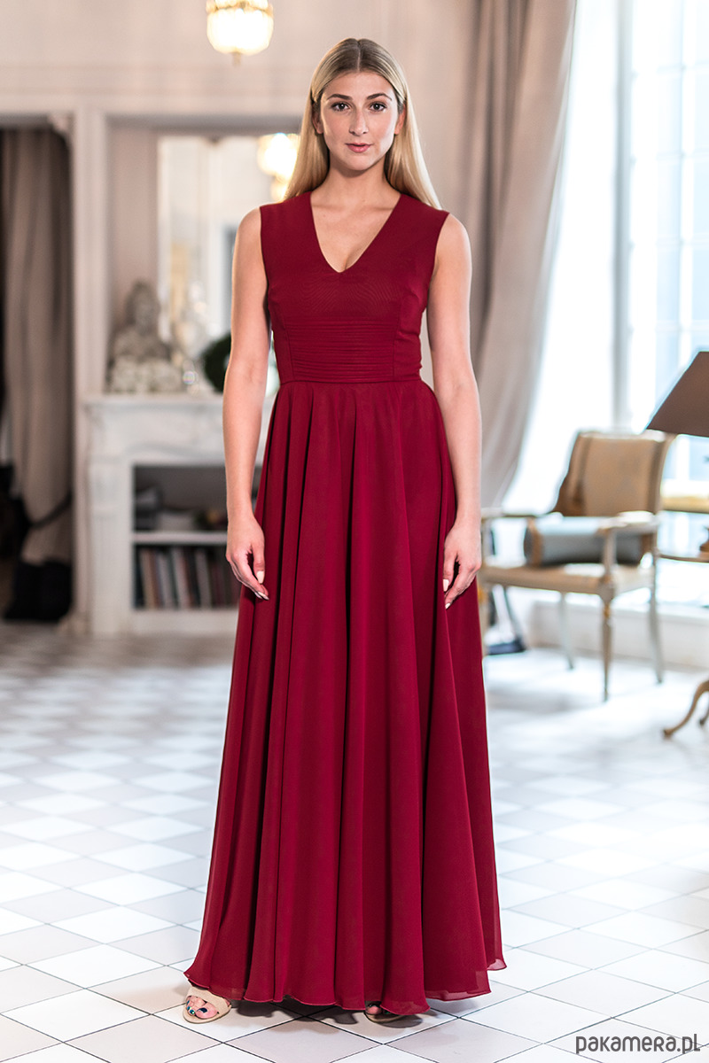 Sukienka wieczorowa uszyta z bordowego szyfonu, na wiskozowej podszewce. Tkaniny nie są elastyczne. Góra dopasowana z głębszym dekoltem i draperią powyżej talii.