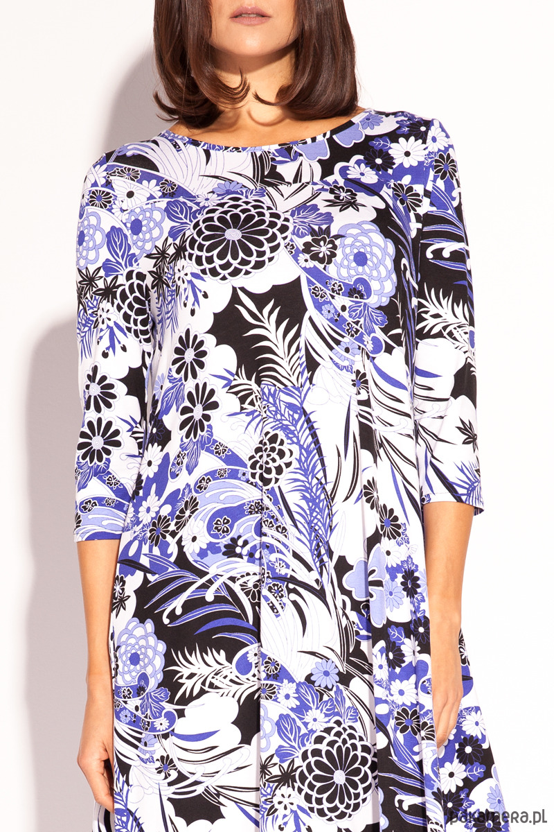 Sukienka oversize o luźnym fasonie uszyta z cienkiej dzianiny wiskozowej we wzory. Materiał miękko się układa. Ramiona są dopasowane, poniżej sukienka ma rozszerzony krój dzięki czemu spływa po sylwetce w obfity dół,rękawy 3/4, długość około 100 cm. W sprzedaży bez paska. Modelka ma 178 cm. Sukienka skrojona jest w taki sposób, że dopasuje się do każdej sylwetki.