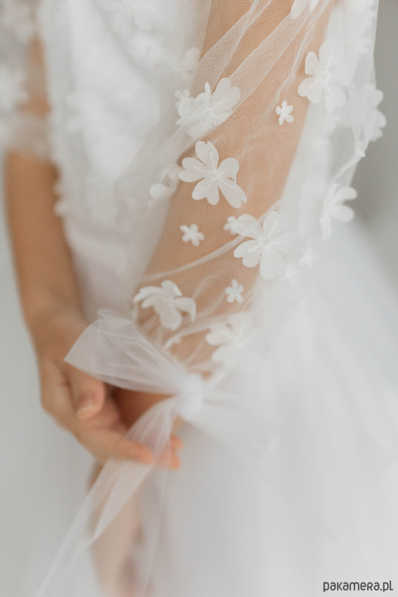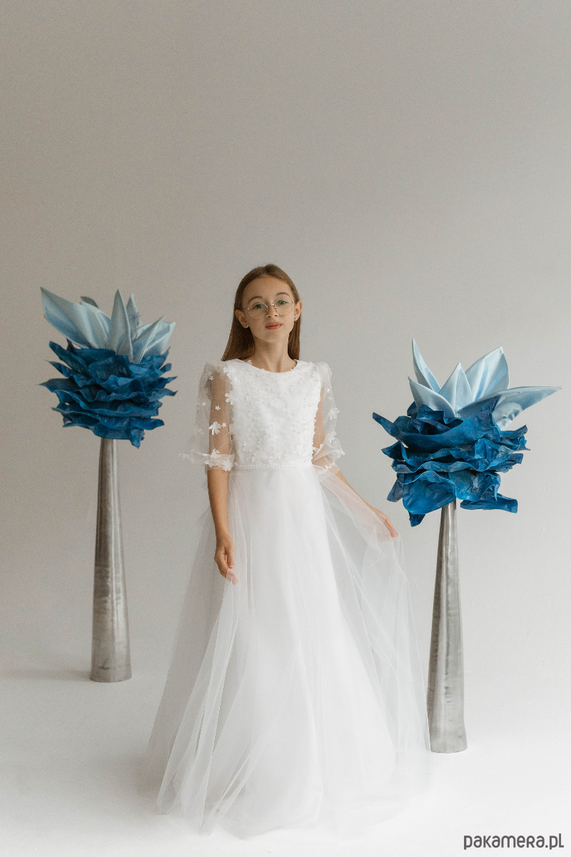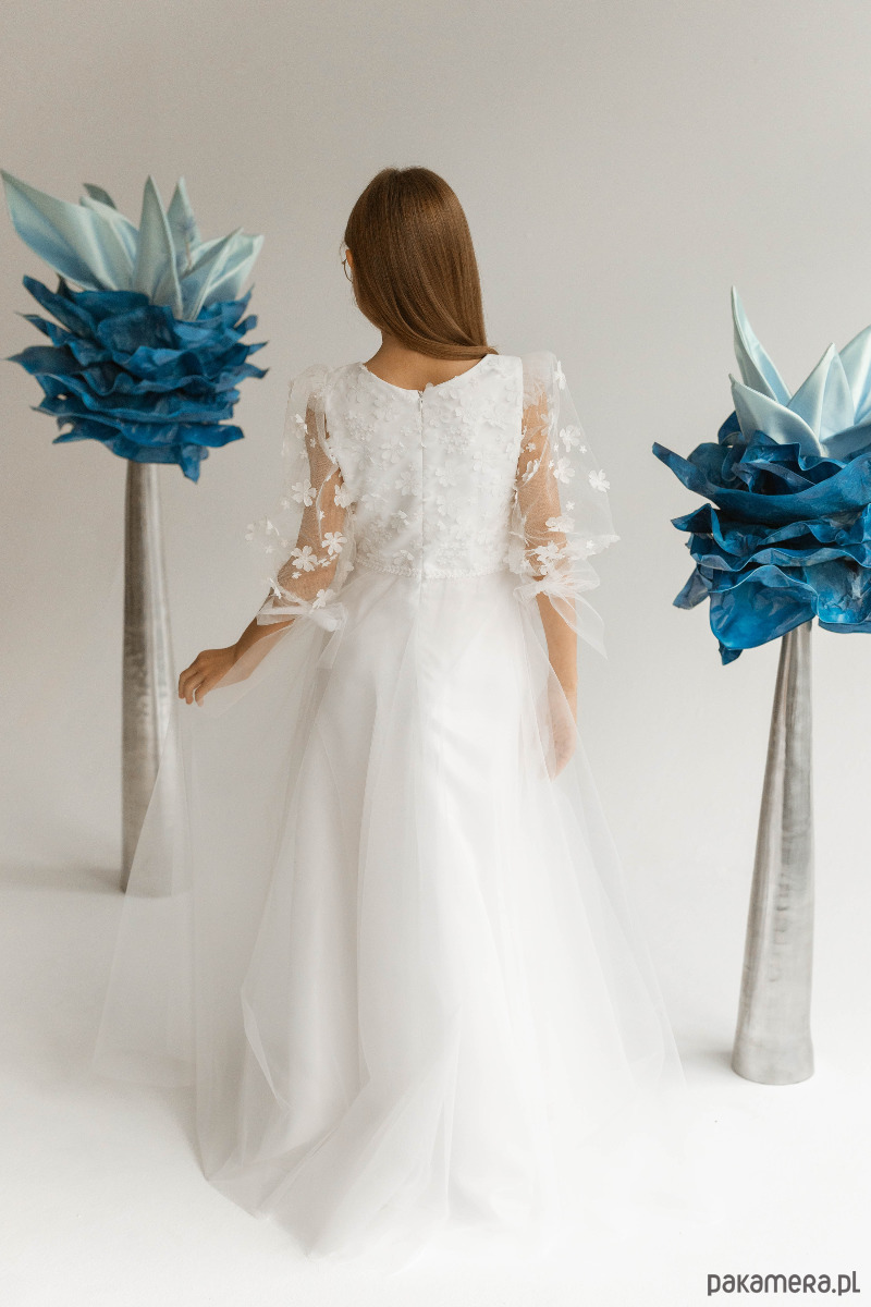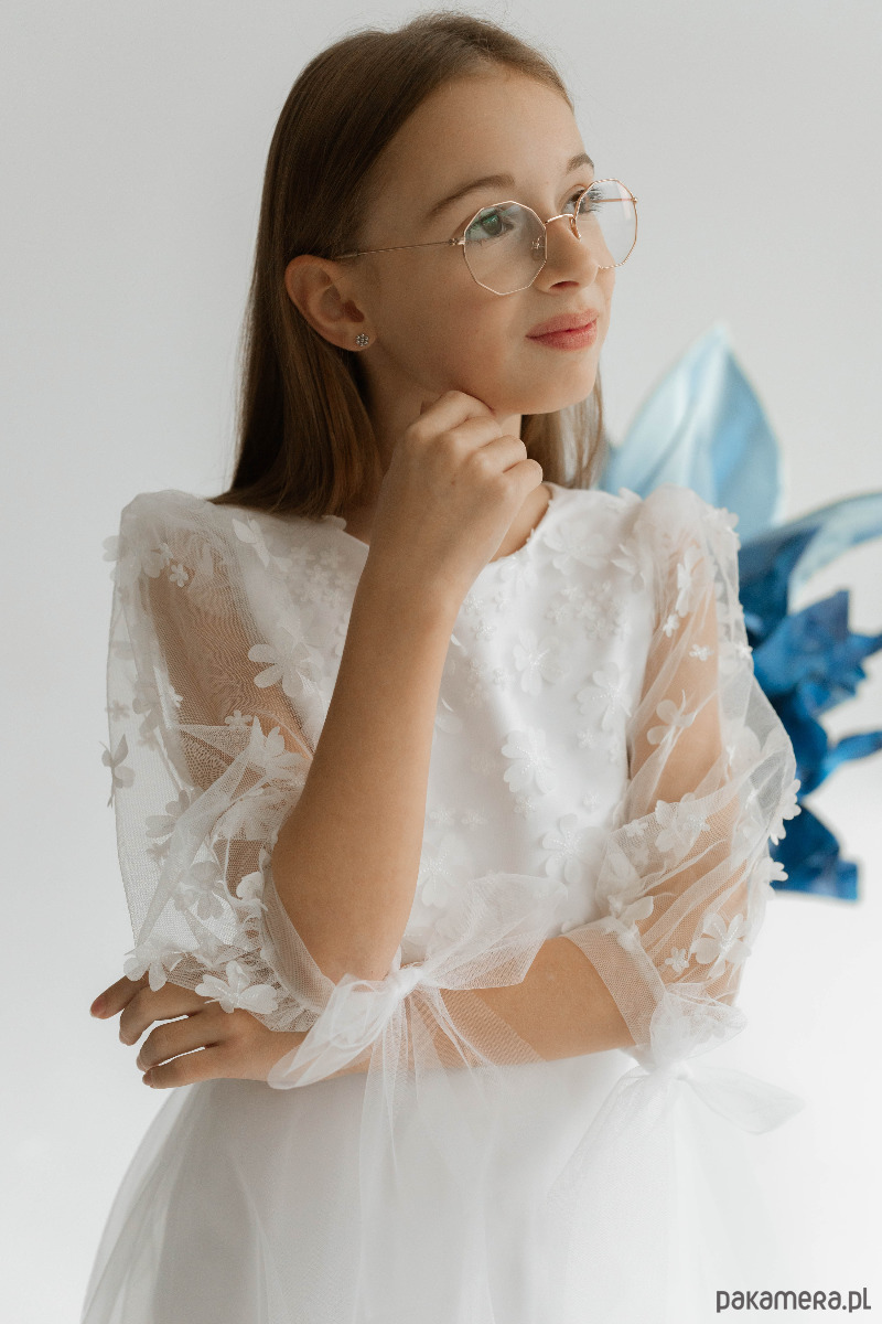 Piękna delikatna dziewczęca sukienka komunijna. Bluzeczka i rękawki wykonane z koronki z kwiatkami 3D. Rękawki zakończone tiulowymi kokardkami. Spódnica jest zwiewna, wykonana z matowego tiulu. Całość zdobi cienki paseczek, ręcznie wszyty w talii z drobnymi białymi perełkami.