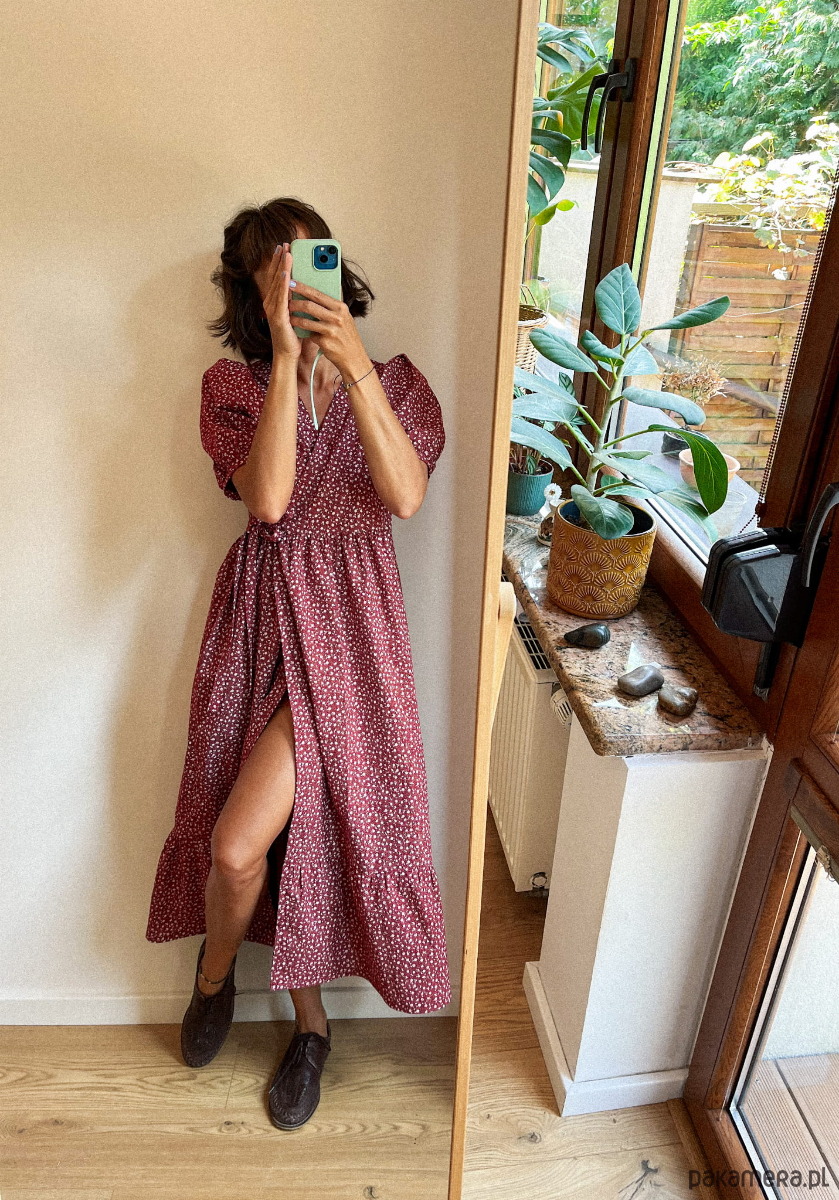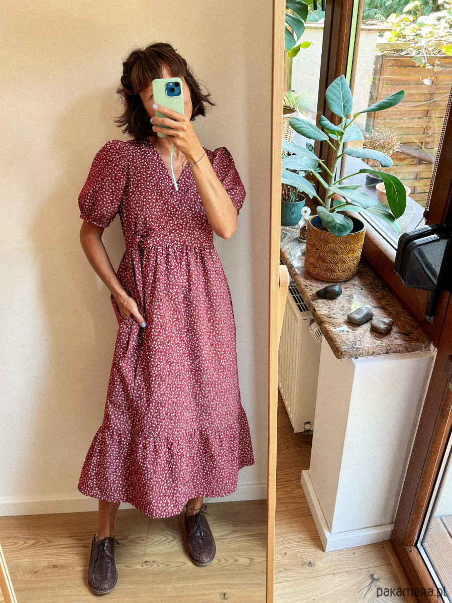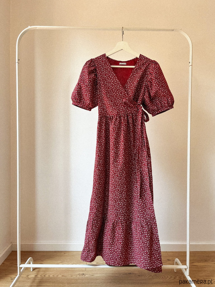 MARGARITA to urocza kopertowa sukienka z lekko bufiastymi rękawami i wiązaniem w pasie.
