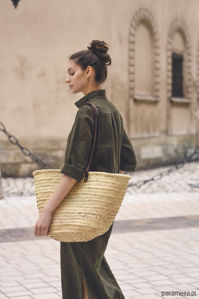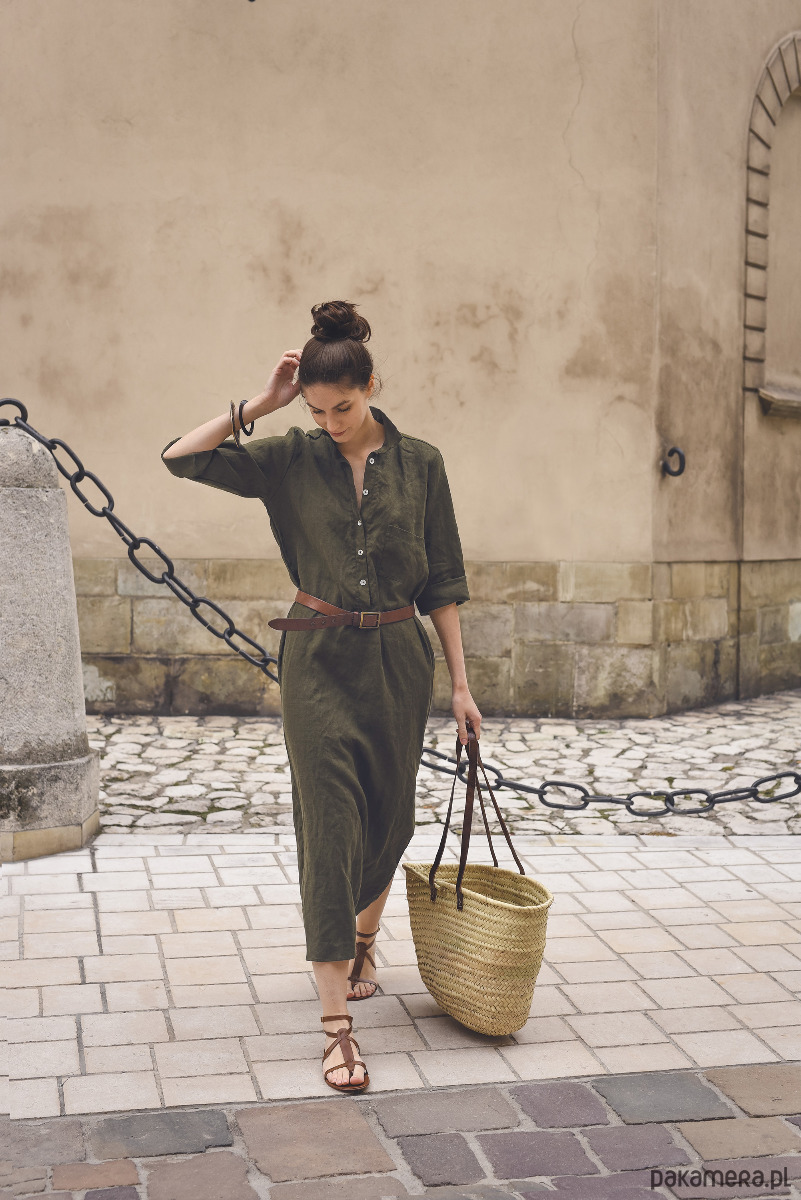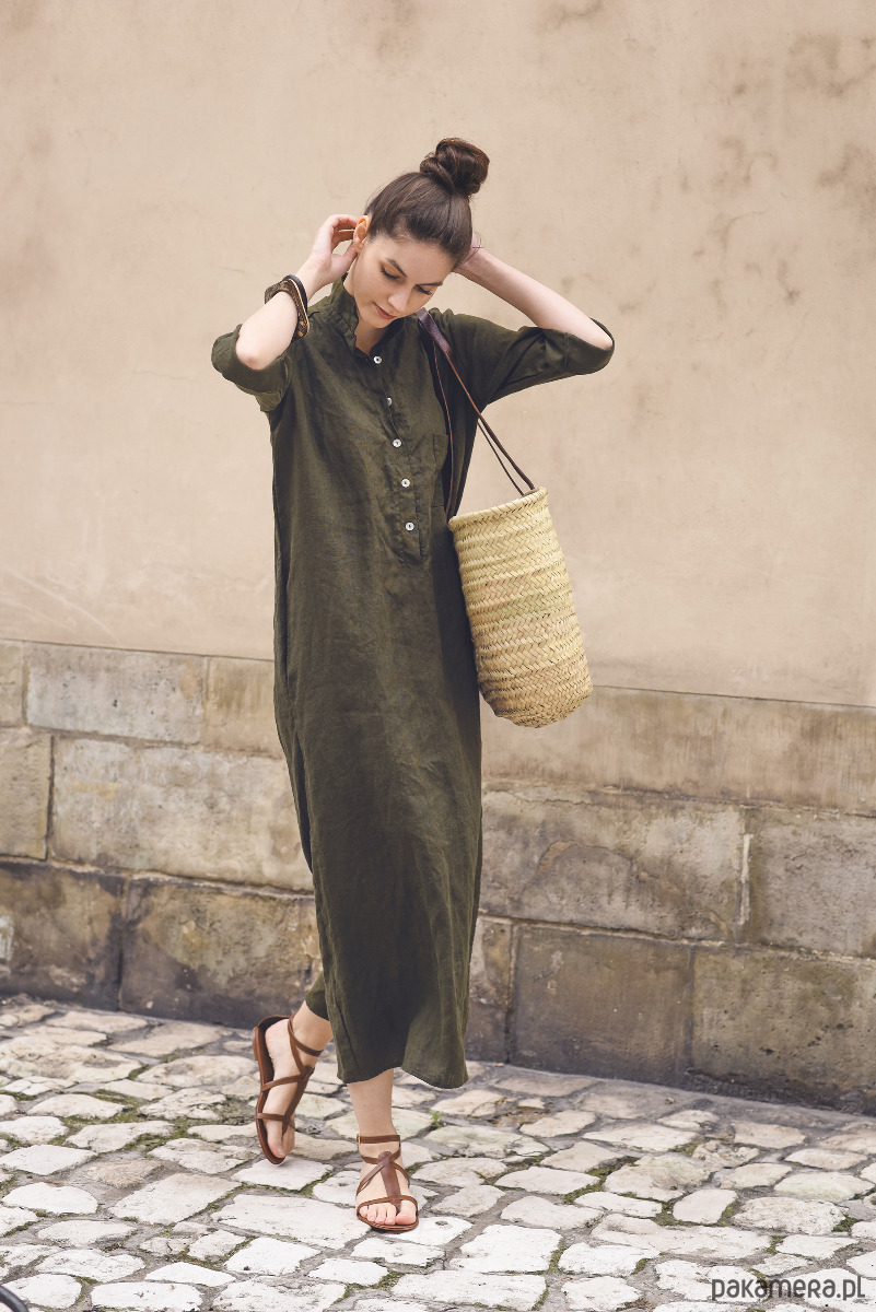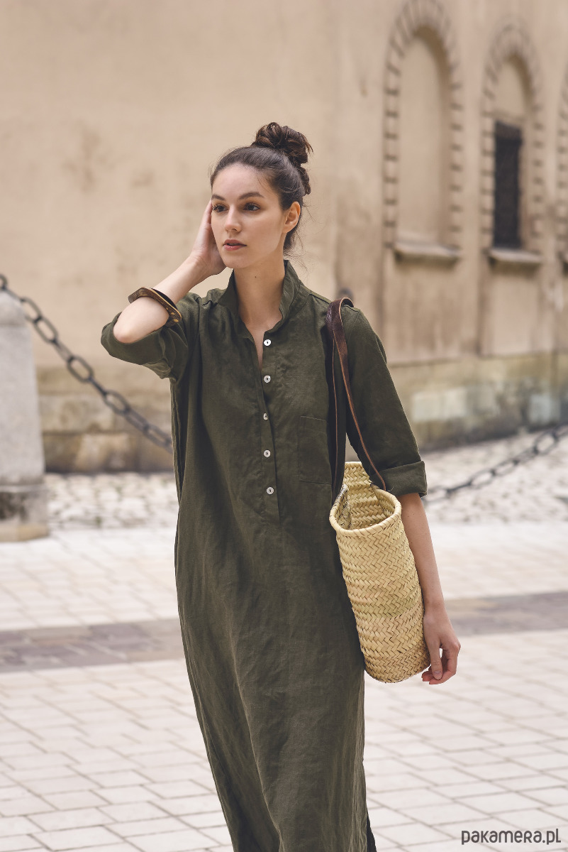 Sukienka koszulowa w kolorze khaki, uszyta jest z przyjemnej w dotyku, zmiękczanej tkaniny lnianej. Na jednym boku znajduje się rozcięcie ~35cm. Przód zapinany jest na guziczki z masy perłowej, na bokach są kieszenie.