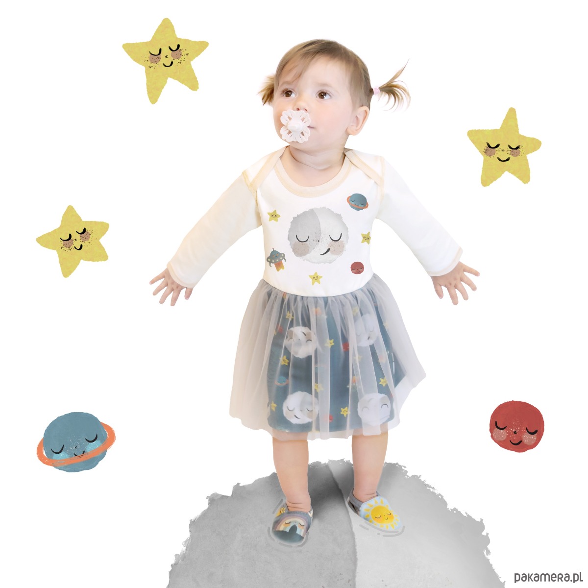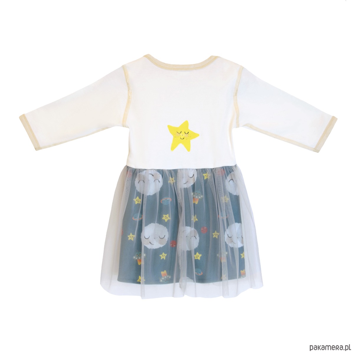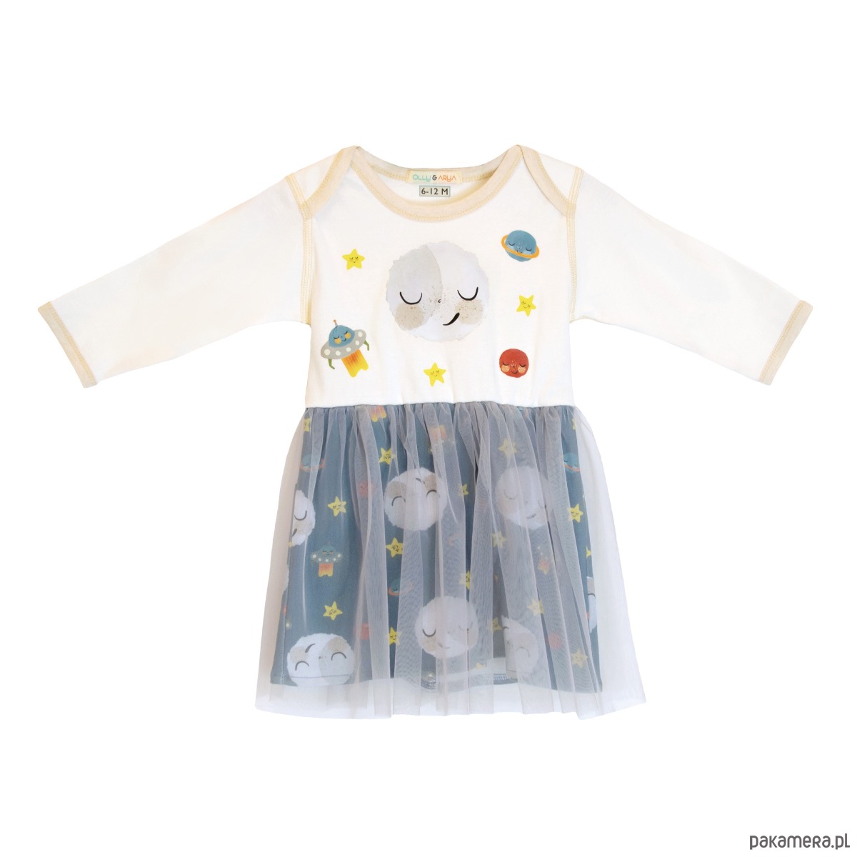 Sukienka z tiulem, z księżycem z długimi rękawami. Przód sukienki ma naszą przeniesioną ilustrację księżyca, a tył ma gwiazdkę. Spódniczka ma dwie warstwy, nasze ilustracje kosmosu cyfrowo drukowana tkanina z szarą warstwą tiulu na wierzchu. Rozmiary od 0 do 18 miesięcy mają dół body z napami. Sukienka sięga za kolana.
