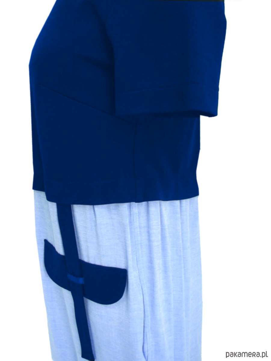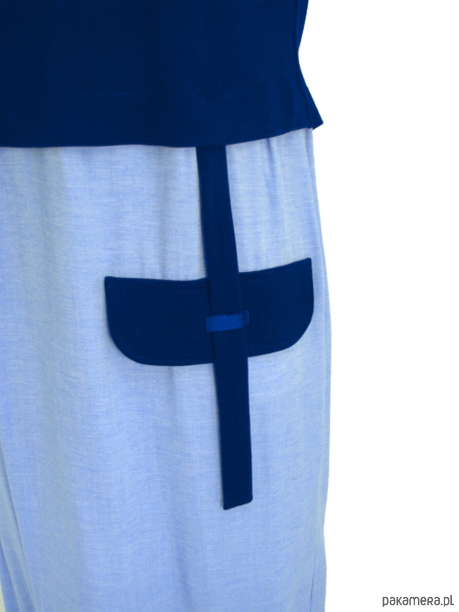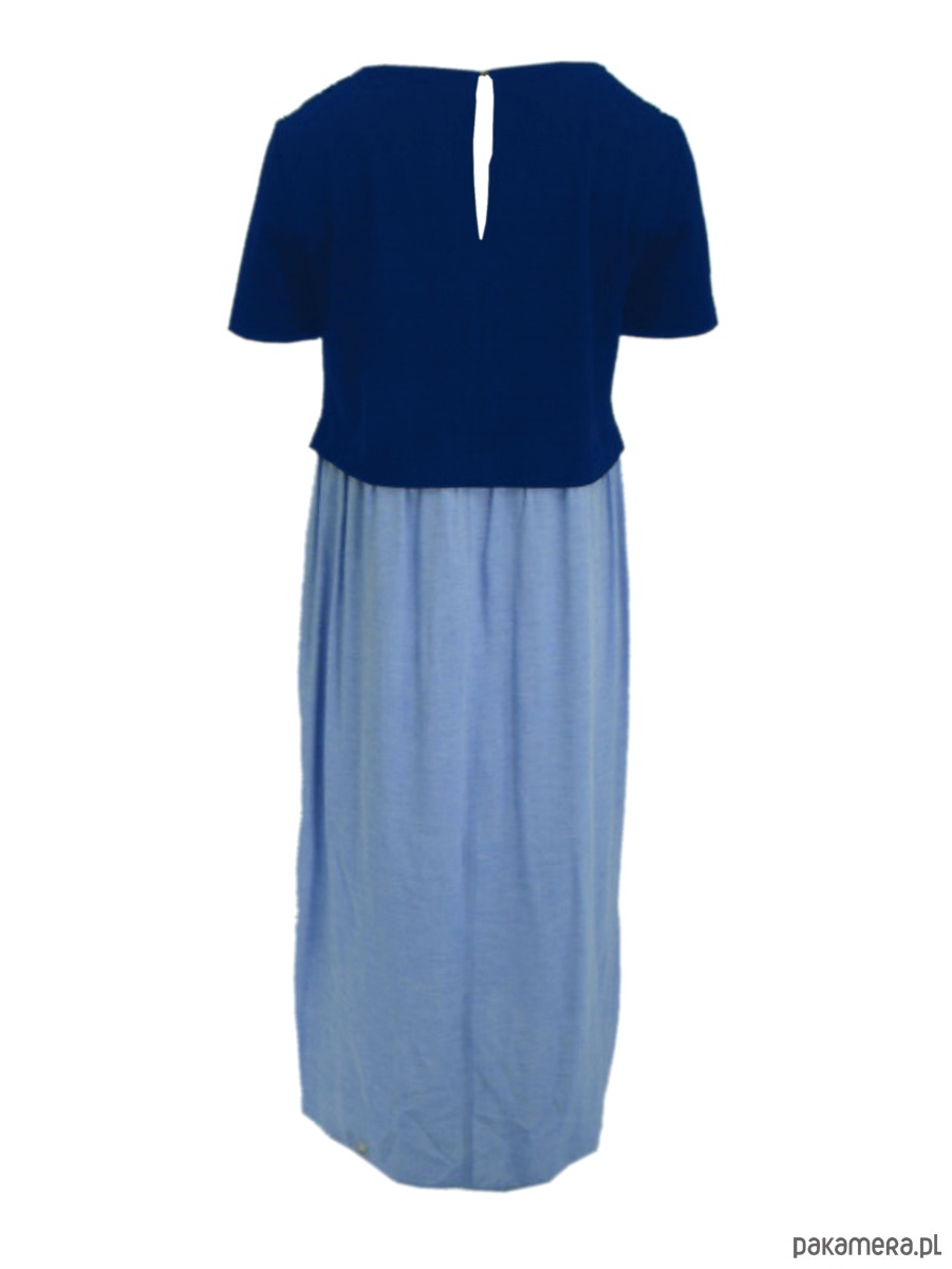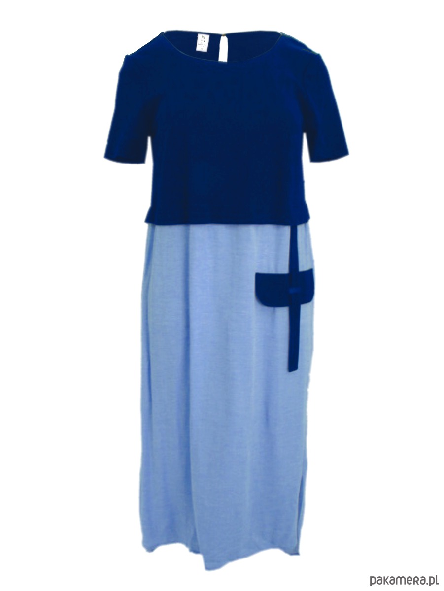 Sukienka z połączonych dzianiny i tkaniny. Sukienka doskonała na wakacyjne wyjazdy oraz na upalne lato w mieście. Sukienka luźna, do kolan, swobodna, górą z dzianiny - lekko dopasowana, dół z bawełnianej tkaniny typu oxford . Patka ozdobna na przodzie. Kieszenie na bokach, w szwach. Rękawek klasyczny.