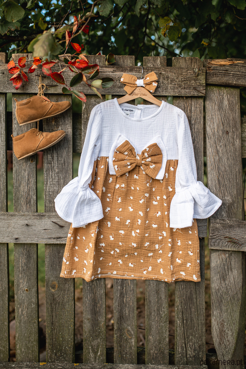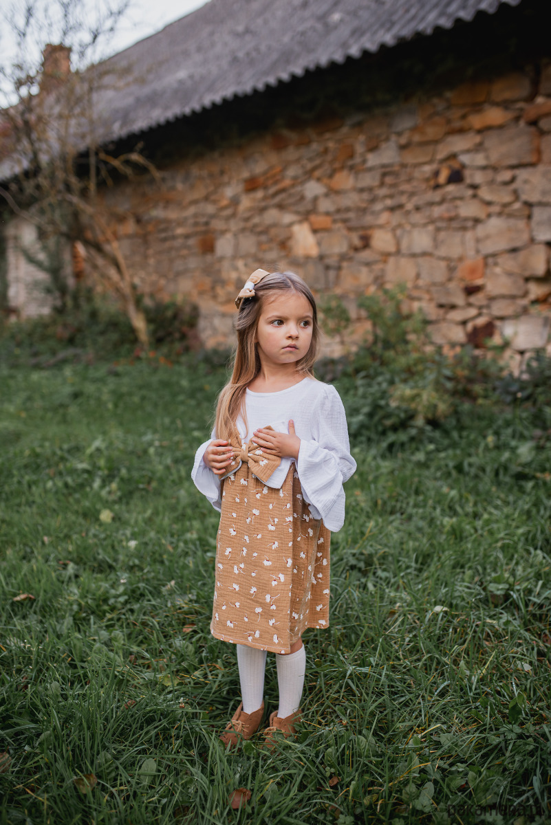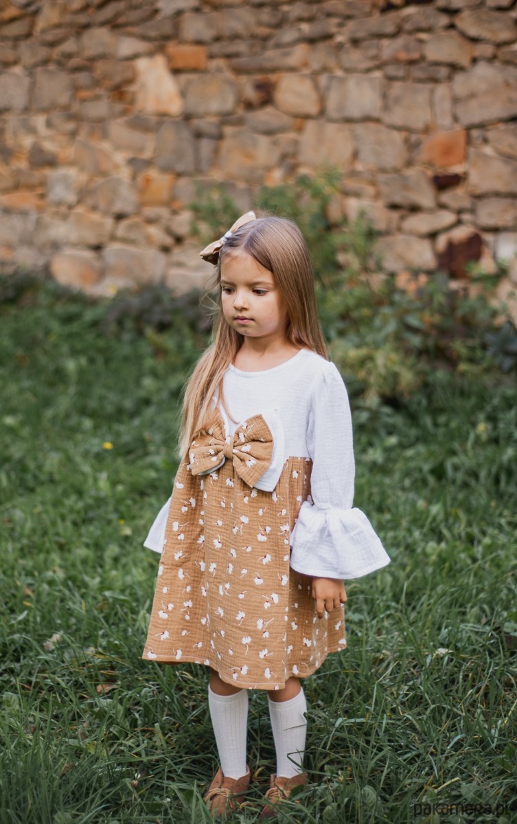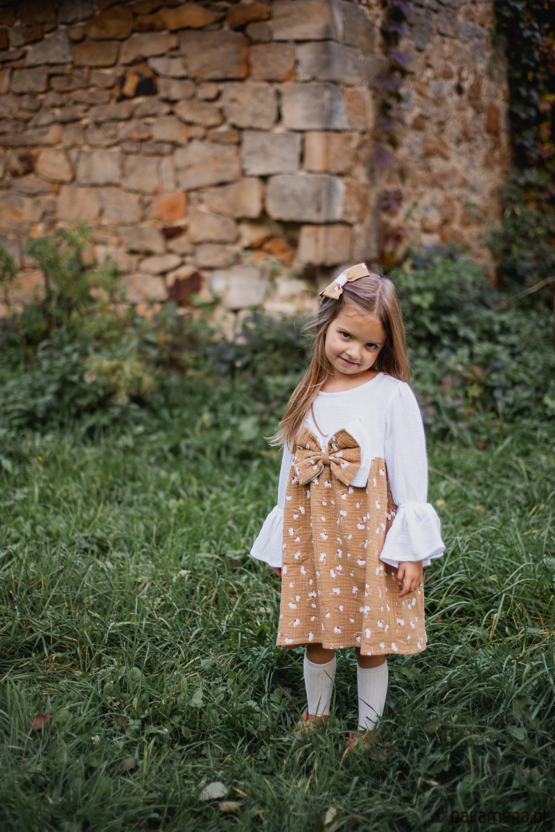 Delikatna i dziewczęca sukienka wykonana z miękkiego organicznego muślinu. Rękawki motylki oraz kokarda w pasie nadają jej niezwykłego uroku. Polecana na każdą okazję.