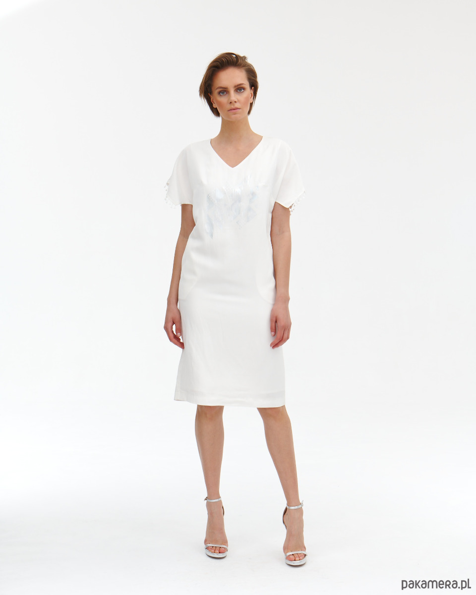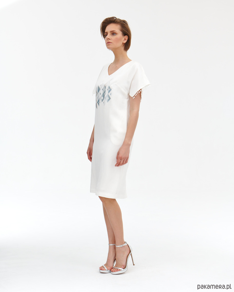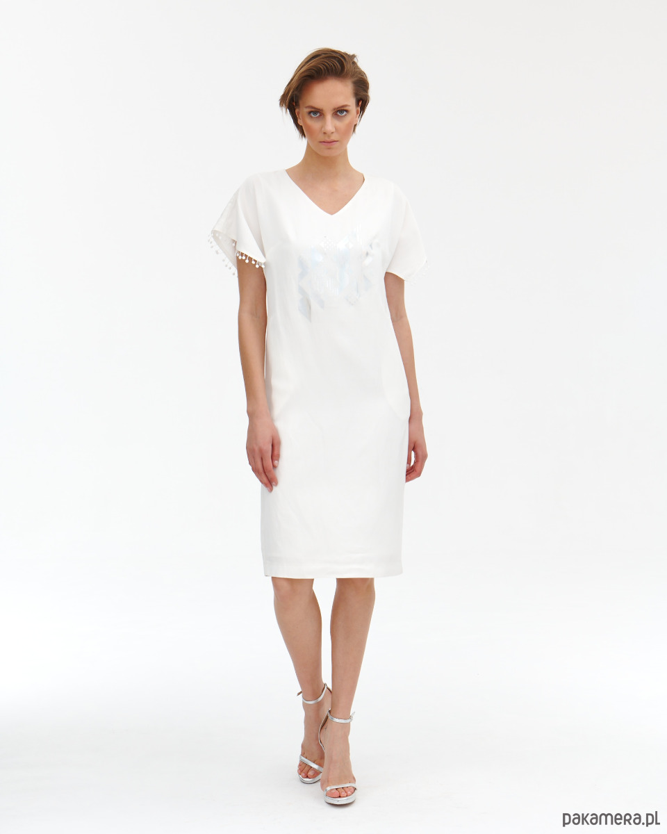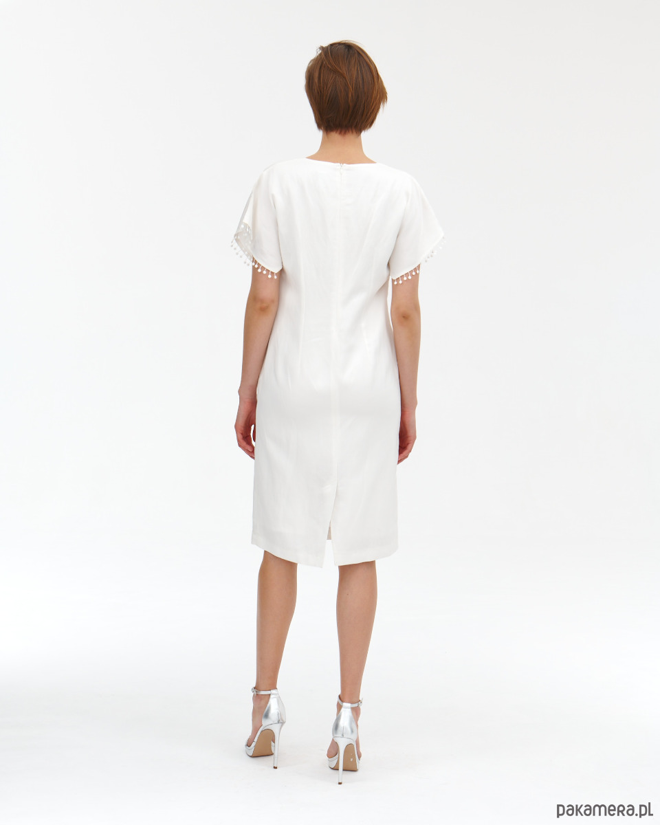 Sukienka Donna jest lekko od ciała , ponieważ jest z naturalnego lnu. Sukienka ma fantazyjne rękawki - skrzydełka wykończone gipiurowymi kuleczkami oraz ma kieszenie w bokach. Zapięcie na zamek kryty na tyle . Od środka jest wykończona wiskozową podszewką, która jest lekko eastyczna. Super szlachetna tkanina lniana z domieszką wiskozy - wysoko uszlachetniana - merceryzowana. Tkanina ma delikatna strukturę i połysk. Na przodzie delikatny opalizujący druk. Druga wersja kolorystyczna t róż - wstępna w sklepie.