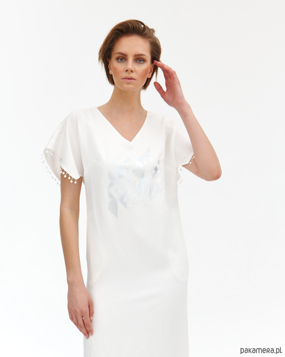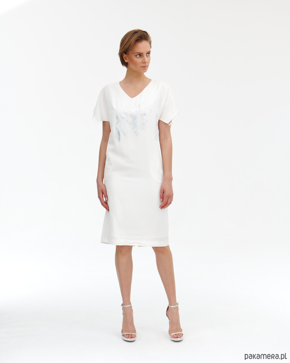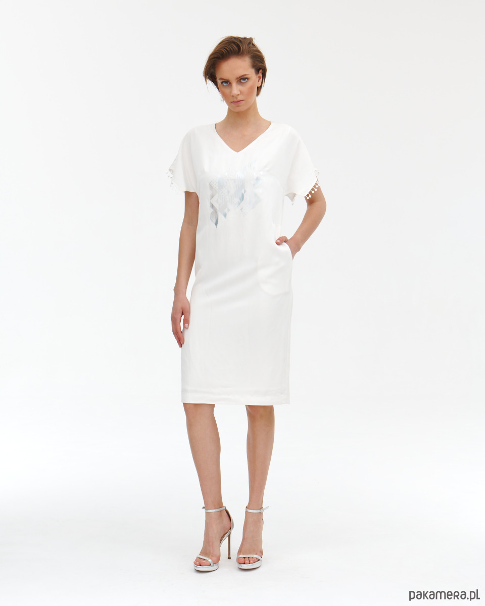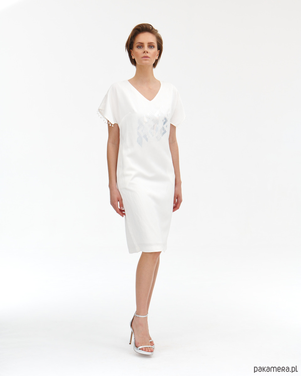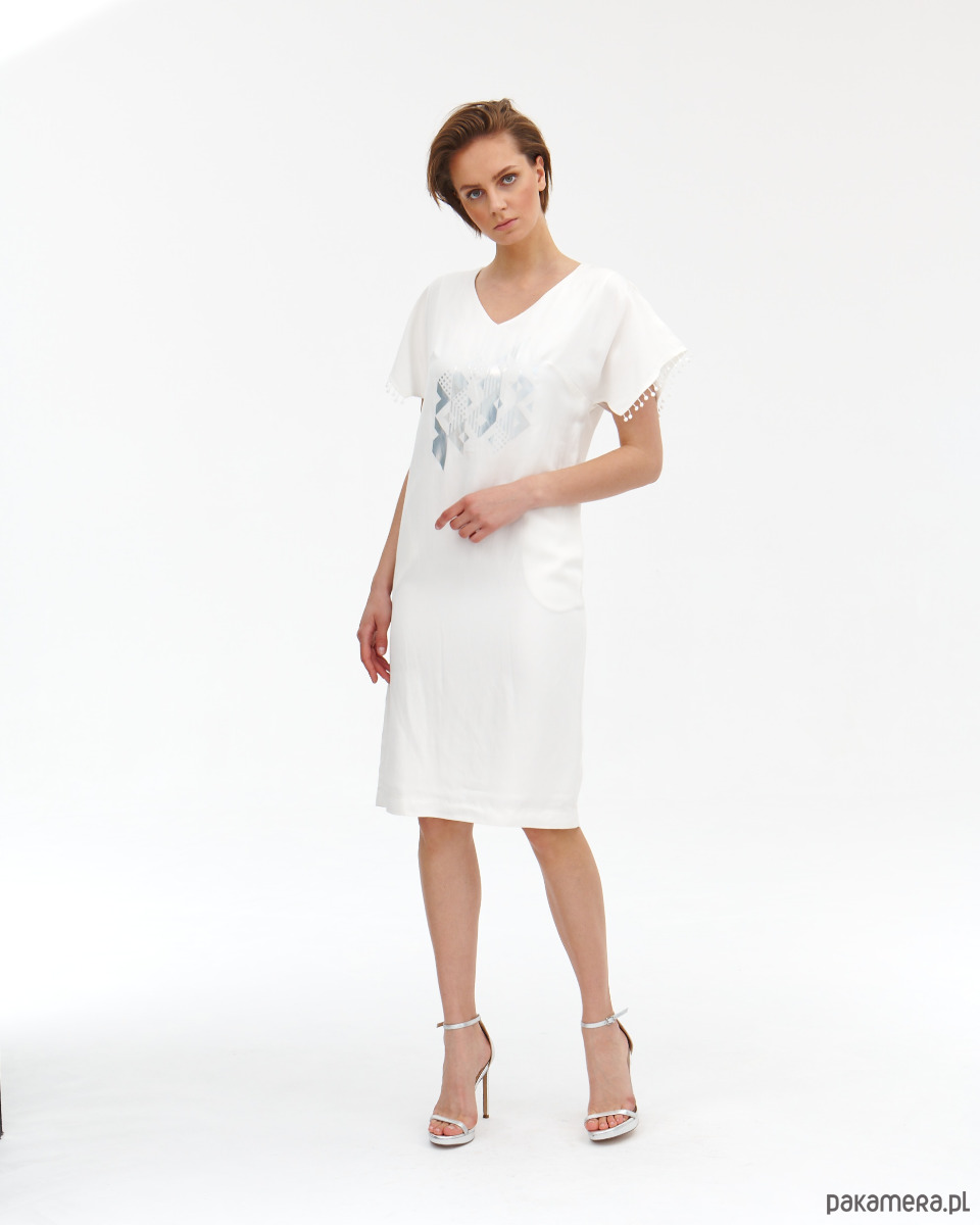 Sukienka Donna jest lekko od ciała , ponieważ jest z naturalnego lnu. Sukienka ma fantazyjne rękawki - skrzydełka wykończone gipiurowymi kuleczkami oraz ma kieszenie w bokach. Zapięcie na zamek kryty na tyle . Od środka jest wykończona wiskozową podszewką, która jest lekko eastyczna. Super szlachetna tkanina lniana z domieszką wiskozy - wysoko uszlachetniana - merceryzowana. Tkanina ma delikatna strukturę i połysk. Na przodzie delikatny opalizujący druk. Druga wersja kolorystyczna t róż - wstępna w sklepie.