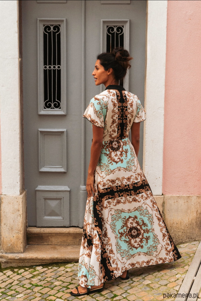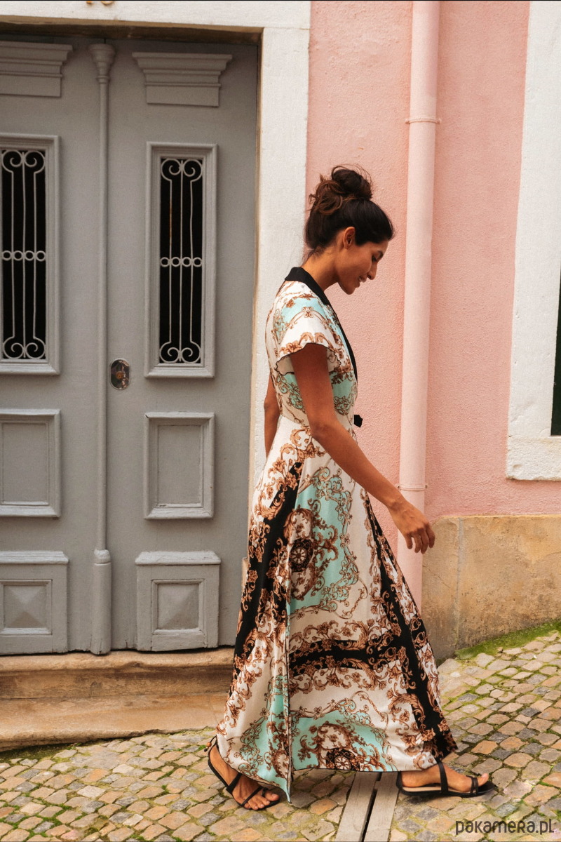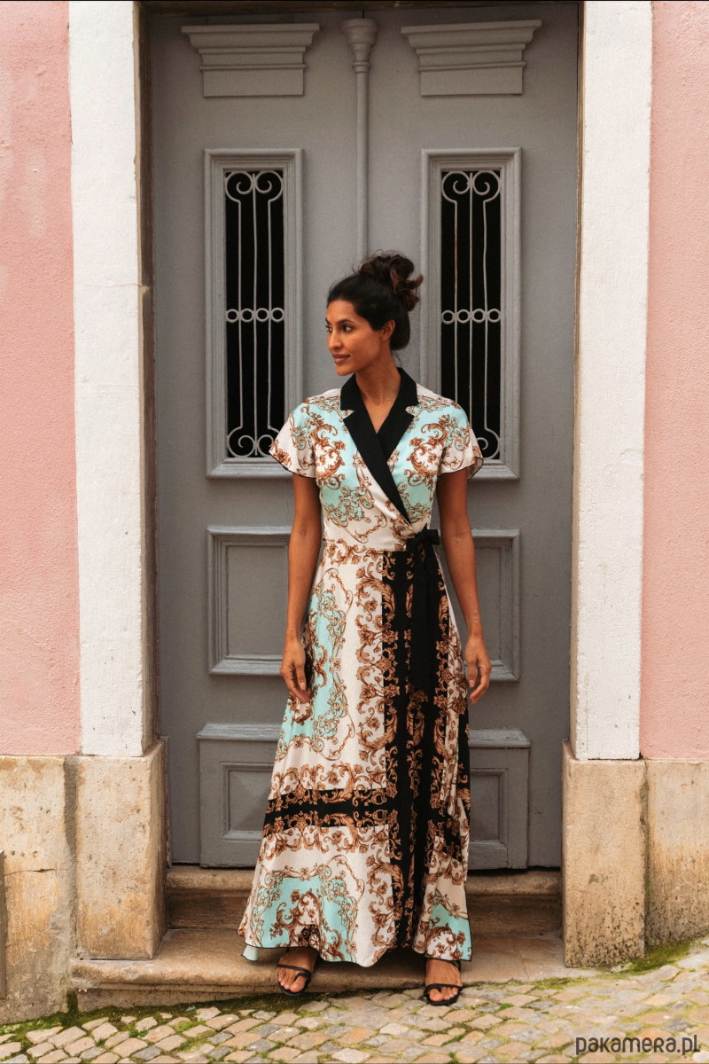 Nawet nie wiemy, od czego tu zacząć, bo ta sukienka to po prostu sztos. Ma krótki, lekko rozkloszowany rękaw, kopertowe rozwiązanie w dekolcie oraz pasek do zawiązania koperty z boku. To ostatnie oznacza, że można ją idealnie dopasować do sylwetki. Całość tkaniny to przepiękny, chustowy wzór w kolorze orientalnej mięty, z przenikającymi ją czarnymi elementami. I właśnie po to, żeby podkreślić te kontrasty, dekolt inspirowany jest w LIGURII marynarką z czarnymi “klapami”. Reasumując: nic innego nam nie przychodzi do głowy jak sznyt i elegancja. A Ty jak uważasz?