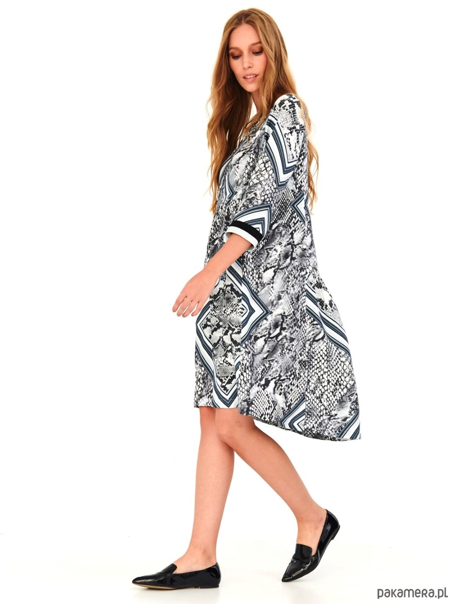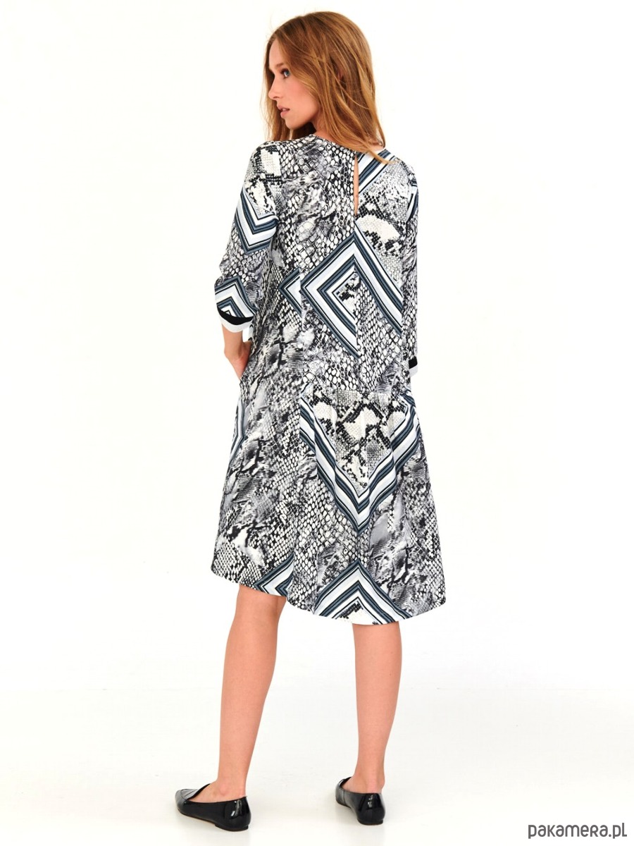 Dziewczęca i zwiewna sukienka . Rozkloszowany, zwiewny krój z doszytą na dole falbaną i rozkloszowanym tyłem . Dekolt okrągły, zapinany na guziczek. Pasek do zawiązania. Kieszenie w szwach bocznych. Autorski druk w drobne kwiaty kwiaty.