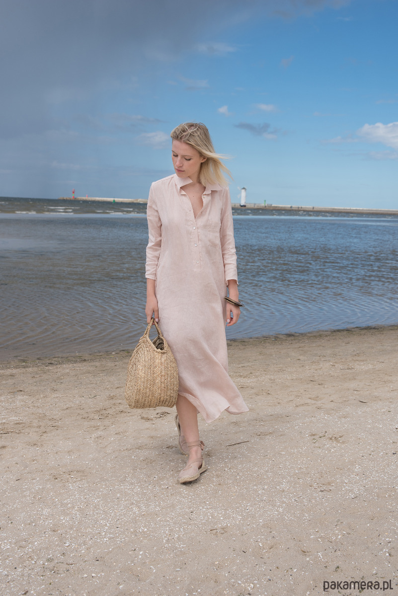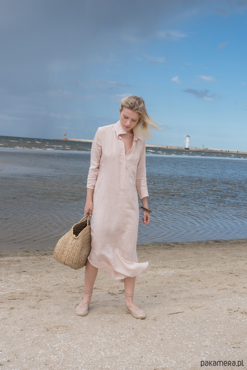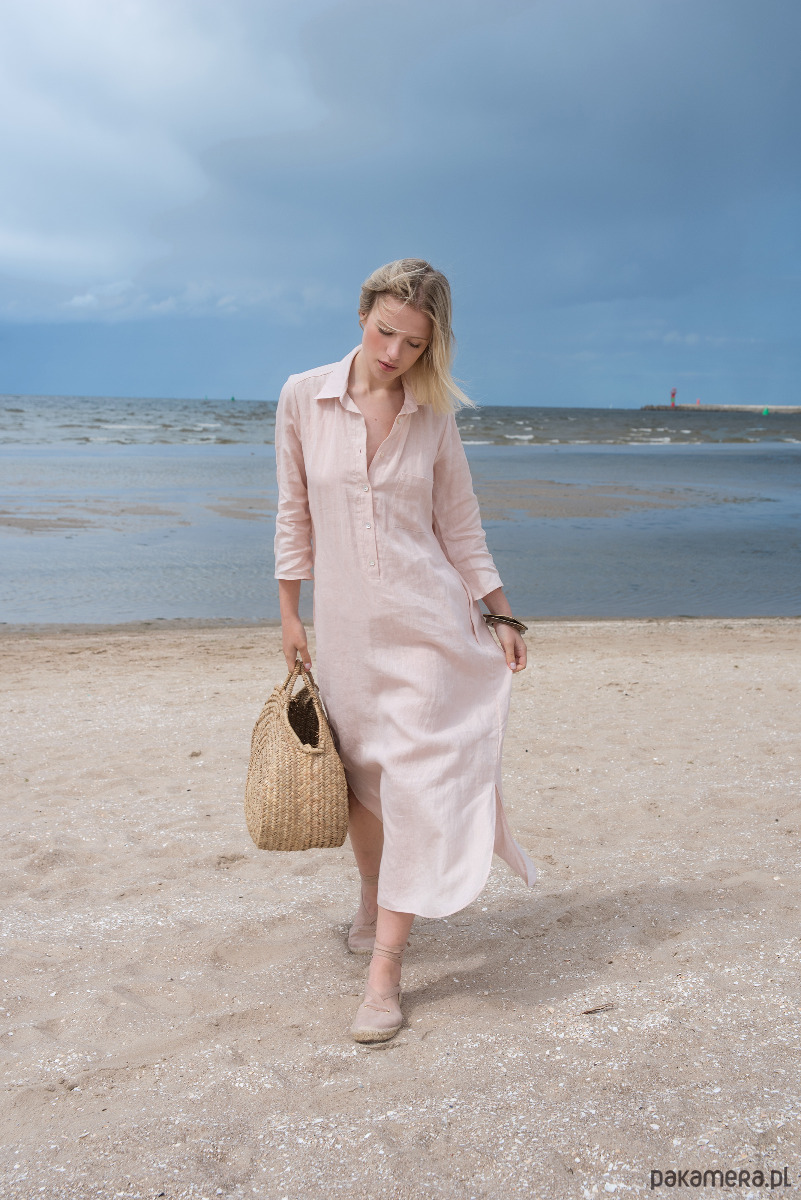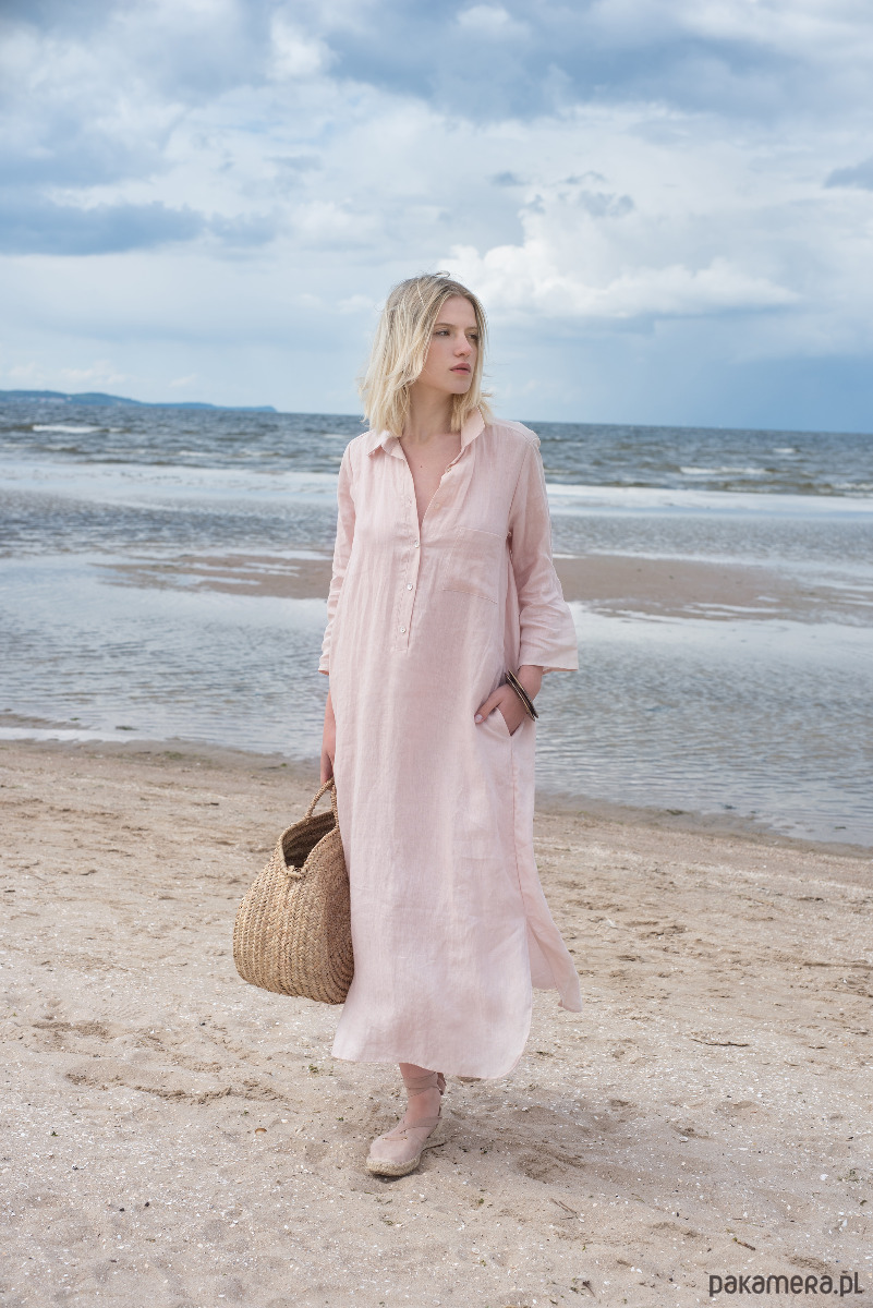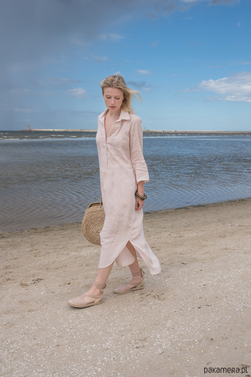 Lniana sukienka koszulowa ze stójką w rozmiarze S i M, uszyta jest z przyjemnej w dotyku, zmiękczanej tkaniny lnianej w kolorze brudnego różu. Po bokach znajdują się lekko zaokrąglone rozcięcia na wysokości ~30cm. Przód zapinany jest na guziczki z masy perłowej, bo bokach są kieszenie.