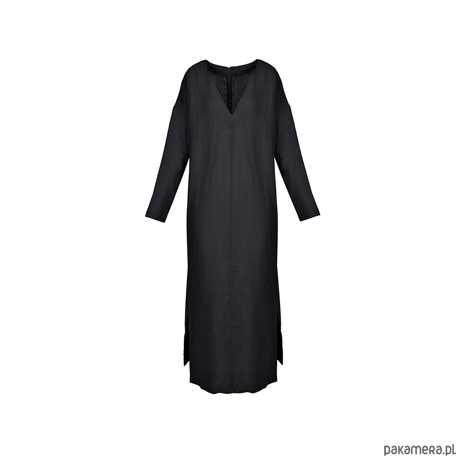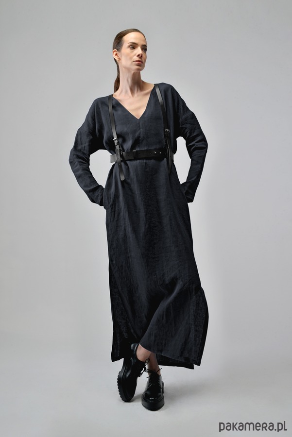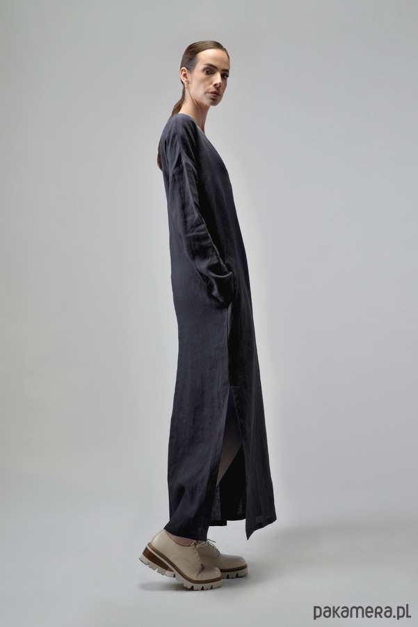Sukienka maxi o prostym kroju z długim rękawem jest idealną propozycją na cieplejsze dni. Absolutnie minimalistyczna, ma zatem nieograniczony potencjał do tworzenia bliskich naszemu sercu stylizacji. Z paskiem, ciężkimi butami, bez paska z sandałami lub sneakersami. Dekolt w kształcie litery V optycznie wydłuża szyję i eksponuje obojczyki. Rozcięcia po bokach subtelnie odsłaniają nogi i nadają sylwetce lekkości.
