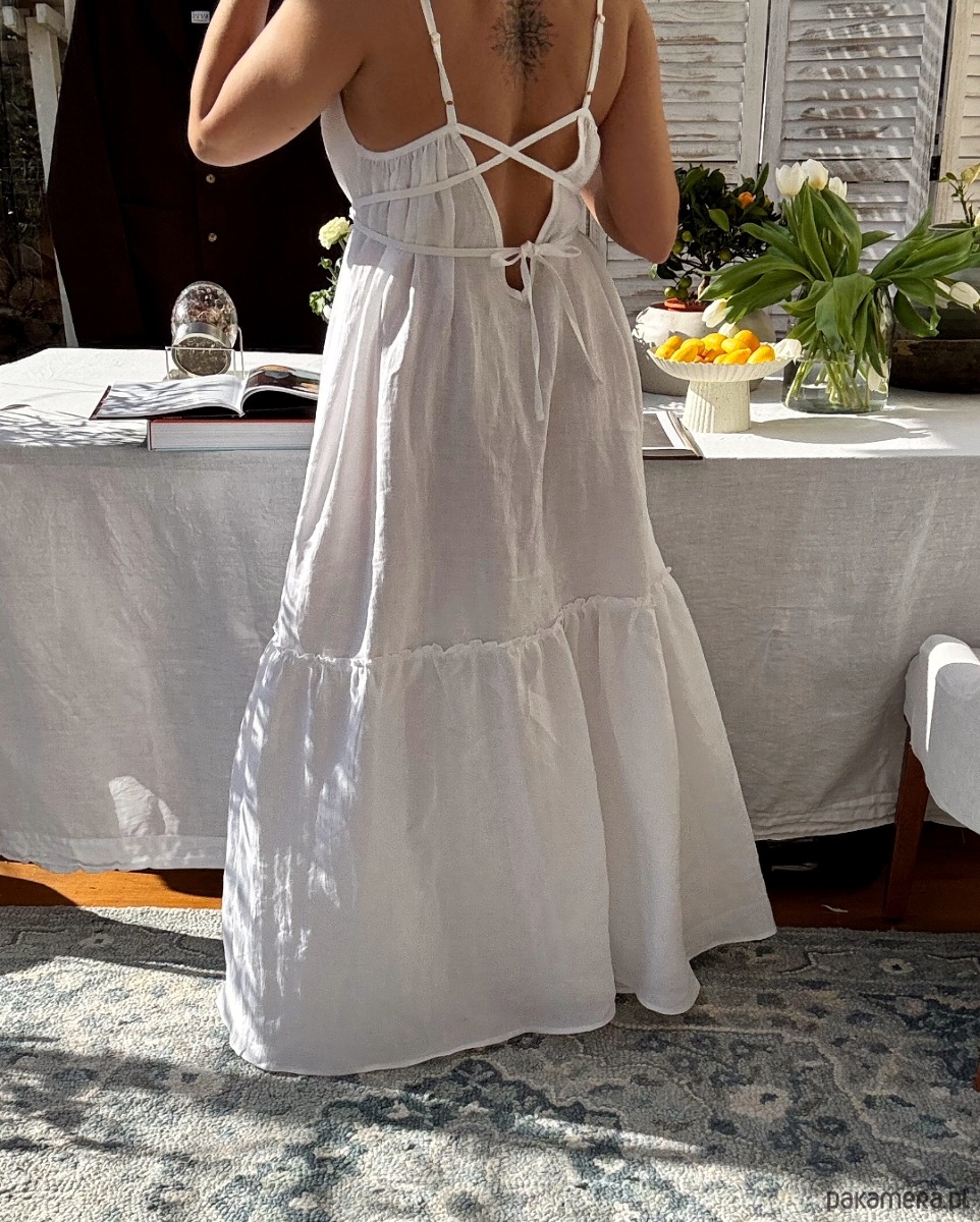 Model posiada cienkie, regulowane ramiączka oraz subtelnie uformowaną górę z marszczeniem w okolicy biustu, które nadaje sukience miękkiego dopasowania do sylwetki. Otwarta linia pleców podkreśla letni charakter projektu.