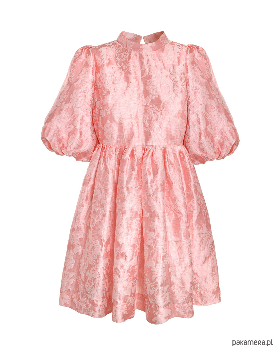 Sukienka mini (przed kolano) z bufiastymi, krótkimi rękawami w kolorze kremowej bieli. Uszyta z z przepięknej żakardowej tkaniny w ornamentalny wzór z motywem kwiatowym , całość odszyta od spodu wizkozową podszewką. Z tyłu zapinana na kryty zamek. Dekolt wykończony małą stójką.