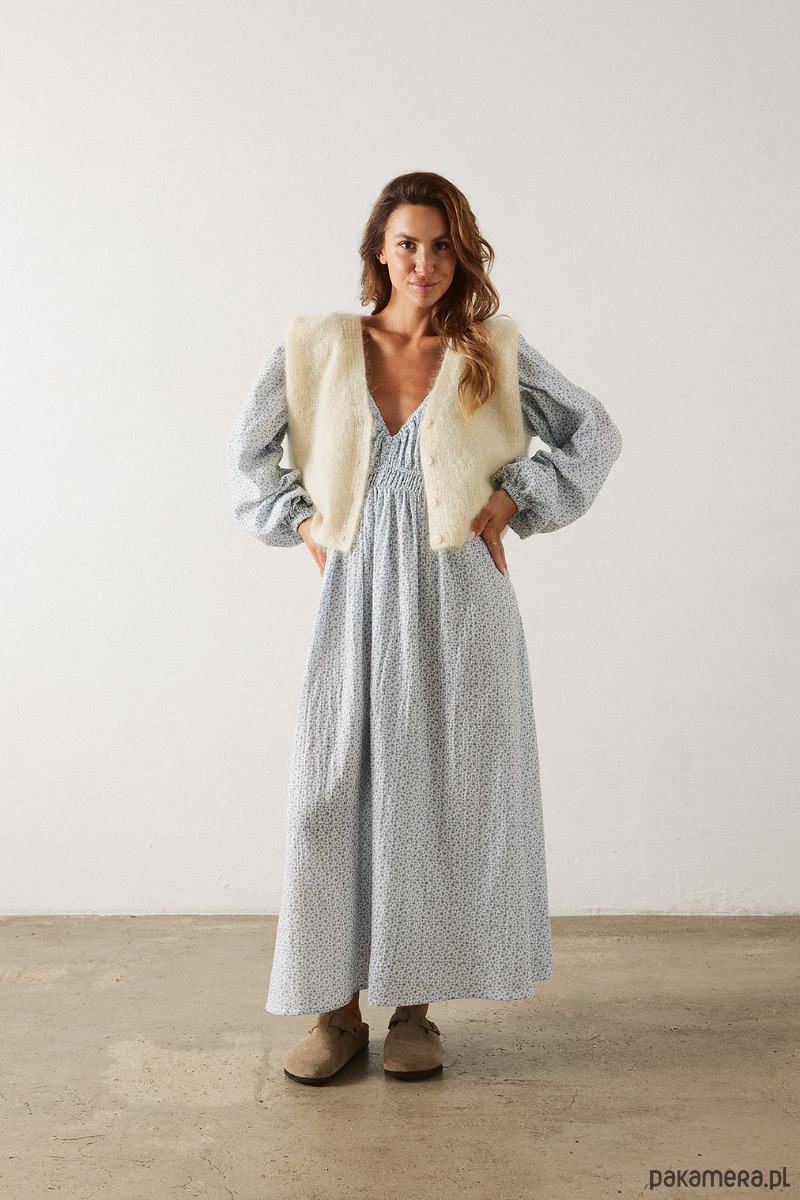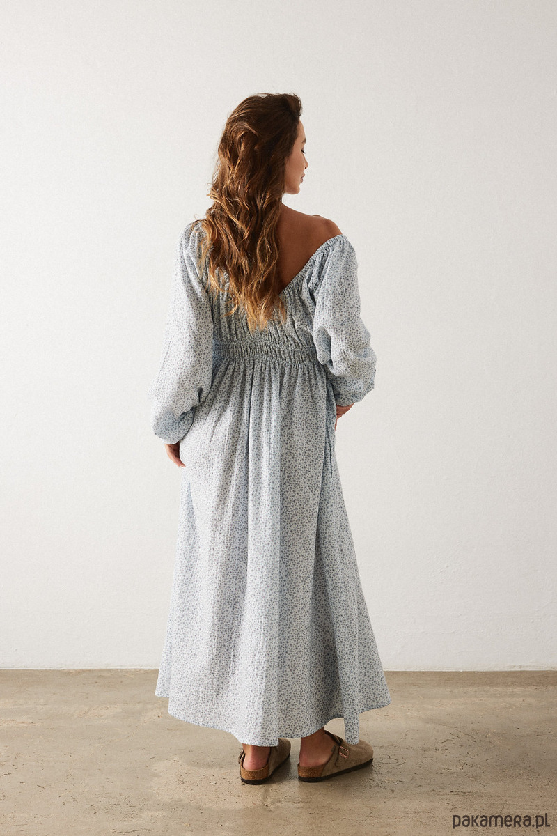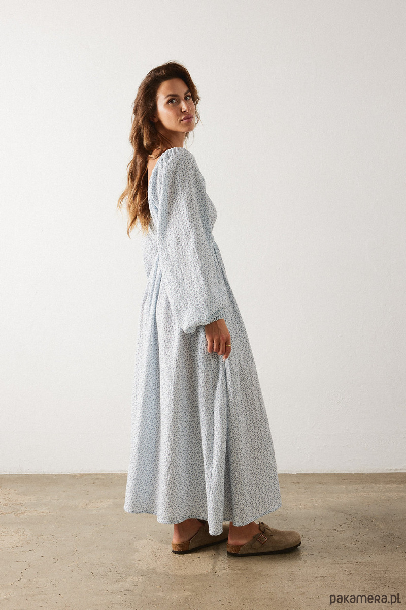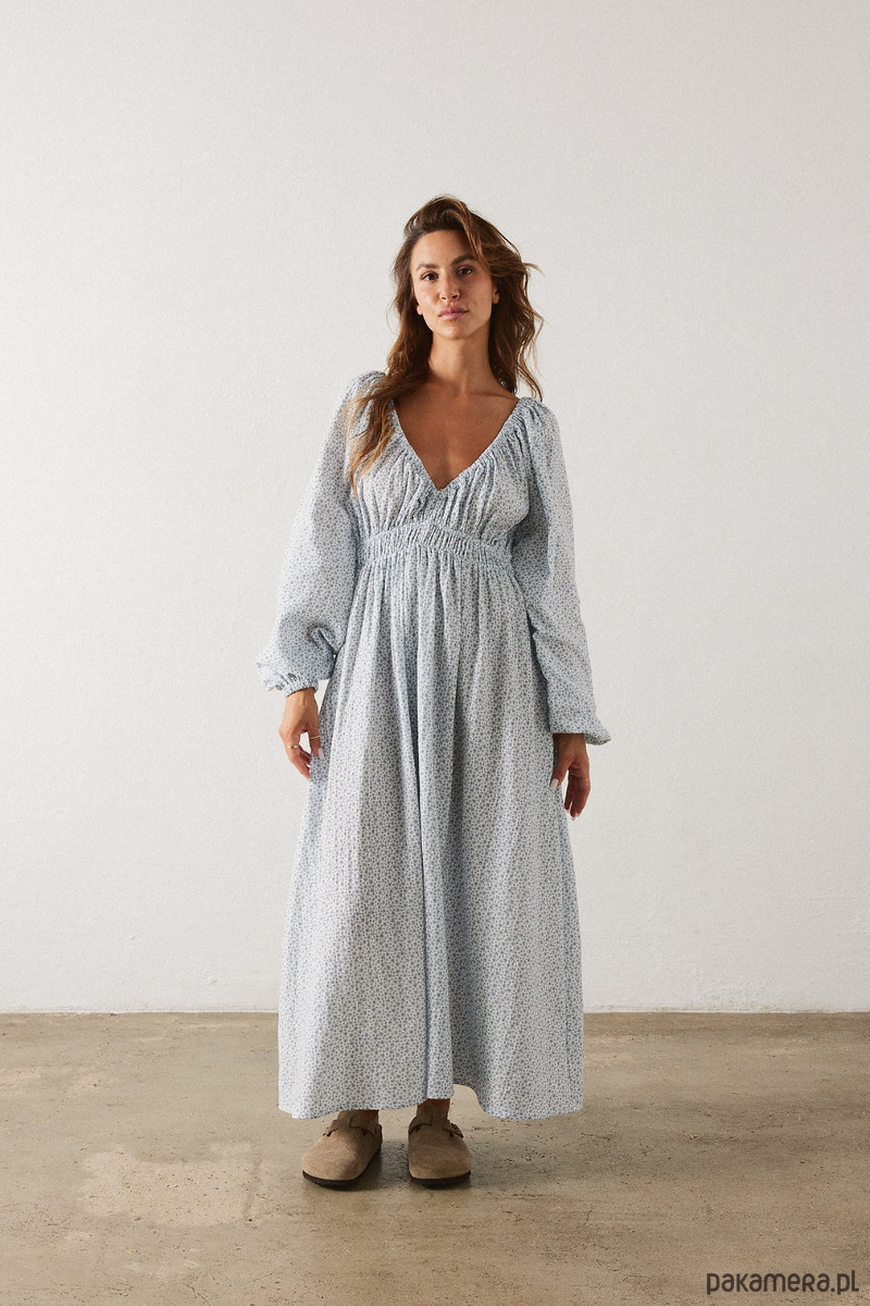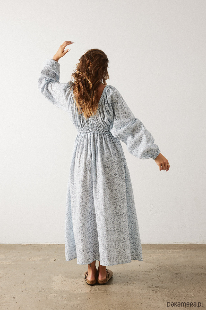 Długa muślinowa sukienka z pięknym głębokim dekoltem V z z przodu i z tyłu. Z przodu sukienka posiada niewidoczny mały guzik dzięki któremu można delikatnie "zmniejszyć głębokość" dekoltu. Sukienka wygląda niezwykle zjawiskowo i jest dopracowana w każdym calu, gumy w talii, na ramionach i w nadgarstkach są miękkie i nie cisną a jednocześnie trzymają się tam gdzie powinny. Noś z japonkami lub sneakersami.
