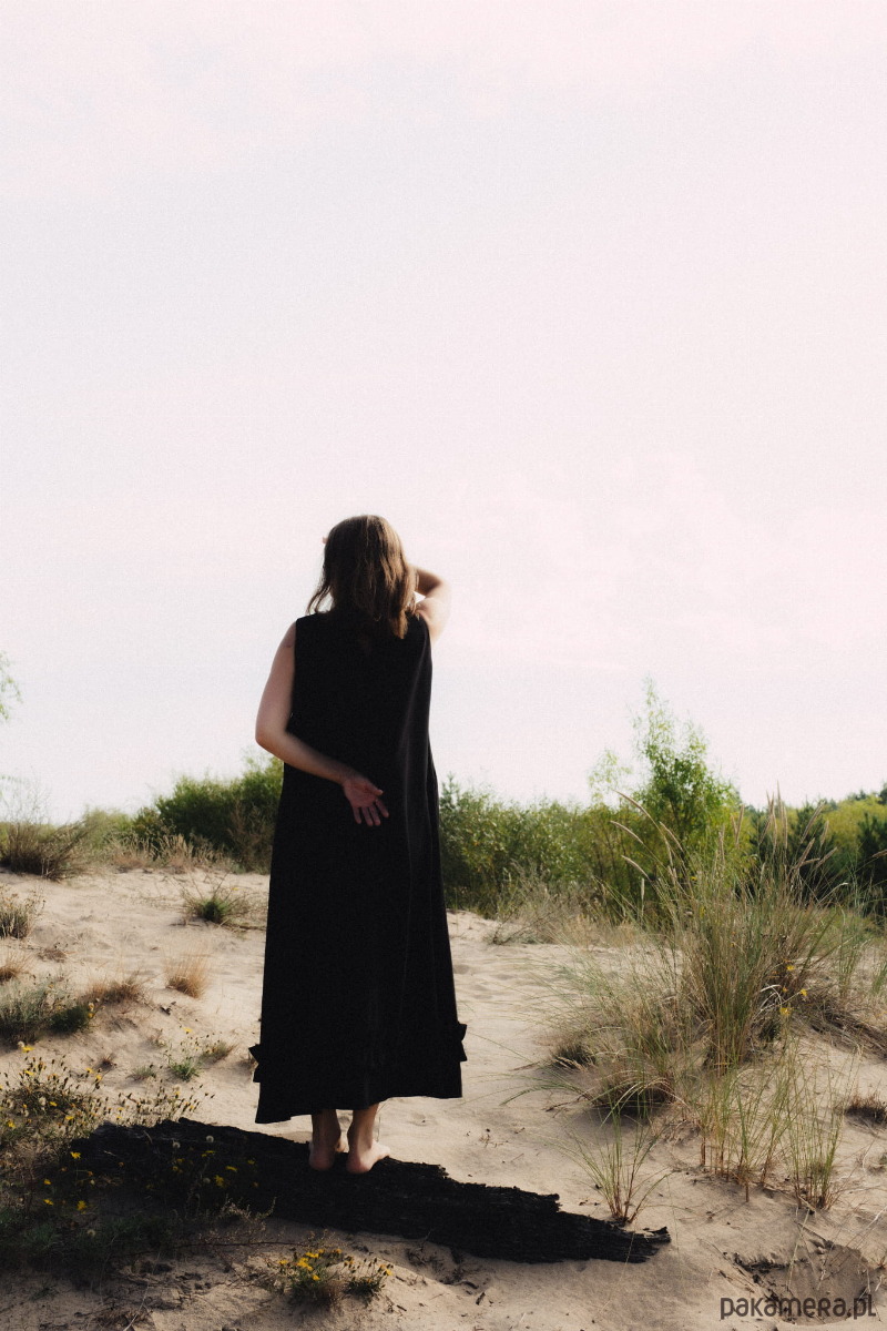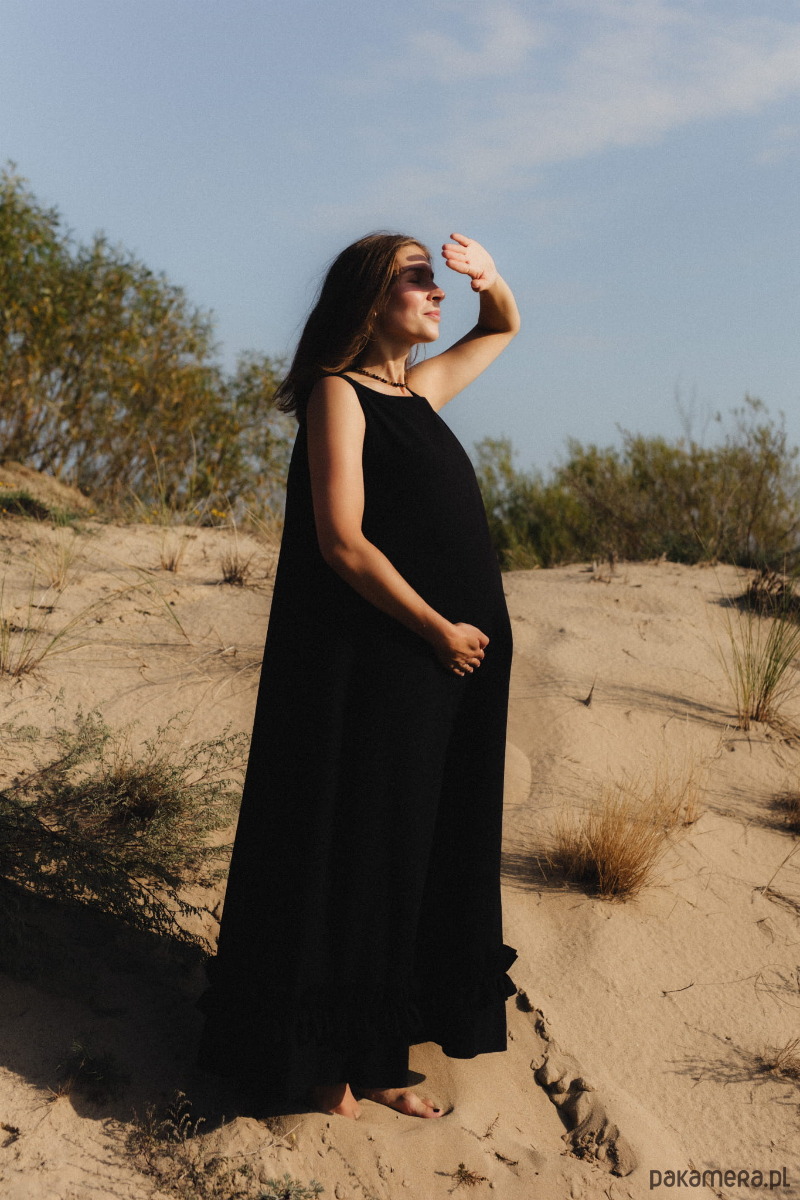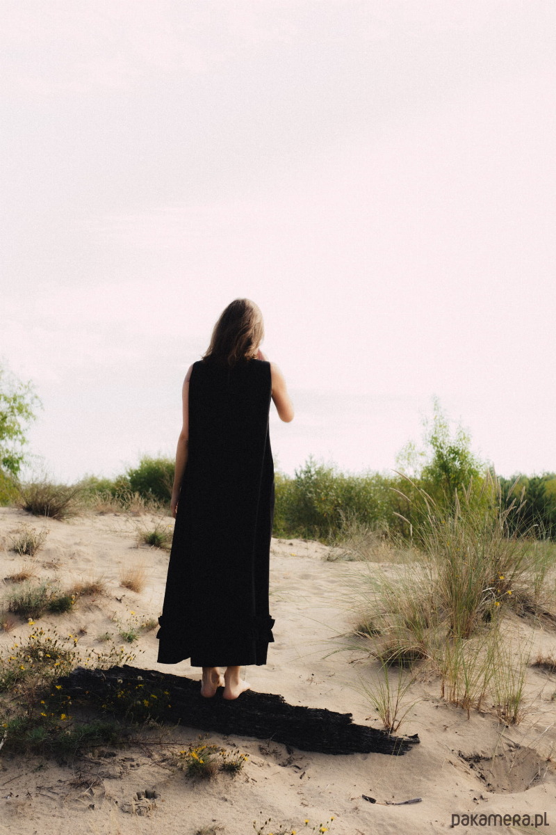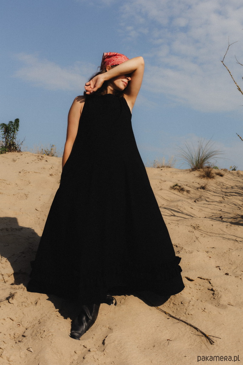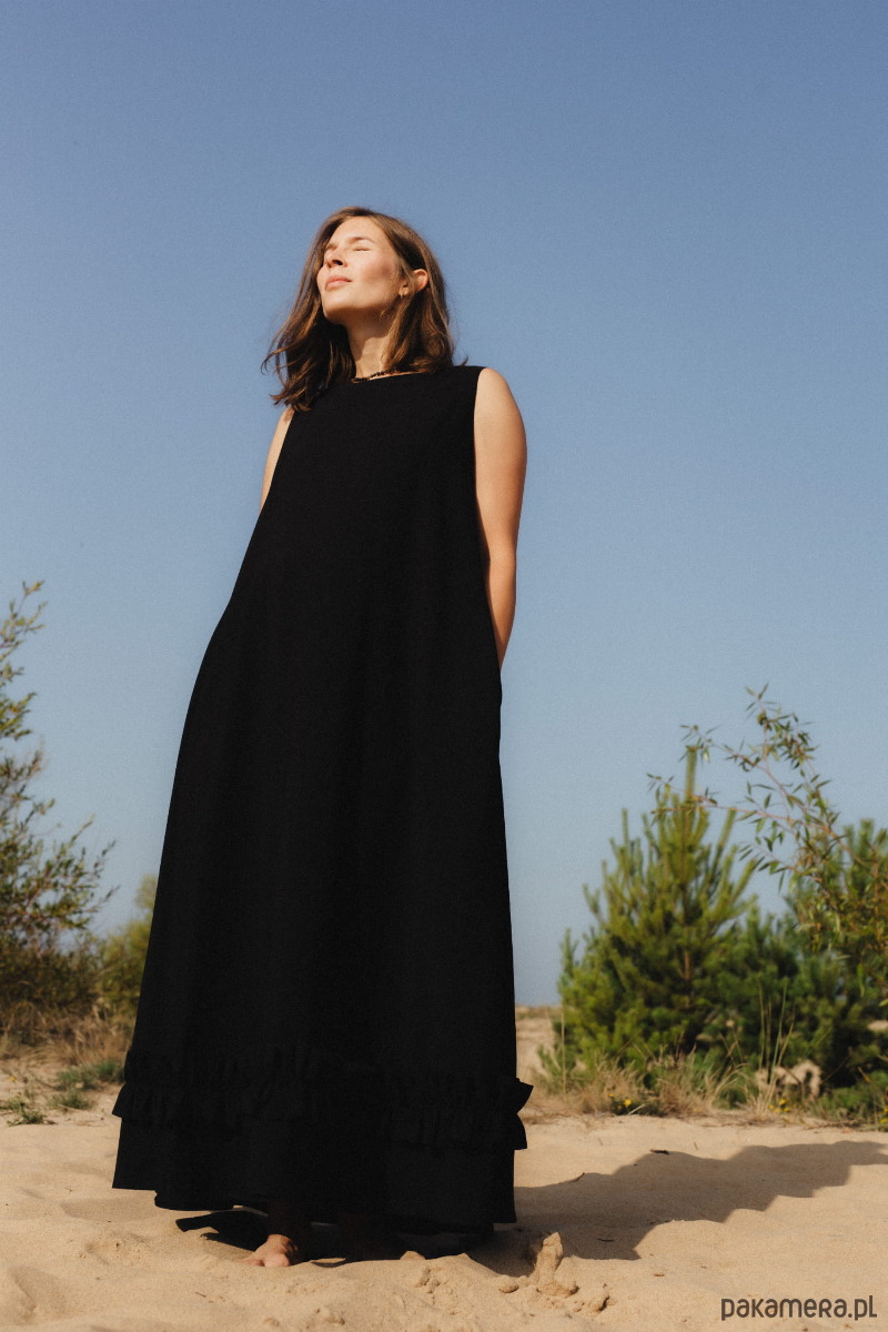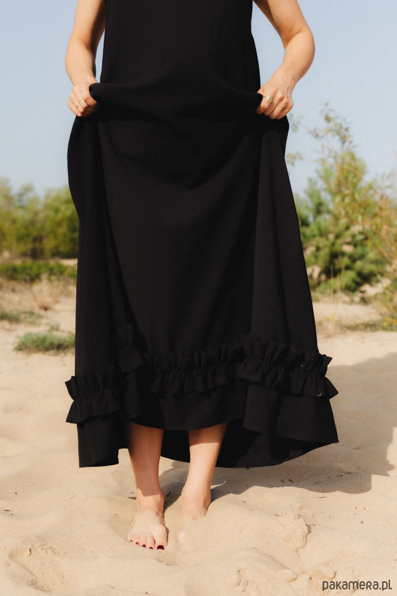 długa prosta sukienka, z efektownym wykończeniem falbaną u dołu.