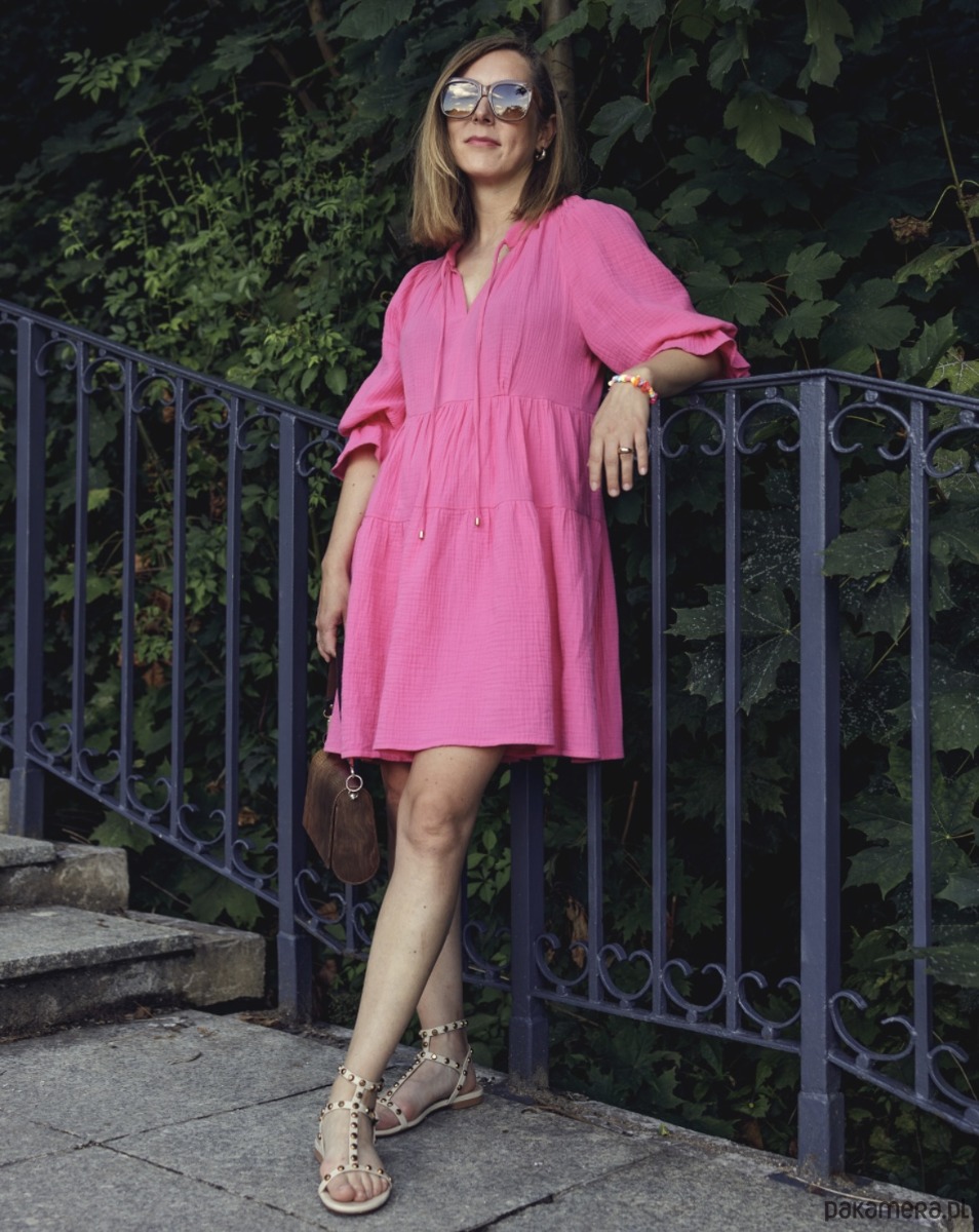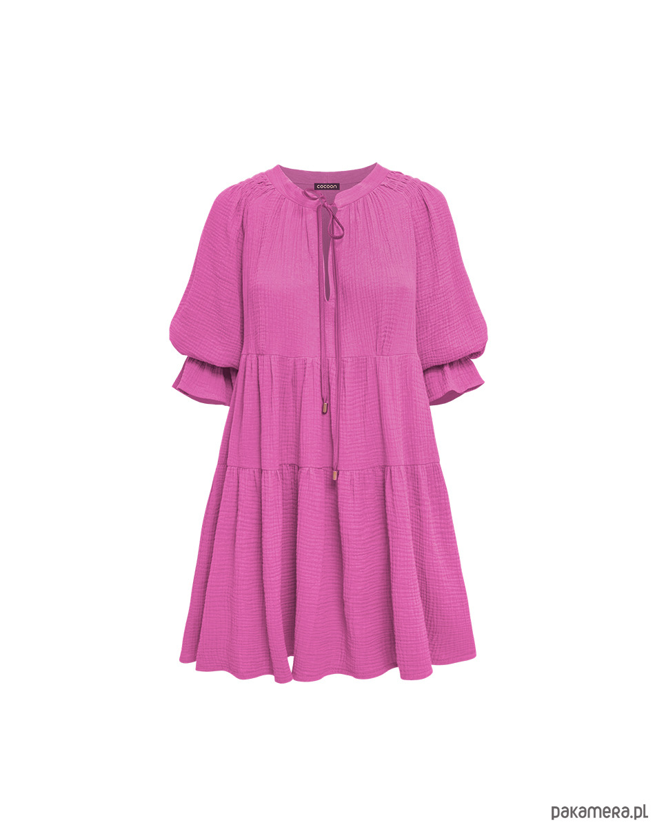 Bawełniana sukienka z muślinu z lekko bufiastymi rękawami i falbanami. Tkanina przewiewna idealnie sprawdzi się na lato. Dekolt ze stójką wiązany na sznurki. Długość MINI. Na zdjęciu Ula (167cm wzrostu) ma na sobie rozmiar S.