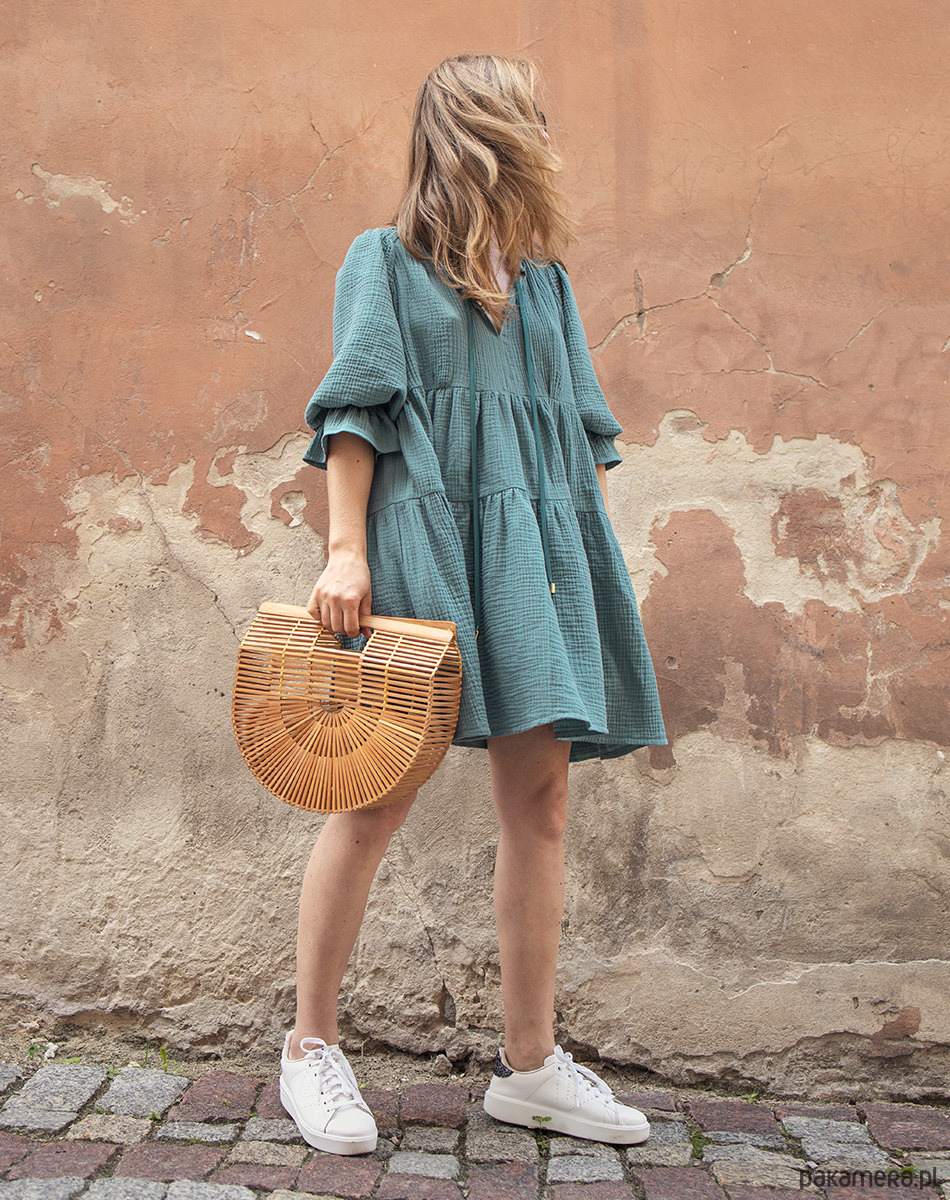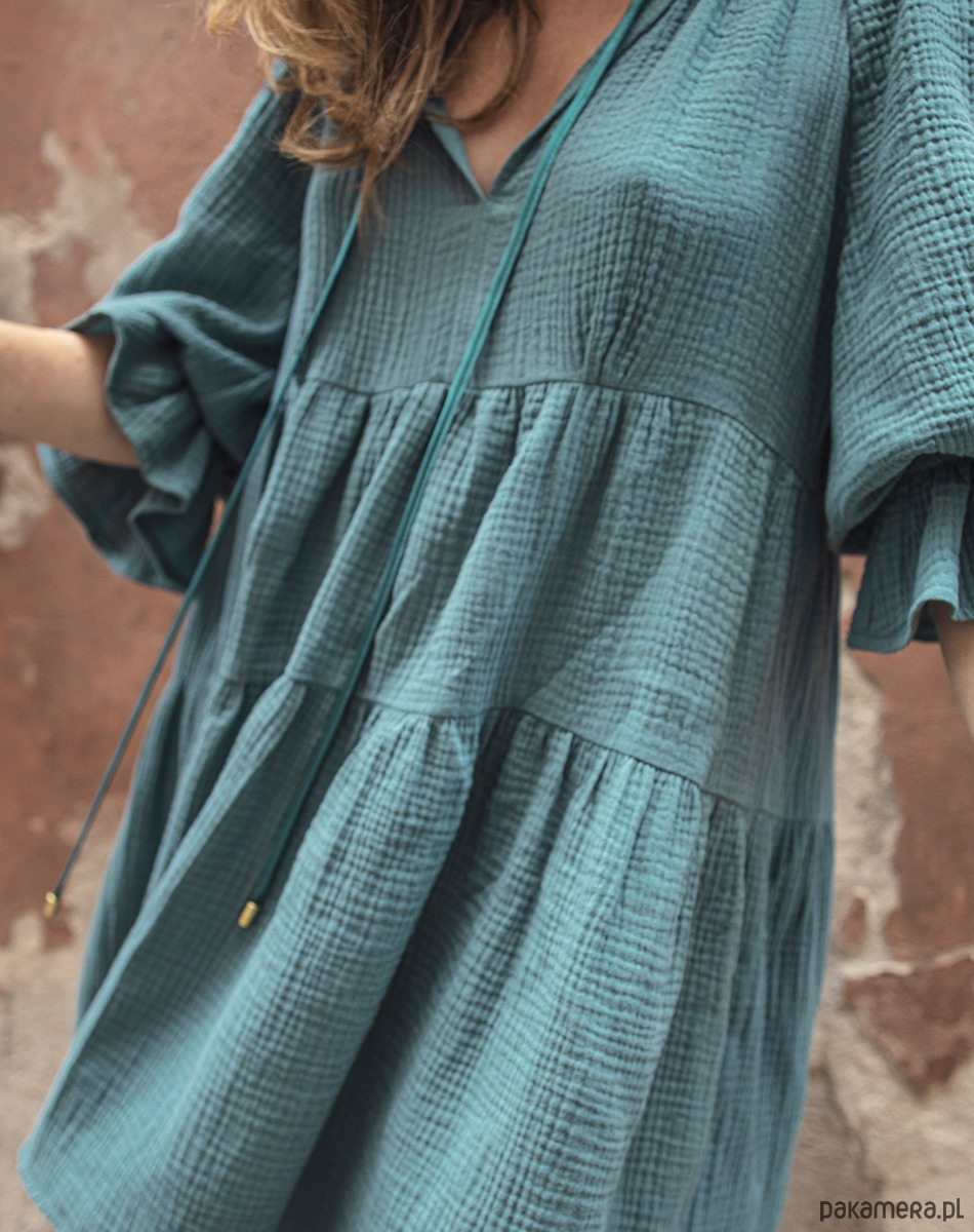 Bawełniana sukienka z muślinu z lekko bufiastymi rękawami i falbanami. Tkanina przewiewna idealnie sprawdzi się na lato. Dekolt ze stójką wiązany na sznurki. Długość MINI. Na zdjęciu Ula (167cm wzrostu) ma na sobie rozmiar S.