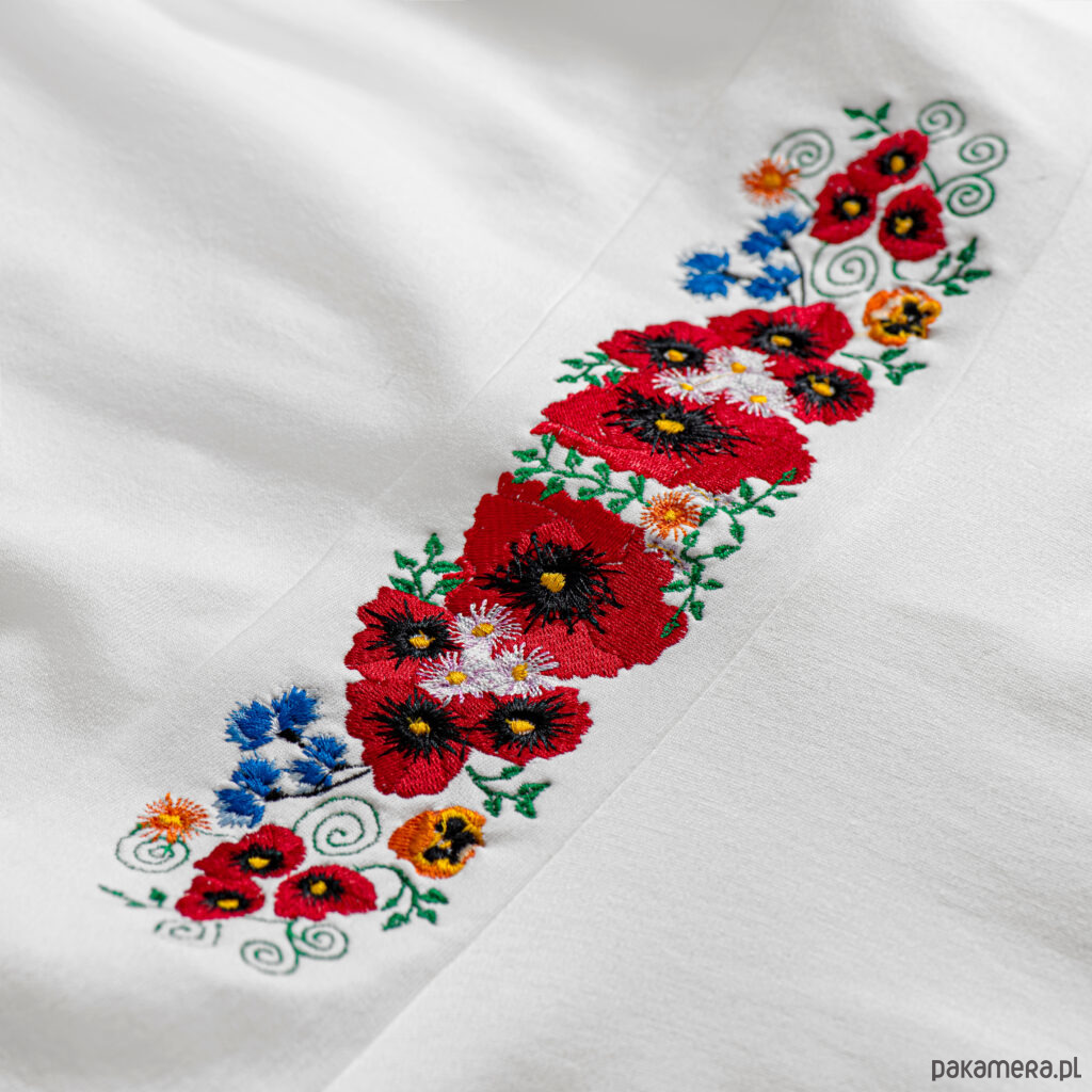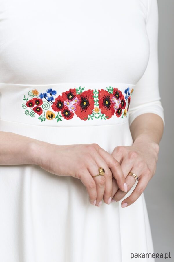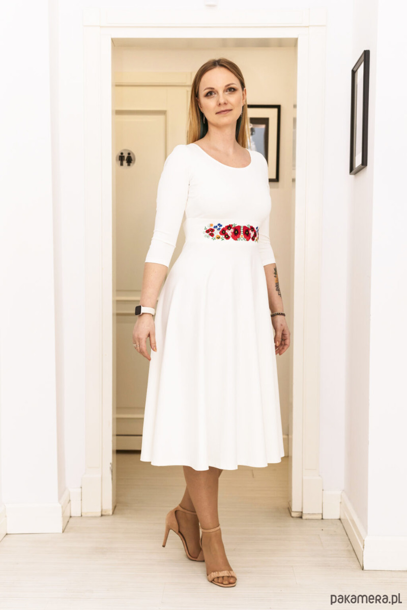 Kremowa, klasyczna i rozkloszowana sukienka o długości midi z pięknym kwiatowym haftem ludowym. Kobiecy krój w stylu lat 50-tych. Piękne połączenie świetlistego kremu i kolorowych łąkowych kwiatów, sprawi że poczujesz się w tej sukience wyjątkowo! Rozkloszowana sukienka to chętnie wybierany projekt jako sukienka na wesele, do ślubu, ale także na co dzień!