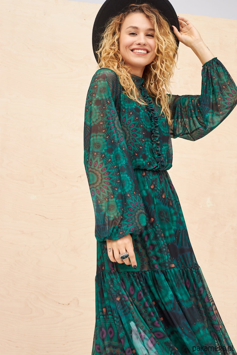 Normalnie nie wiemy, od czego zacząć... Ten kolor soczystej zieleni, połączonej z fuksją i delikatną brzoskwinią tu i ówdzie jest boski. MANDALA (oprócz mandali) ma też stójkę i żabocik z przodu. Z tyłu natomiast plecy zostawiłyśmy otwarte i ozdobiłyśmy tę łezkę dookoła piękną koronką. Gumka w talii sprawia, że nic Cię tam nie uciska. Szerokie rękawy zakończone są na dole gumeczką, co powoduje, że tworzy się tam lekka bufka. Sukienka jest na dole odcinana i kończy się falbanką. A w komplecie do niej jest, naturalnie, wiskozowo-elastanowa halka.